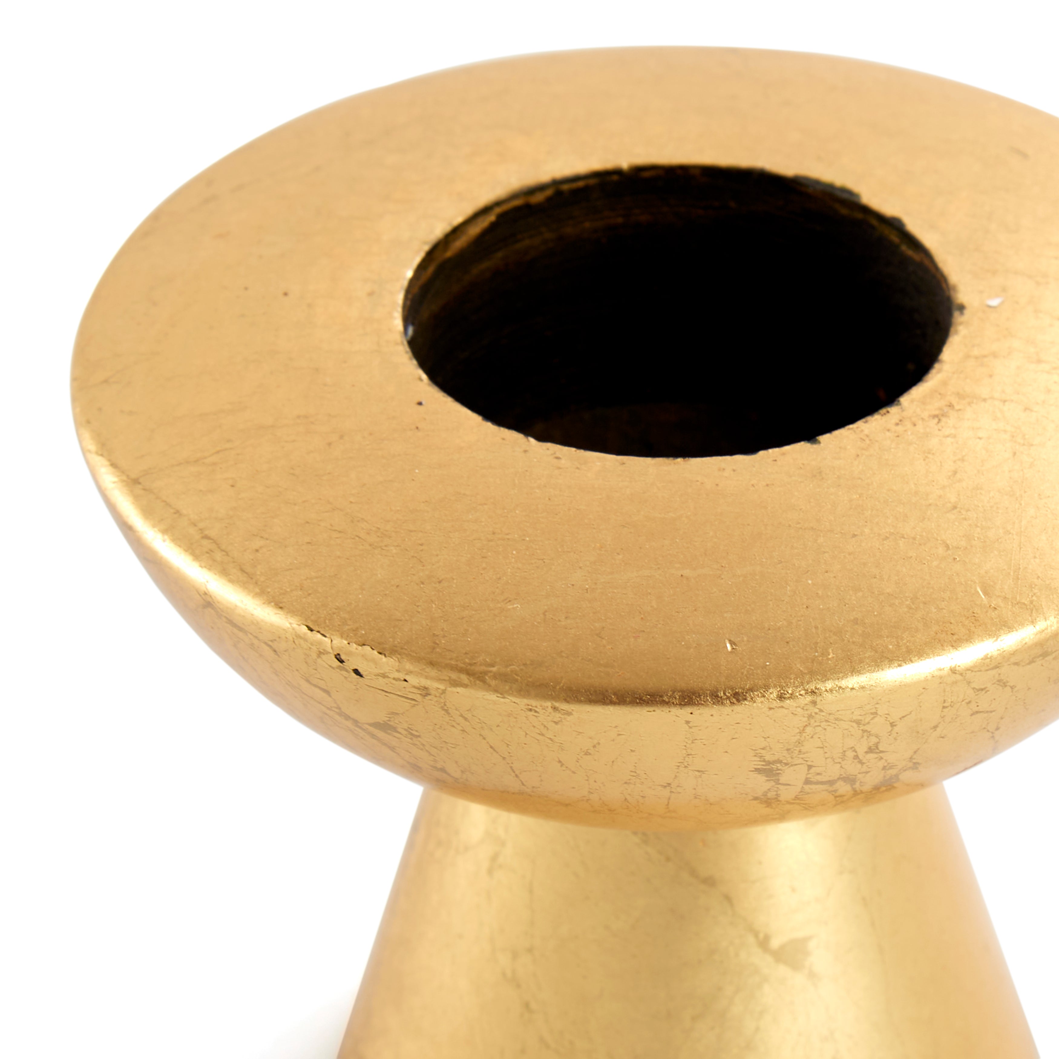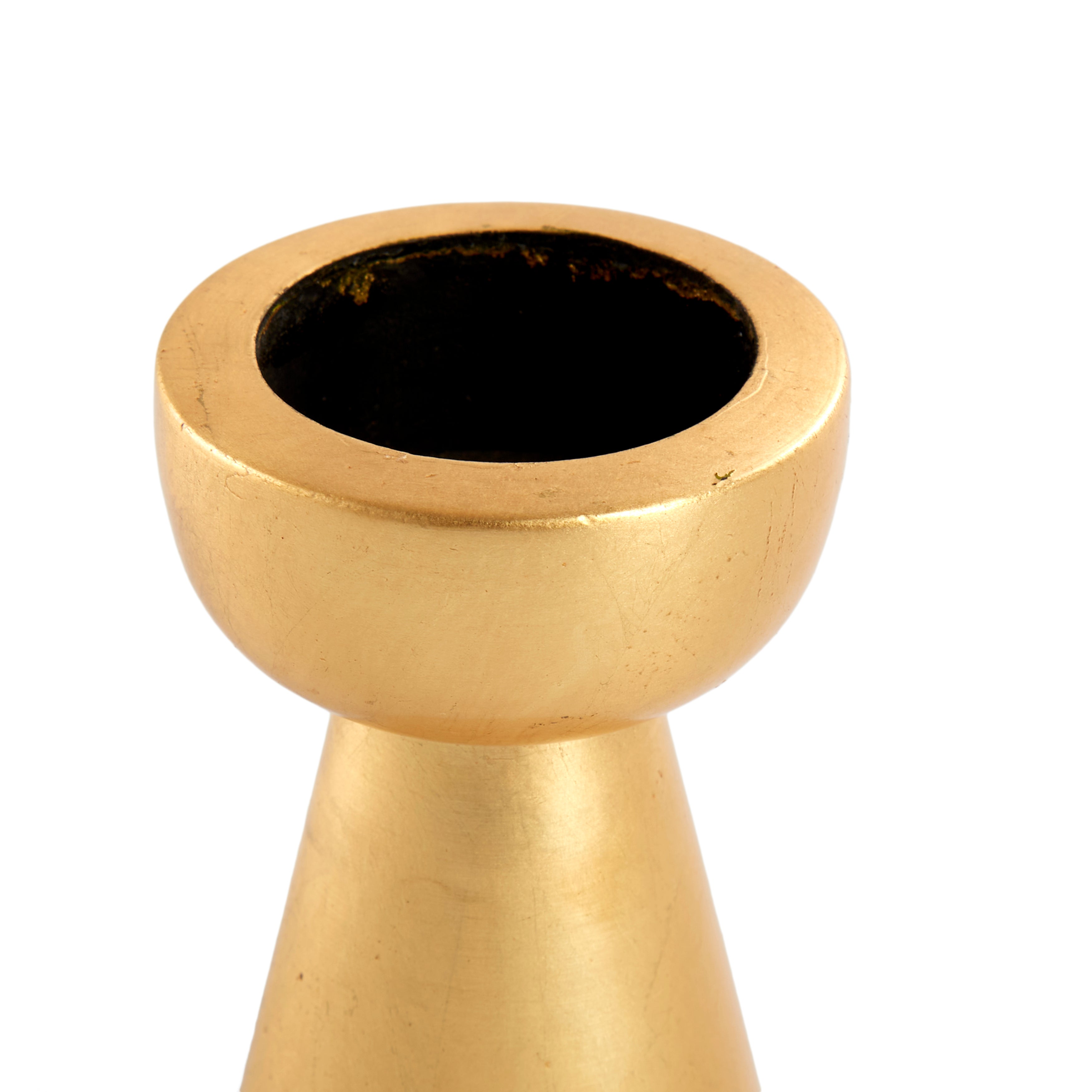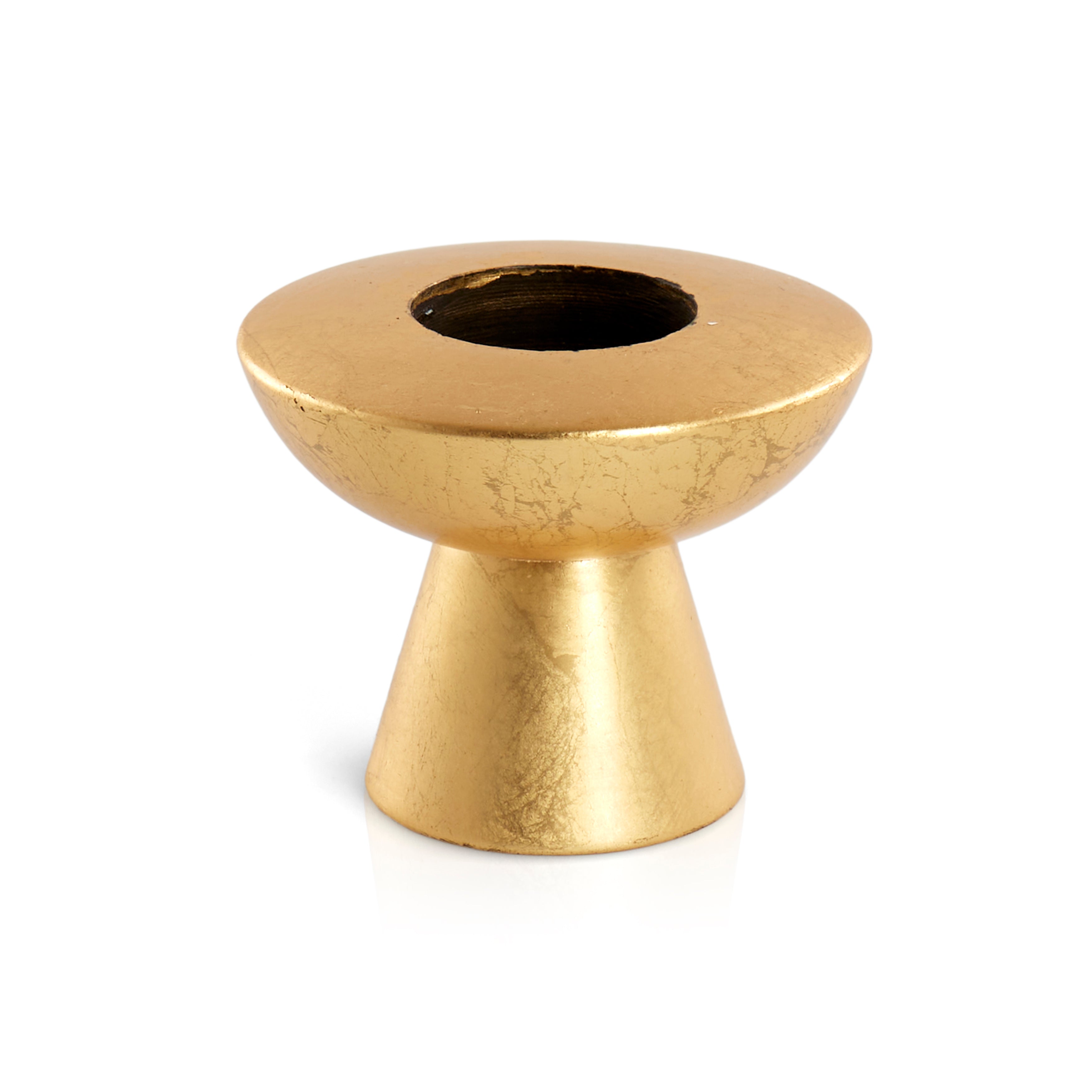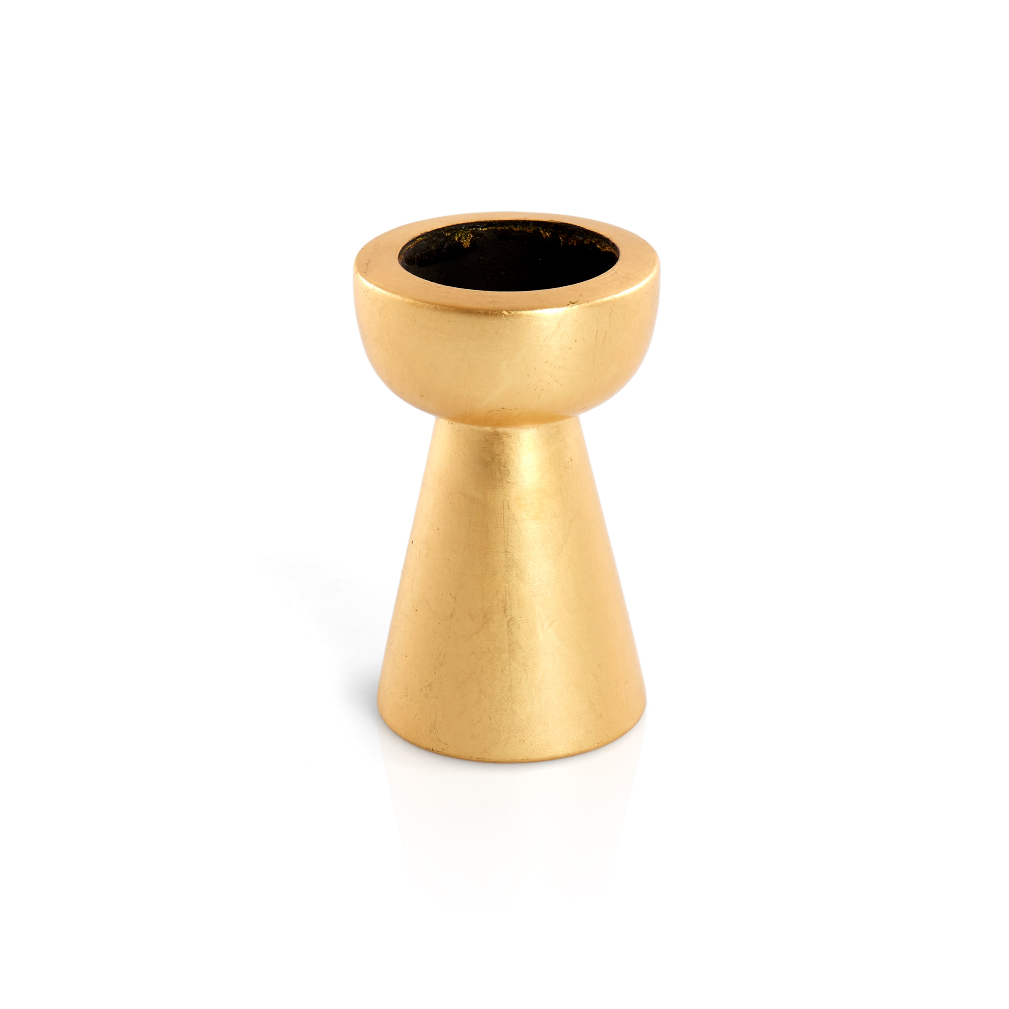 Details: Gold painted tapered candle stick holder, wide top Dimensions: 3" H x 3" D Matching pair available. Item Number - 41571