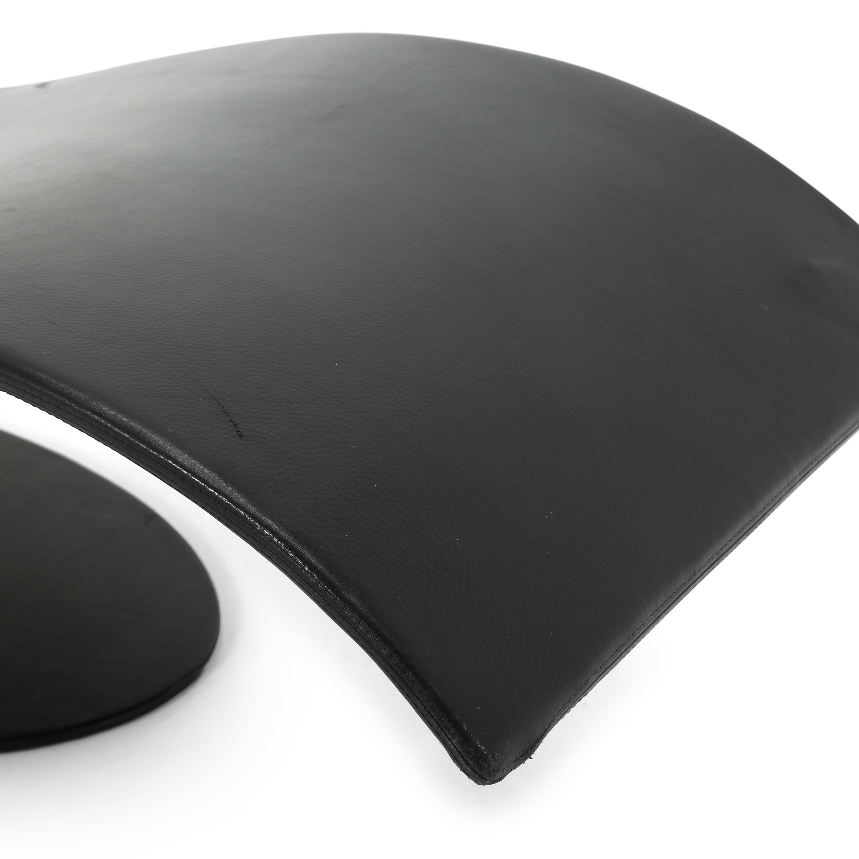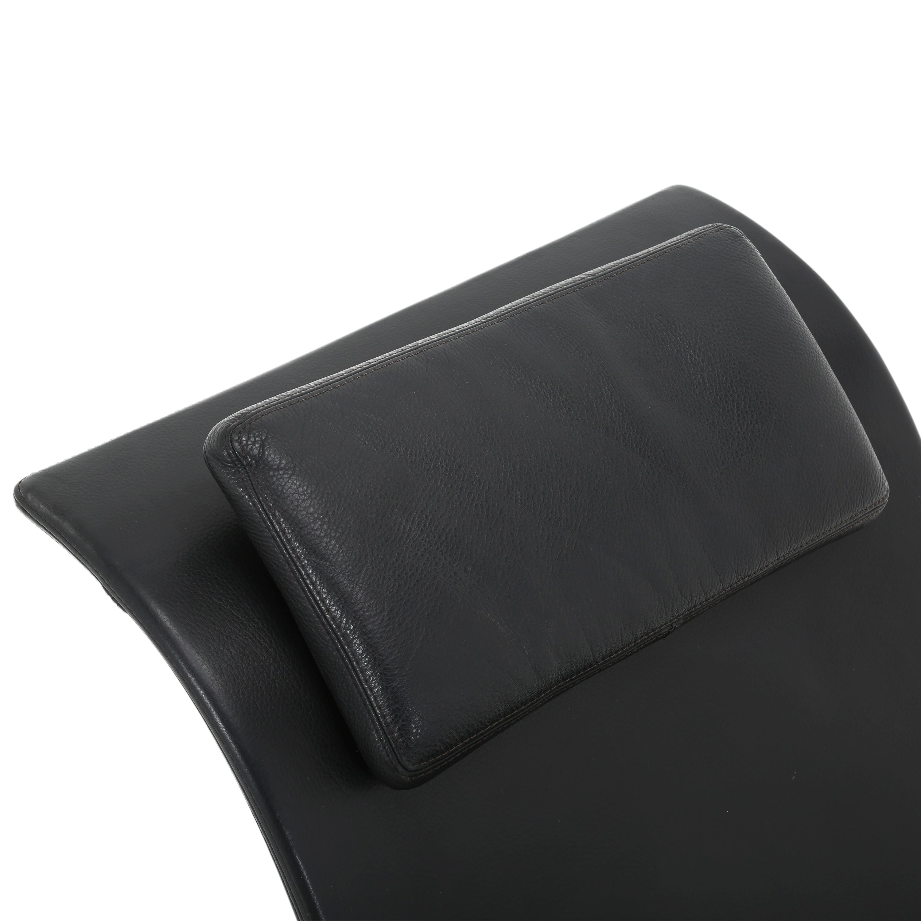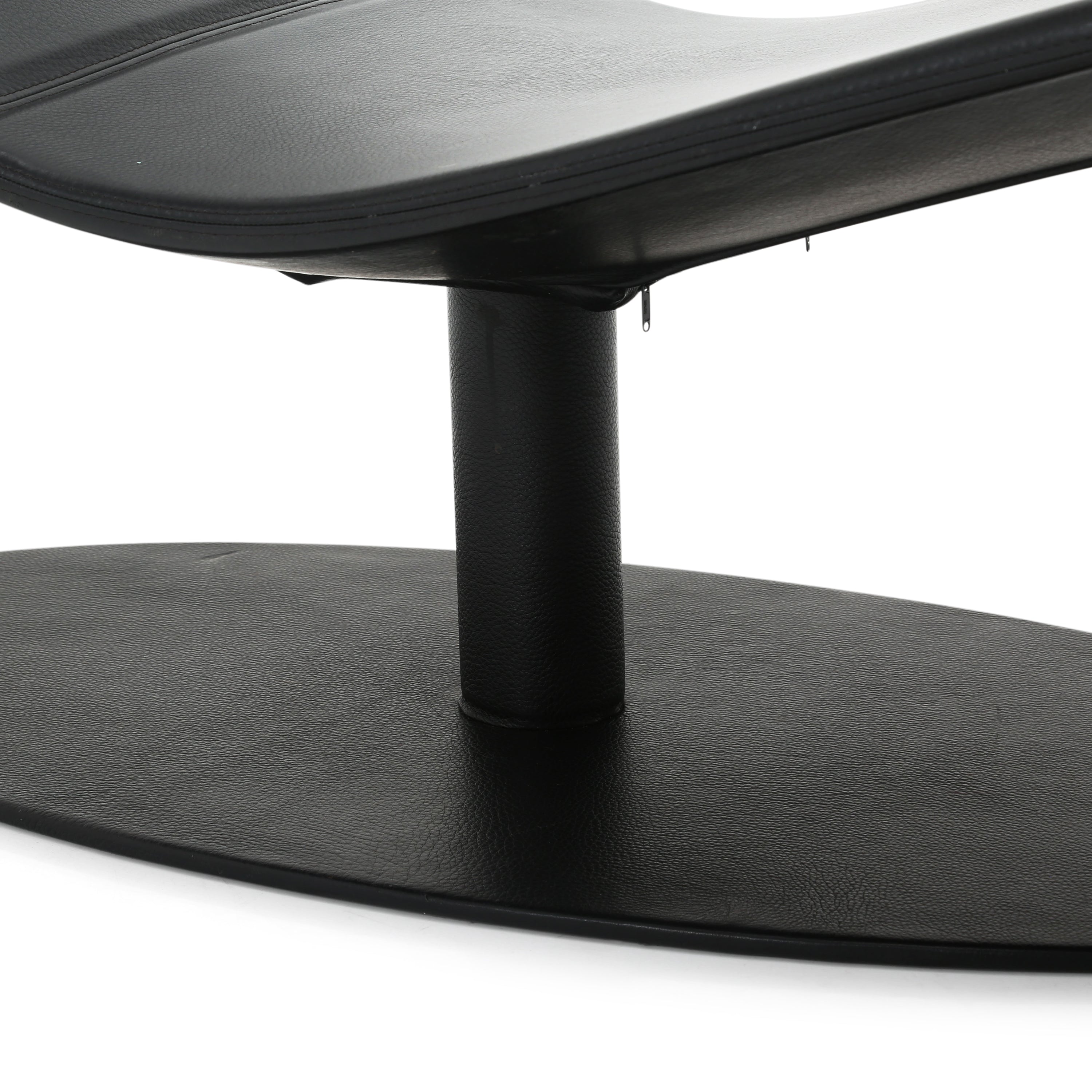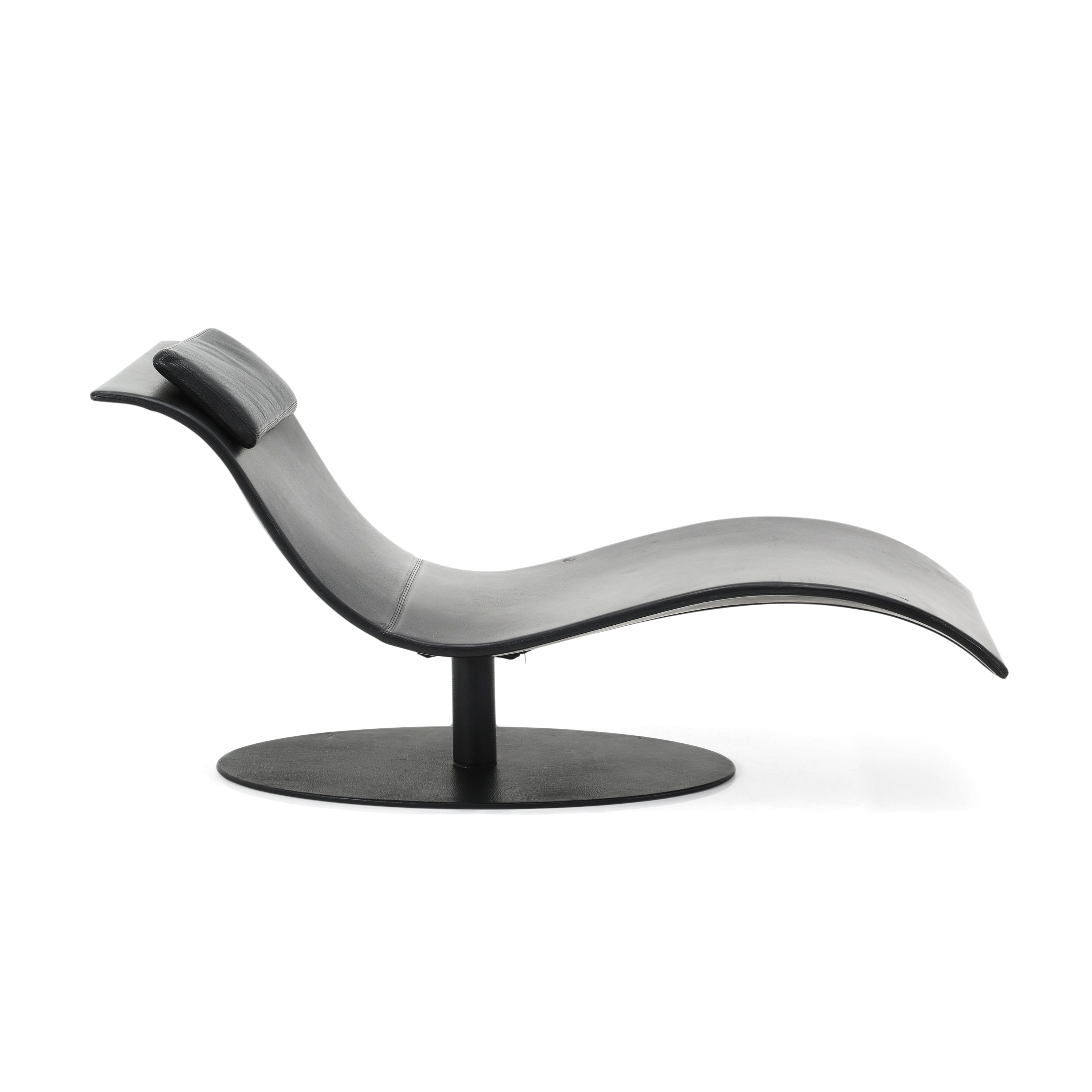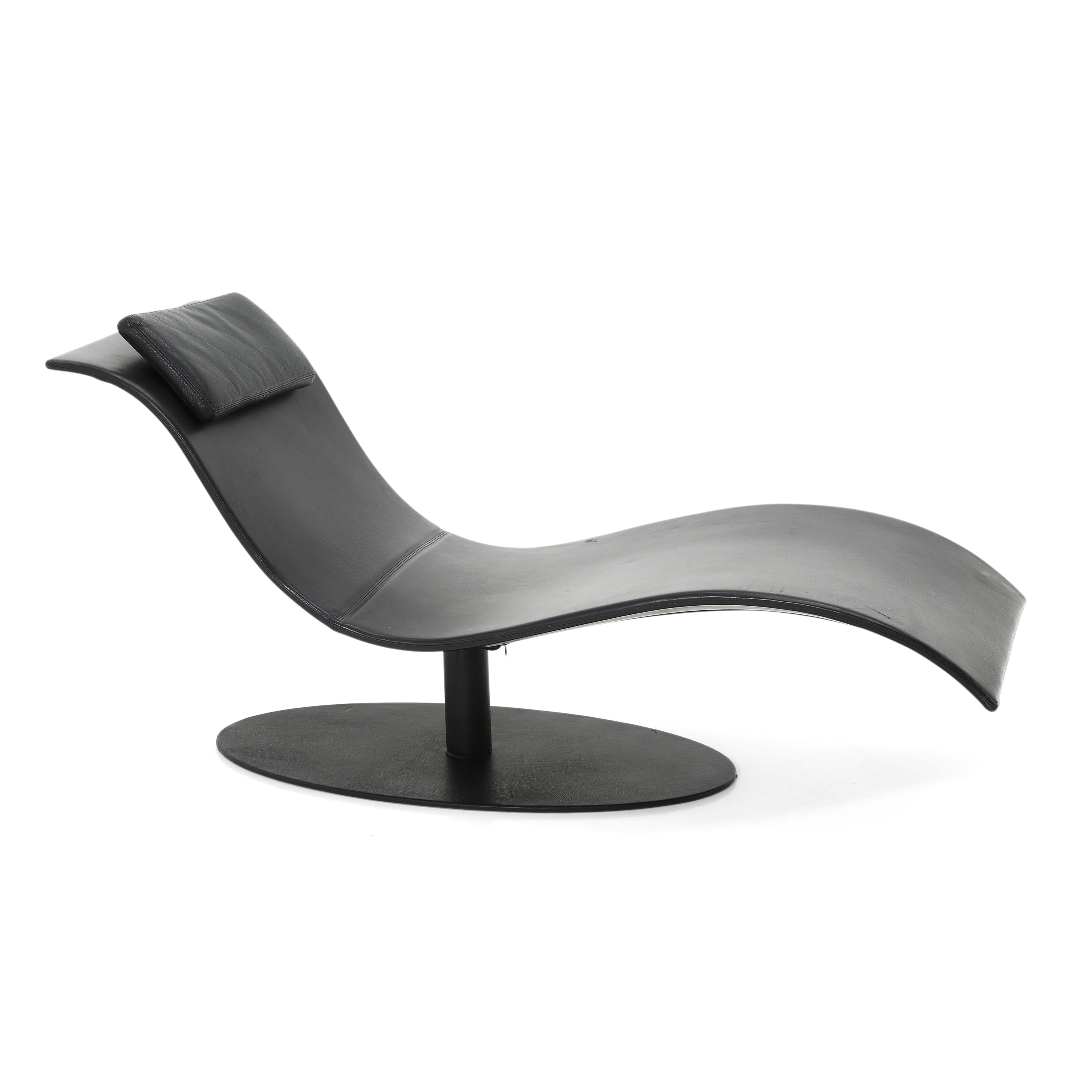 Details: Sleek black leather chaise with wavy silhouette and oval base. Dimensions: 32" H x 64" W x 24" D