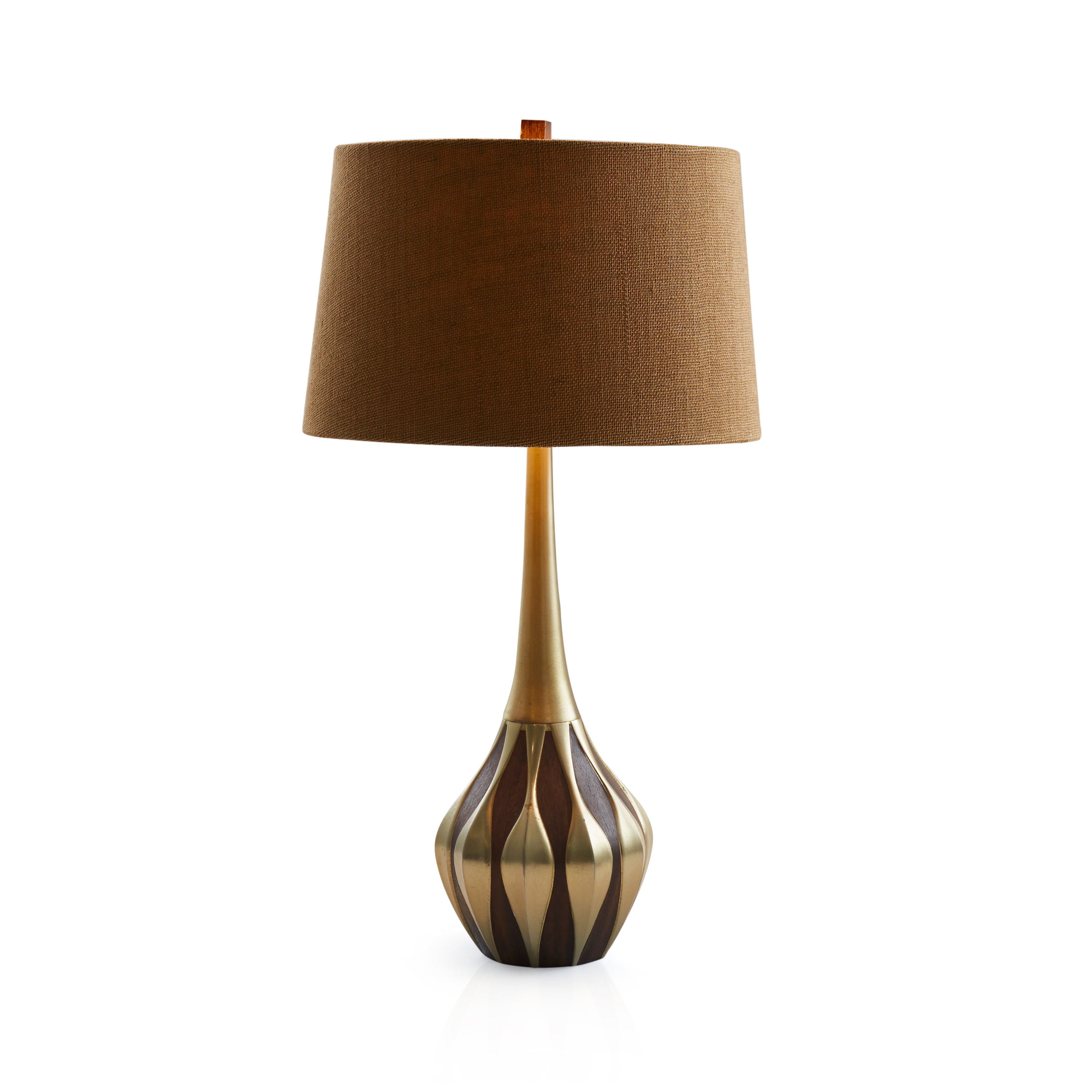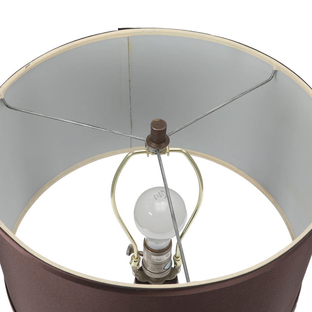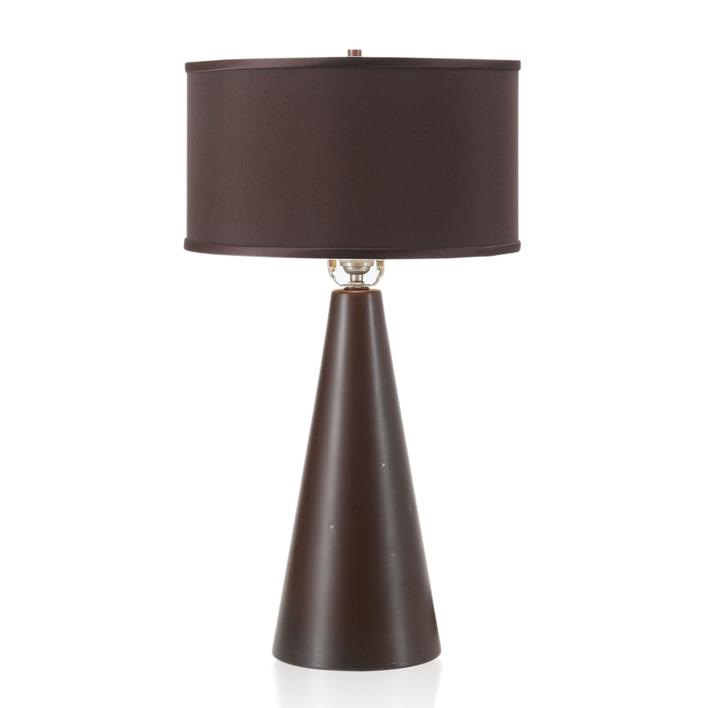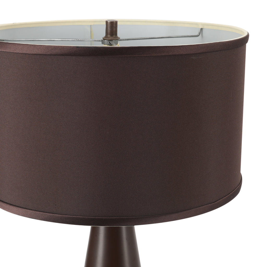 Details: Brown metal lamp with matching shade with round "puddle" base. Molten chocolate "pouring" from shade to form base.