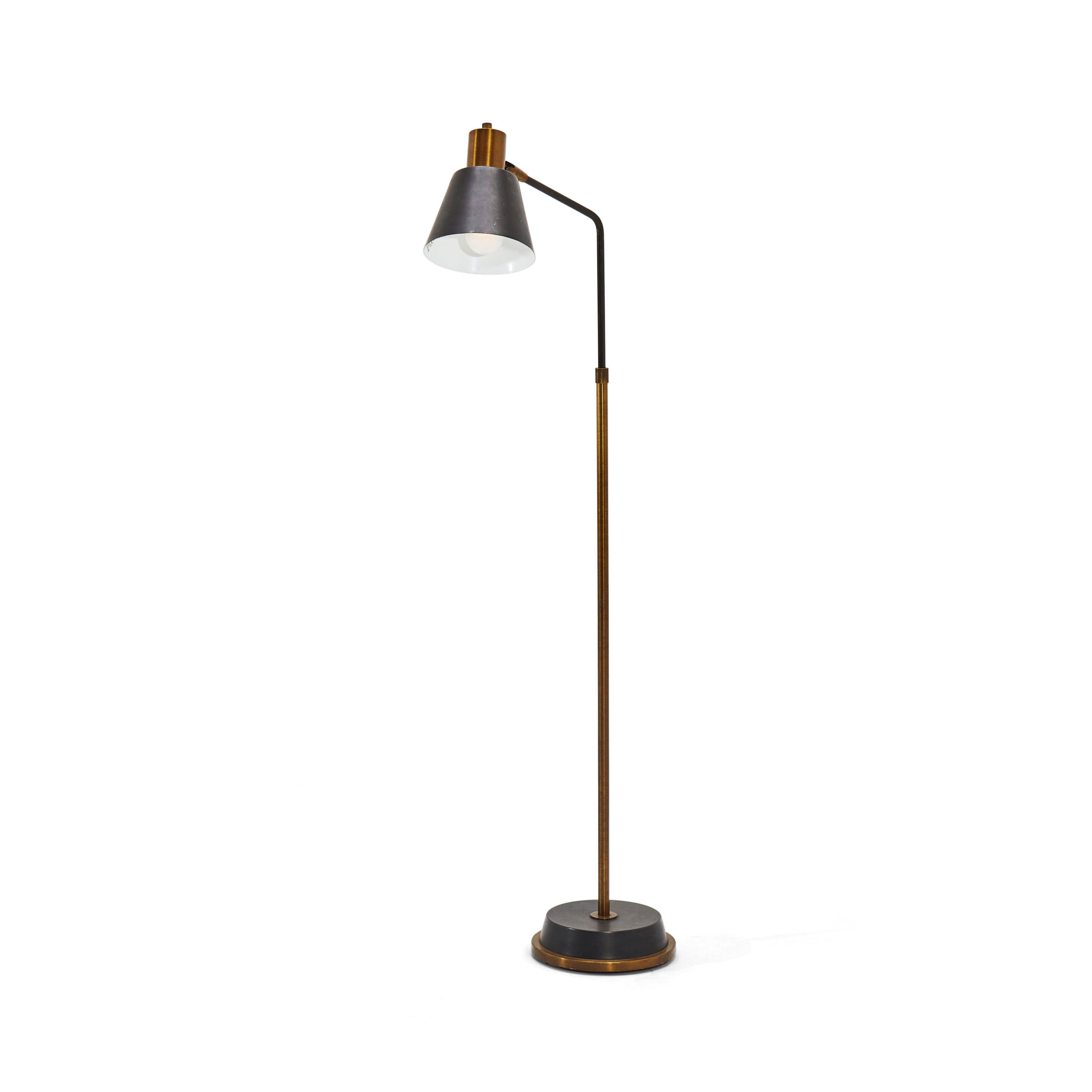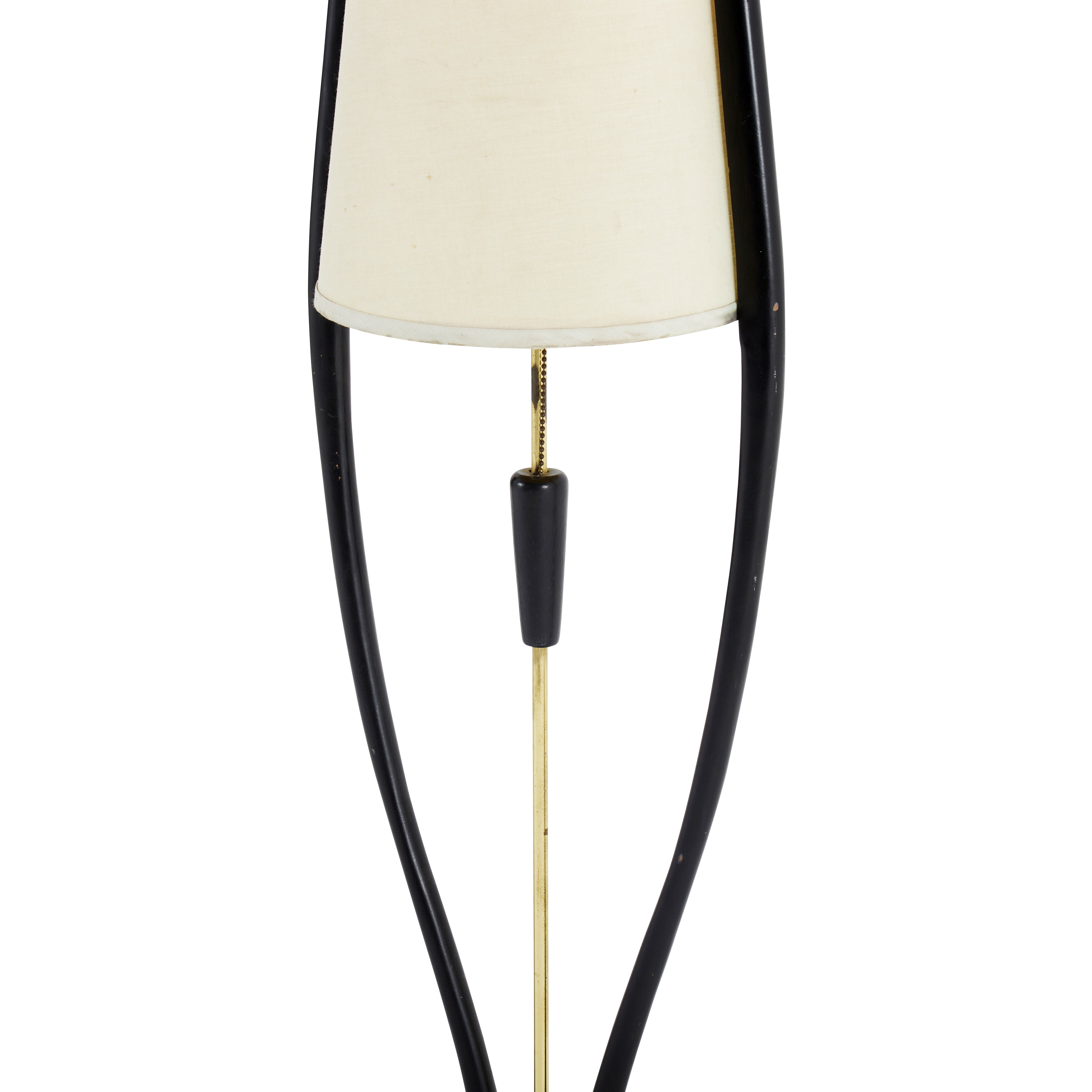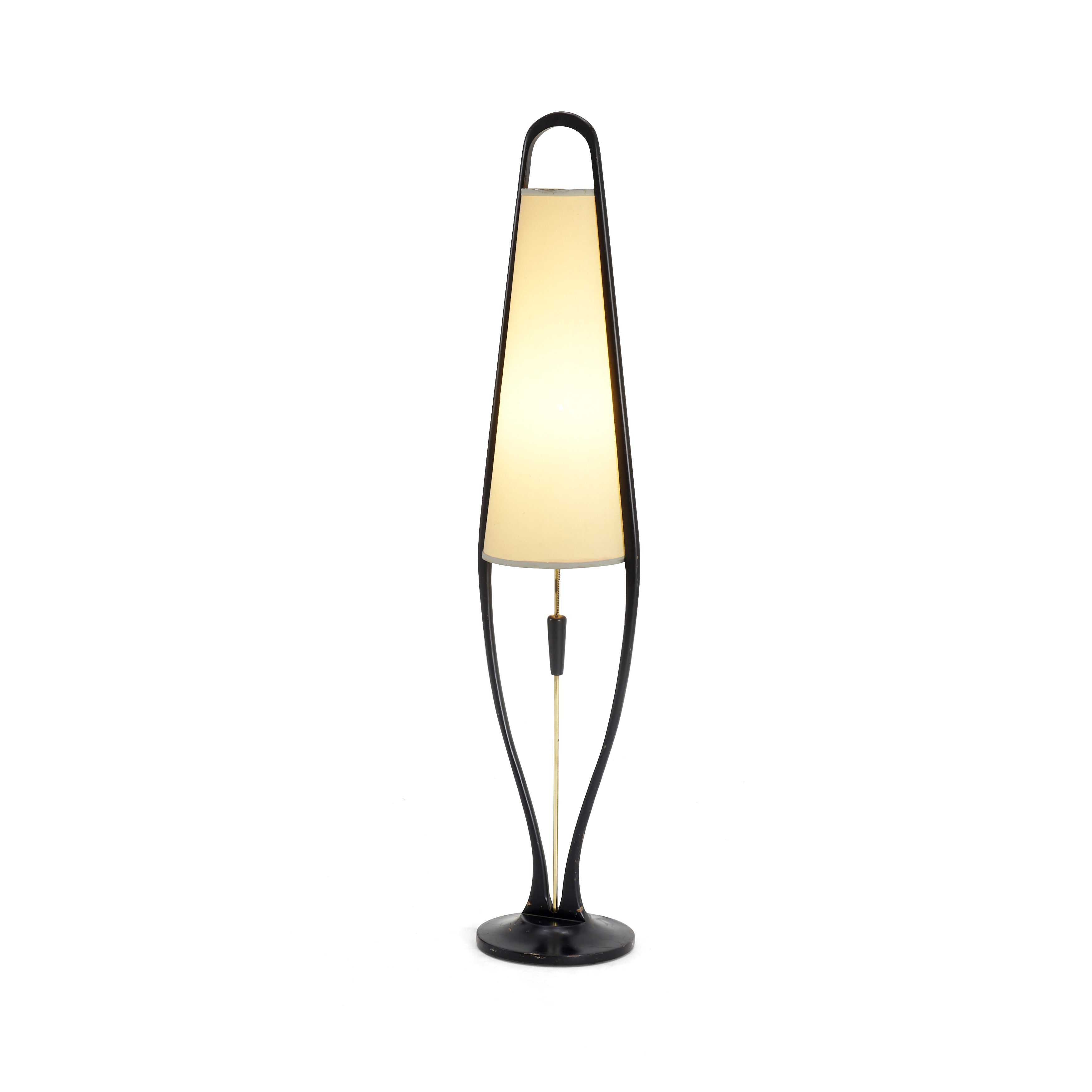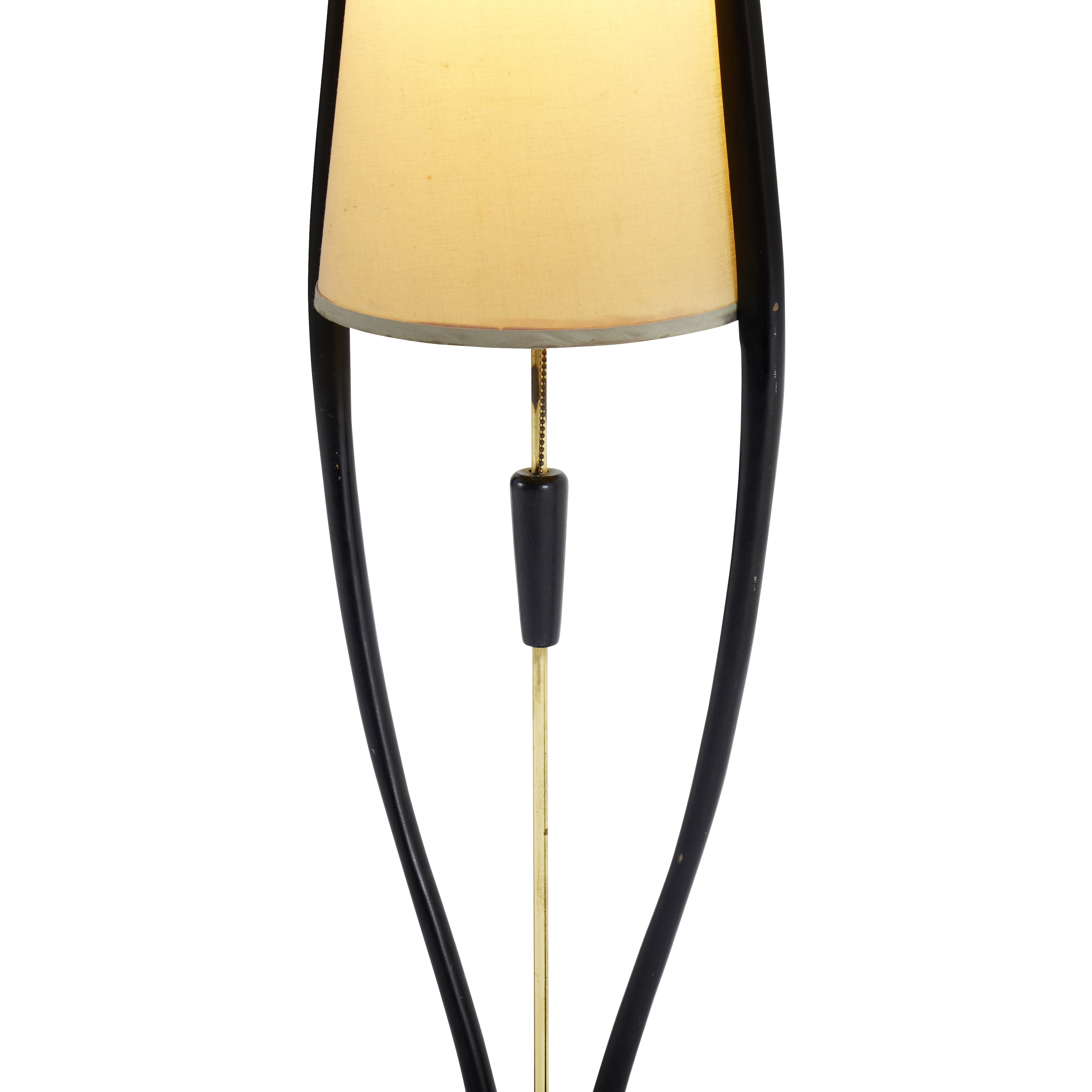 Details: Black oval cutout frame mid-century floor lamp with long cream fabric shade on metal pole and round base NOTICEABLE WEAR (RENTED AS IS) Dimensions: 59"...