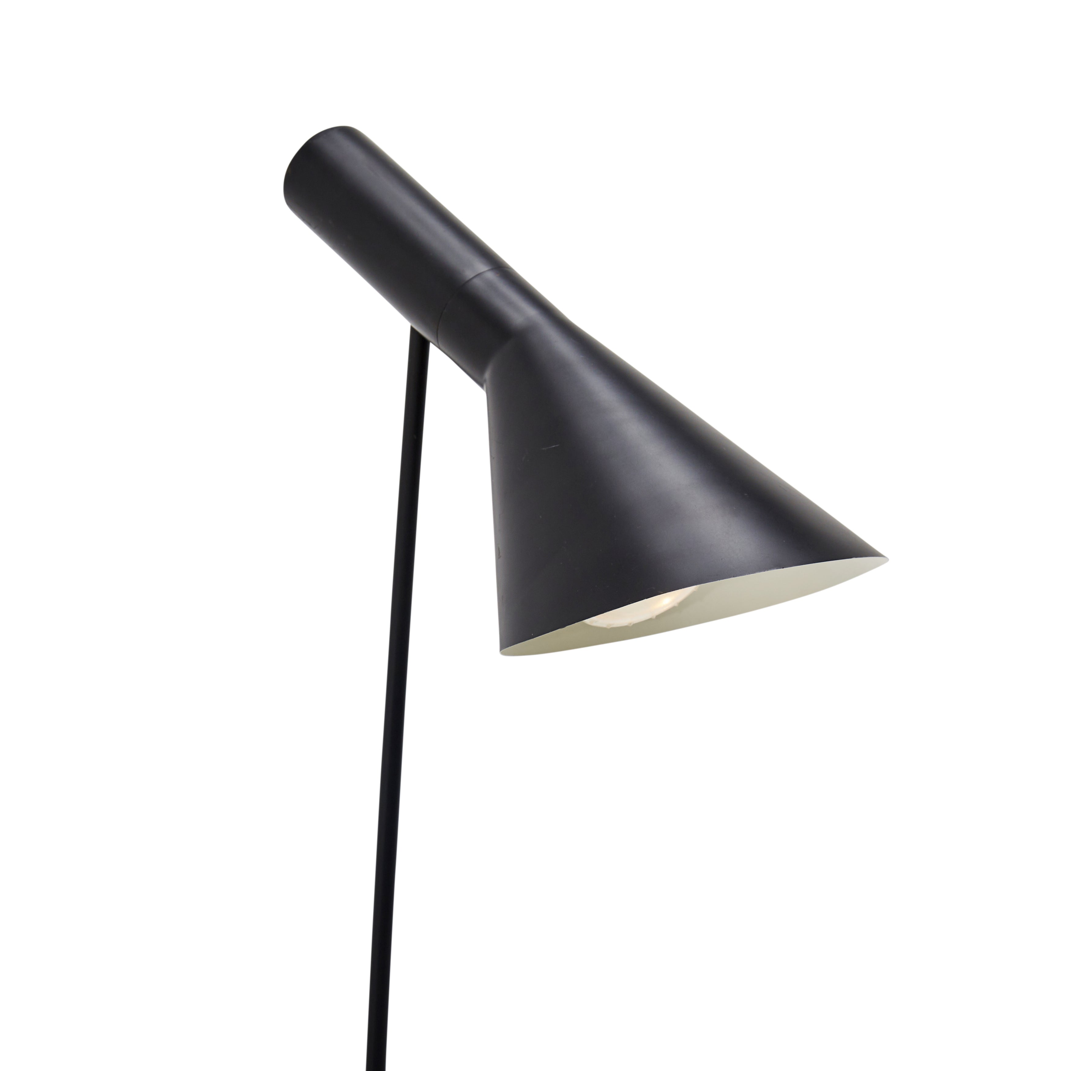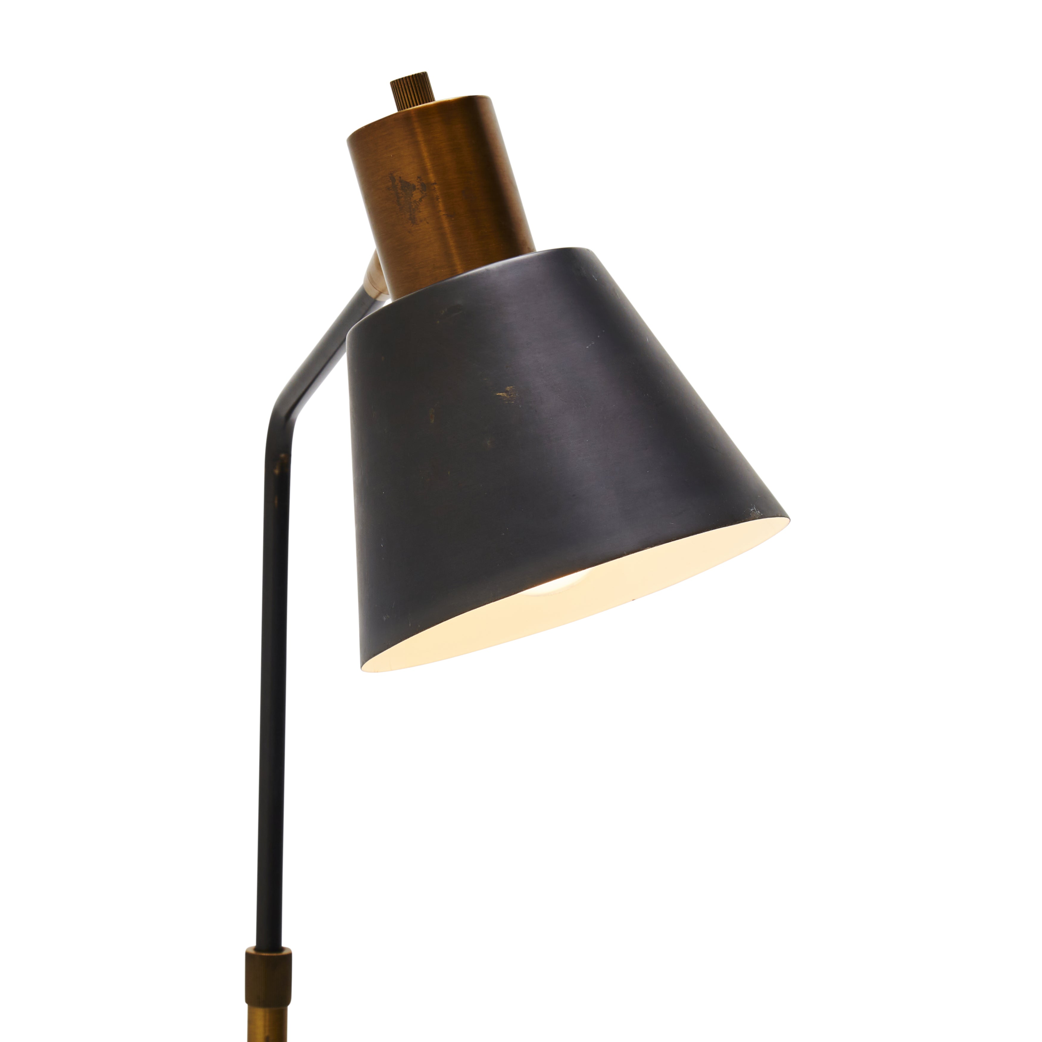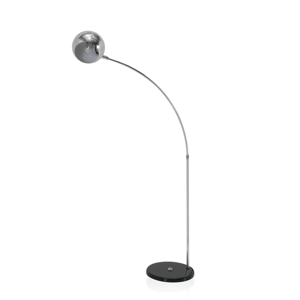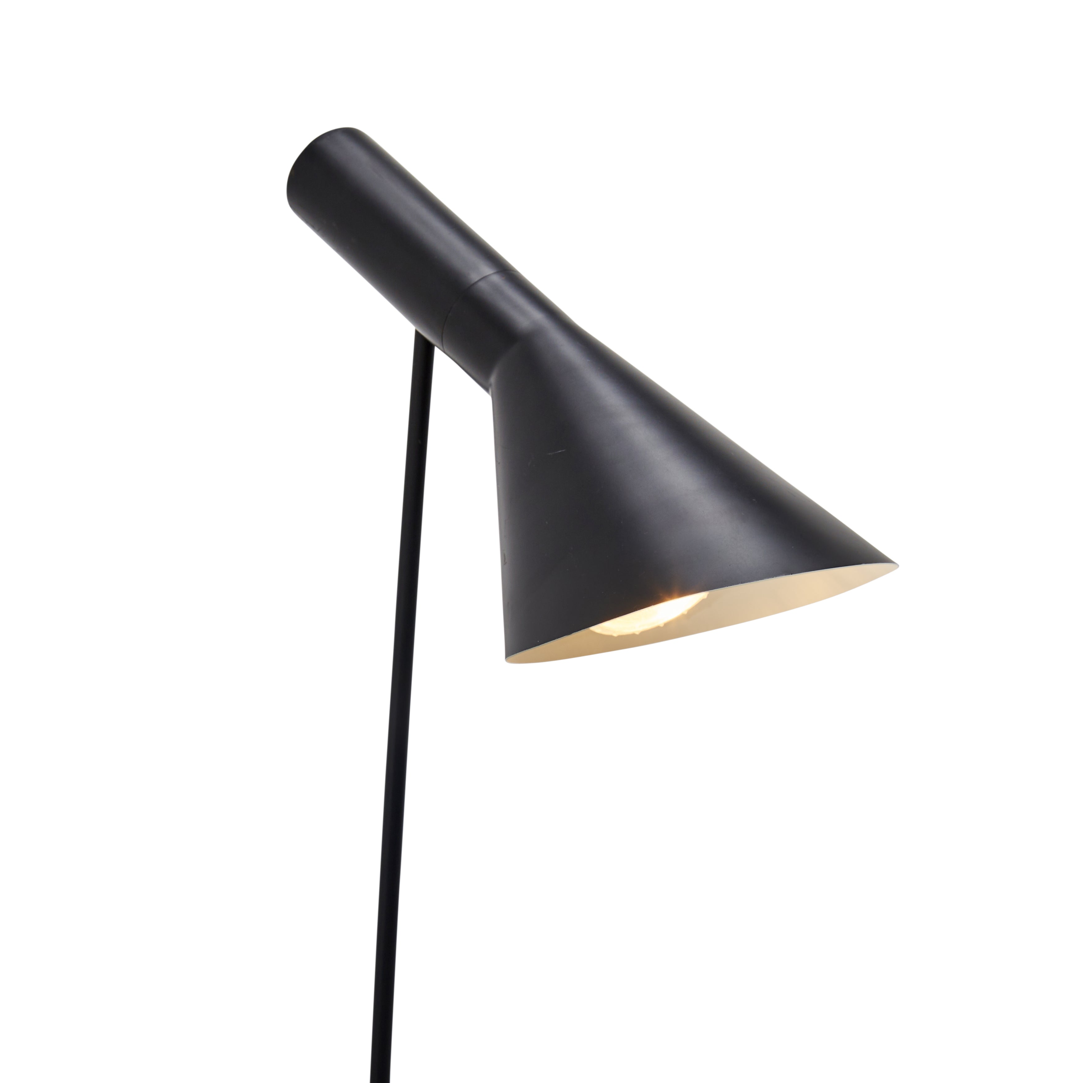 Details: Black oval cutout frame mid-century floor lamp with long cream fabric shade on metal pole and round base NOTICEABLE WEAR (RENTED AS IS) Dimensions: 59"...