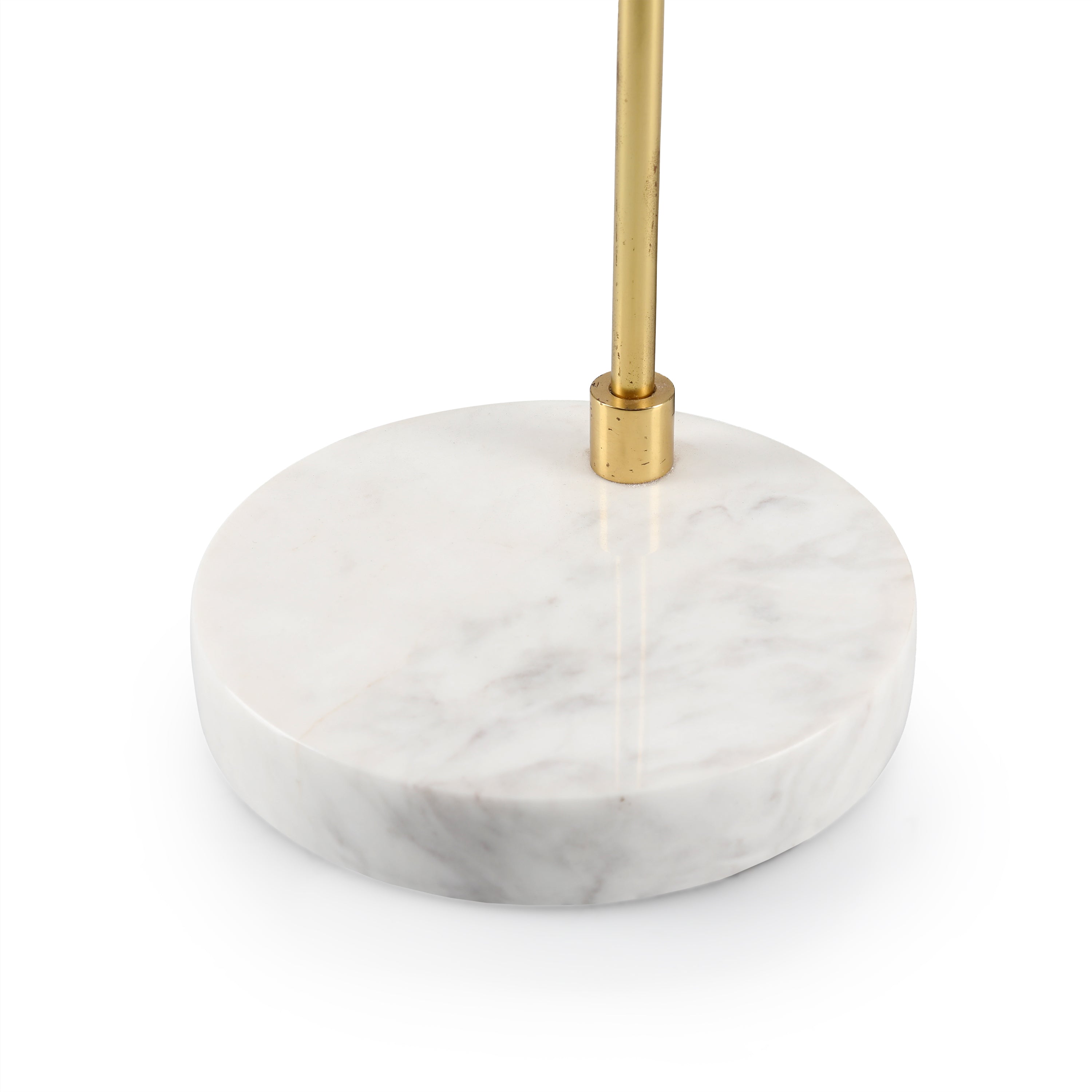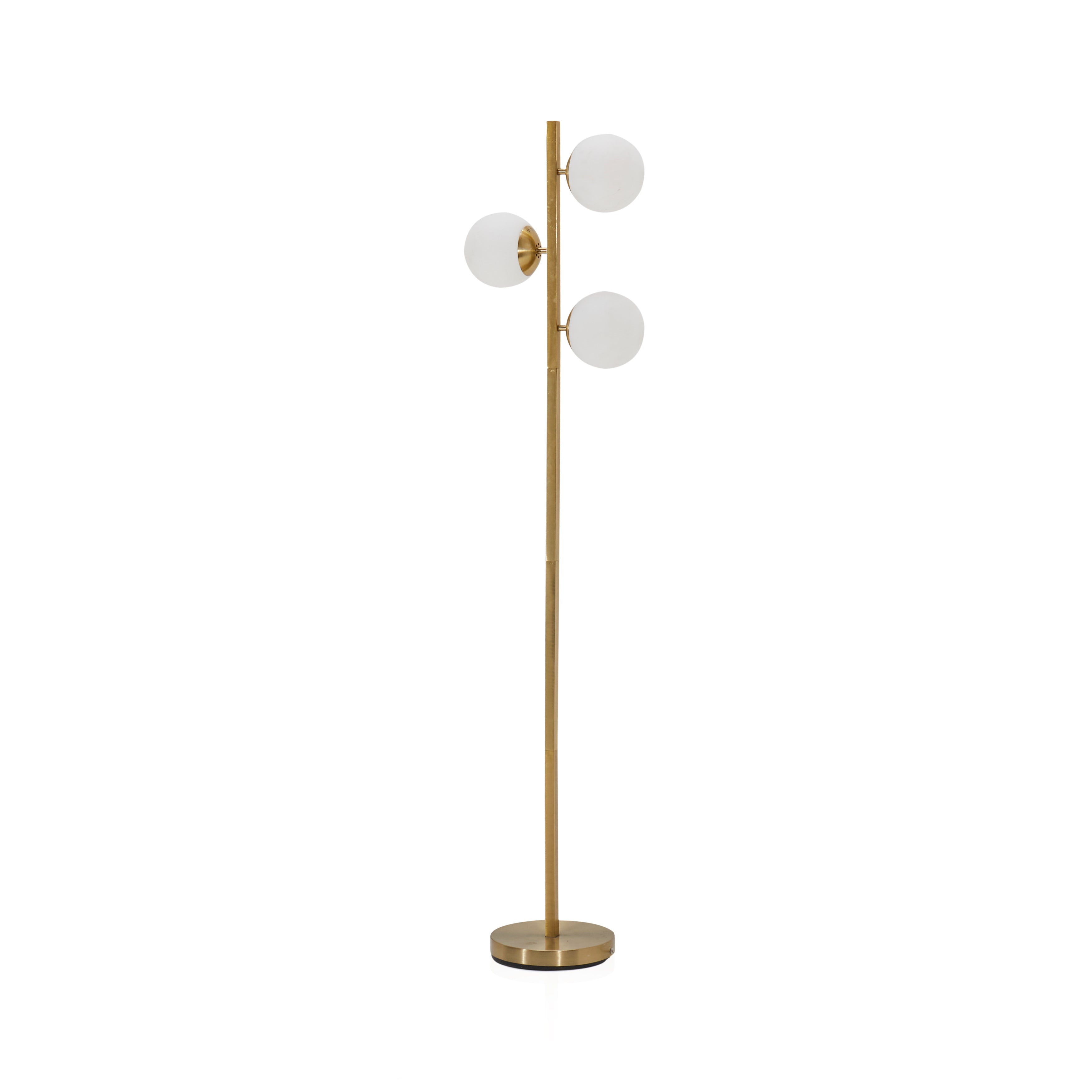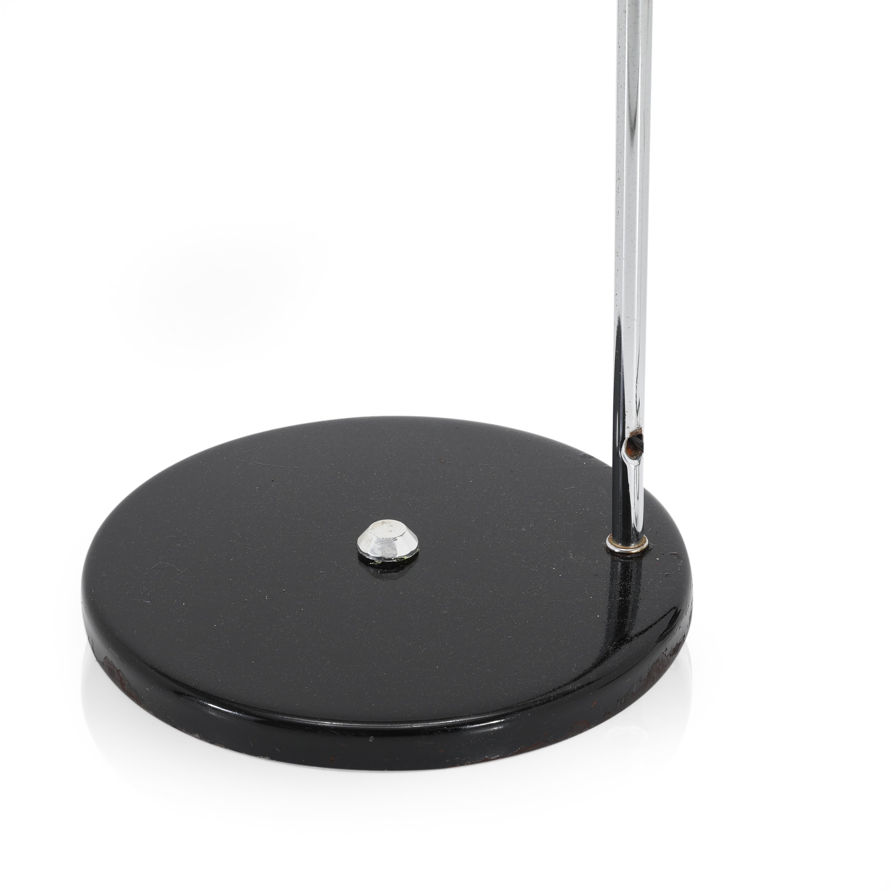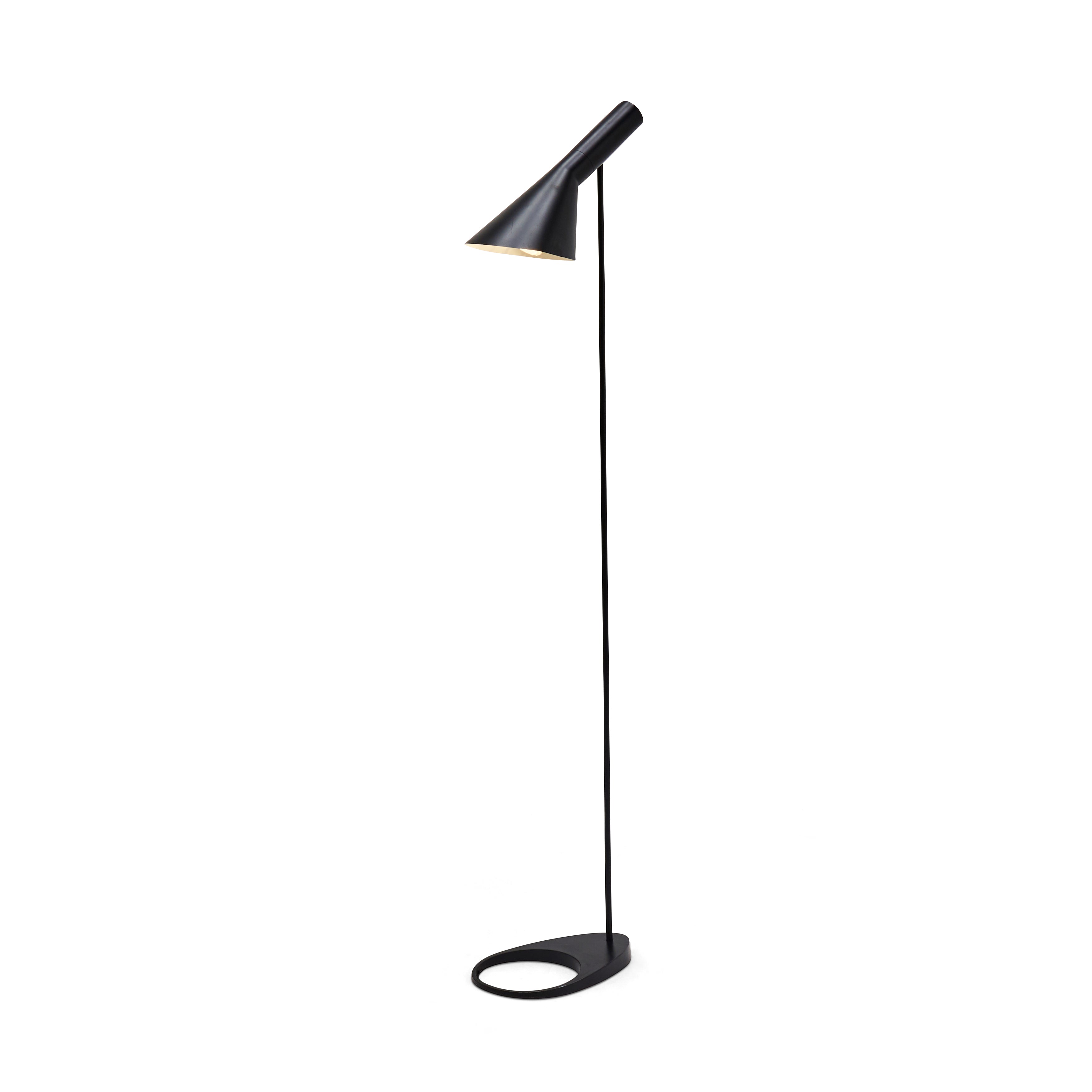 Details: Black oval cutout frame mid-century floor lamp with long cream fabric shade on metal pole and round base NOTICEABLE WEAR (RENTED AS IS) Dimensions: 59"...