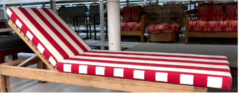 Details: Large red platform with green strips and grey upholstered removable cushion