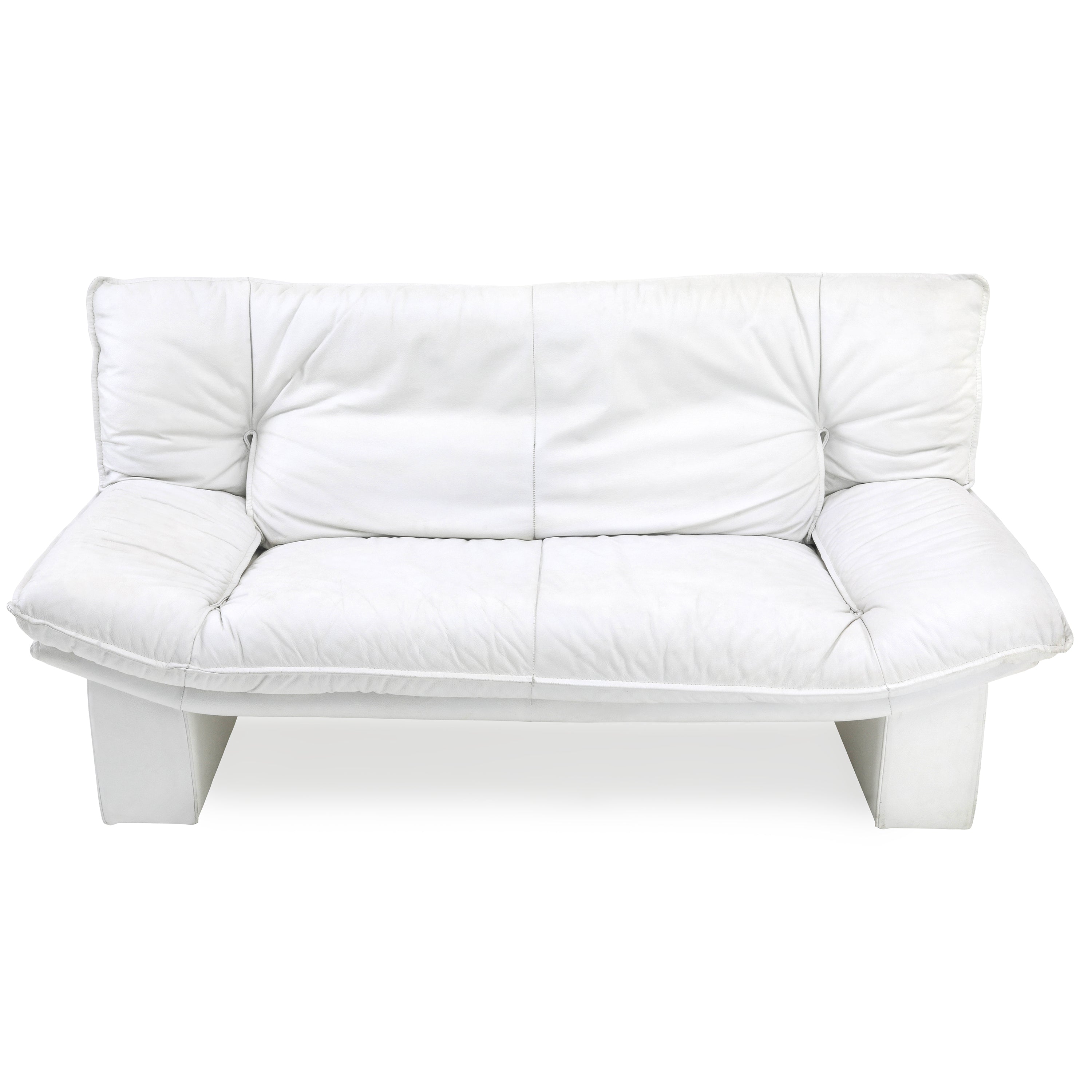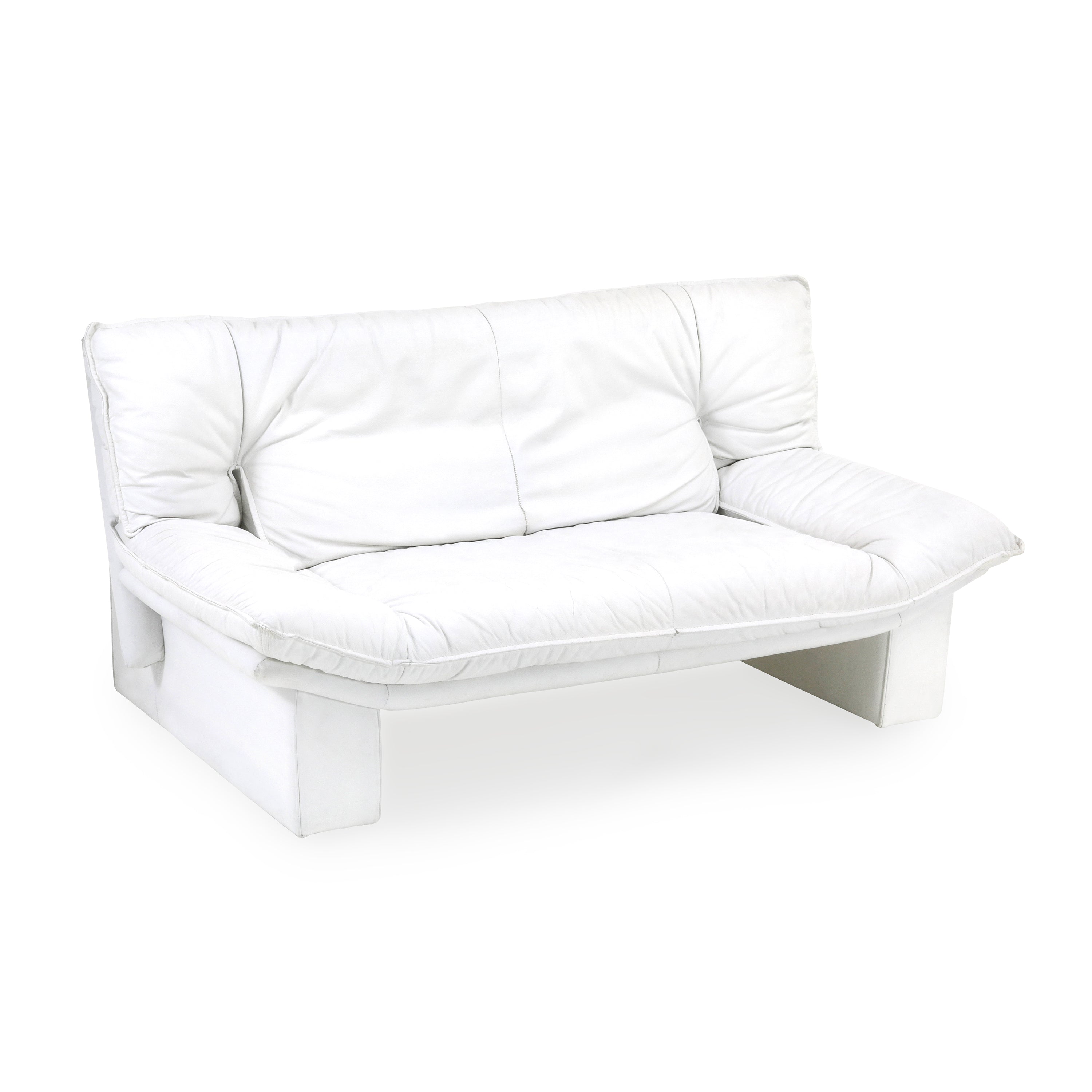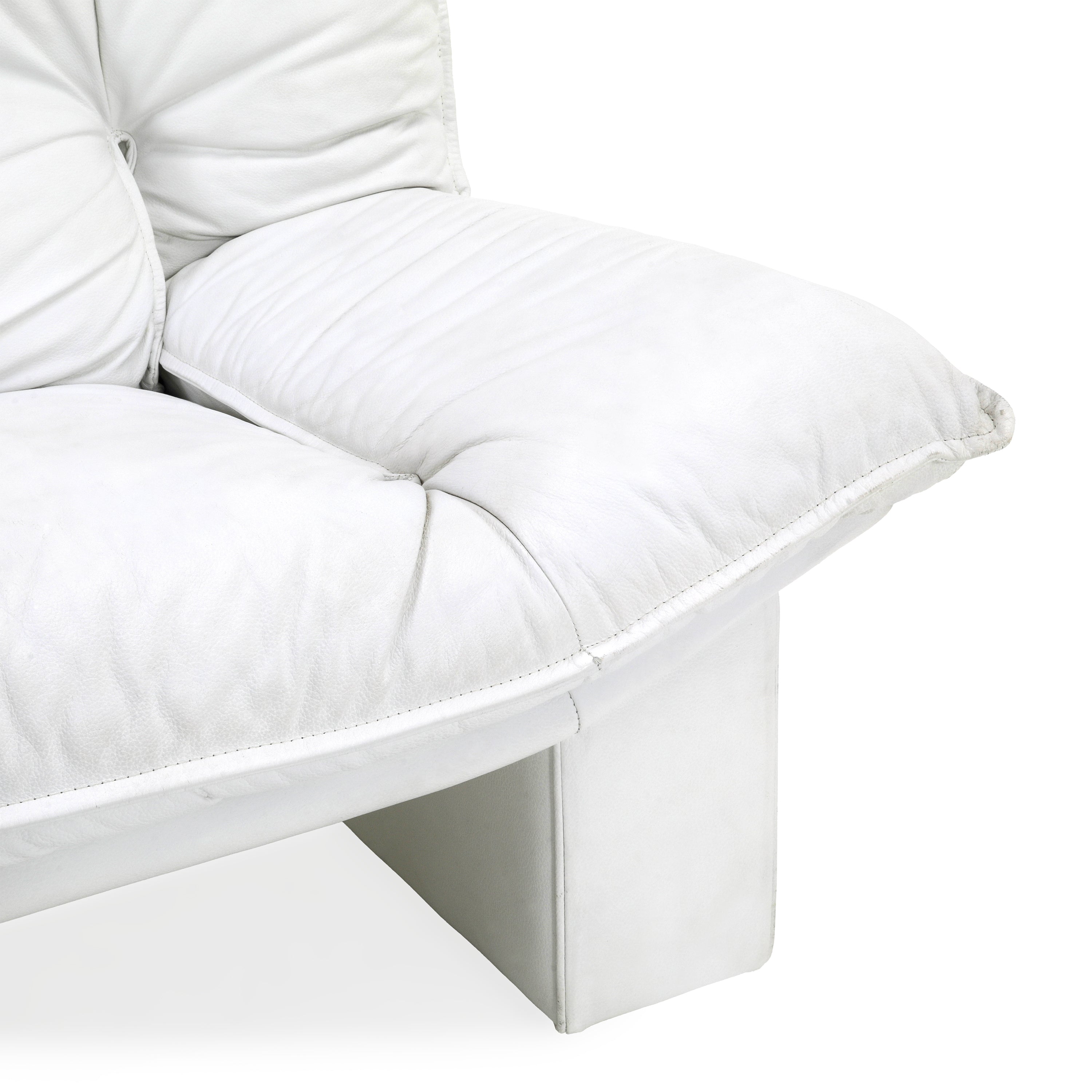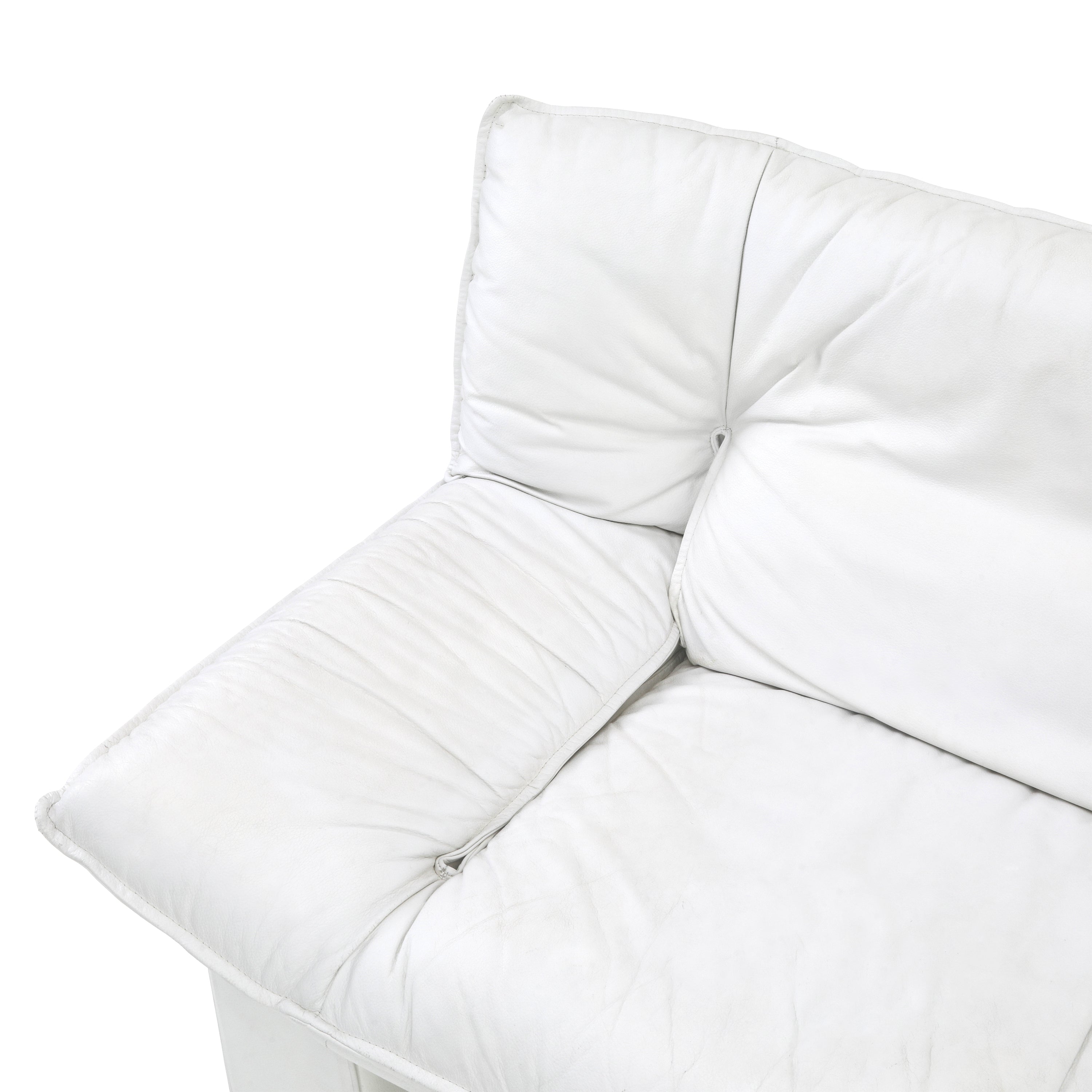 Details: White leather armchair with wide, angled armrests. Part of a matching set (loveseat and chair rented separately). Dimensions: 31" H x 85" W x...