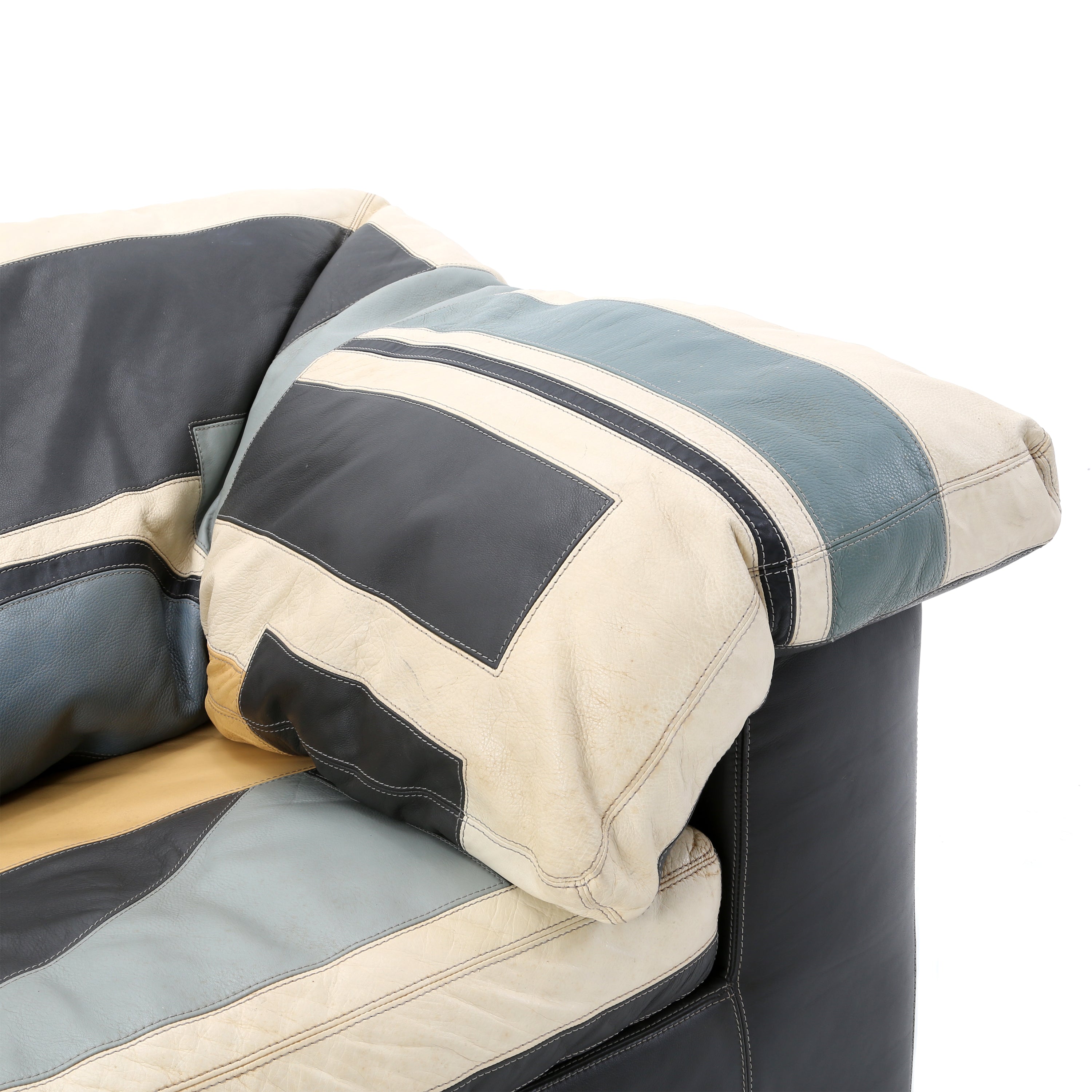 Details: Vintage deco loveseat with heavy leather cushions. Some noticeable wear due to age. (Part of a set, see last picture for reference. Sofa and...