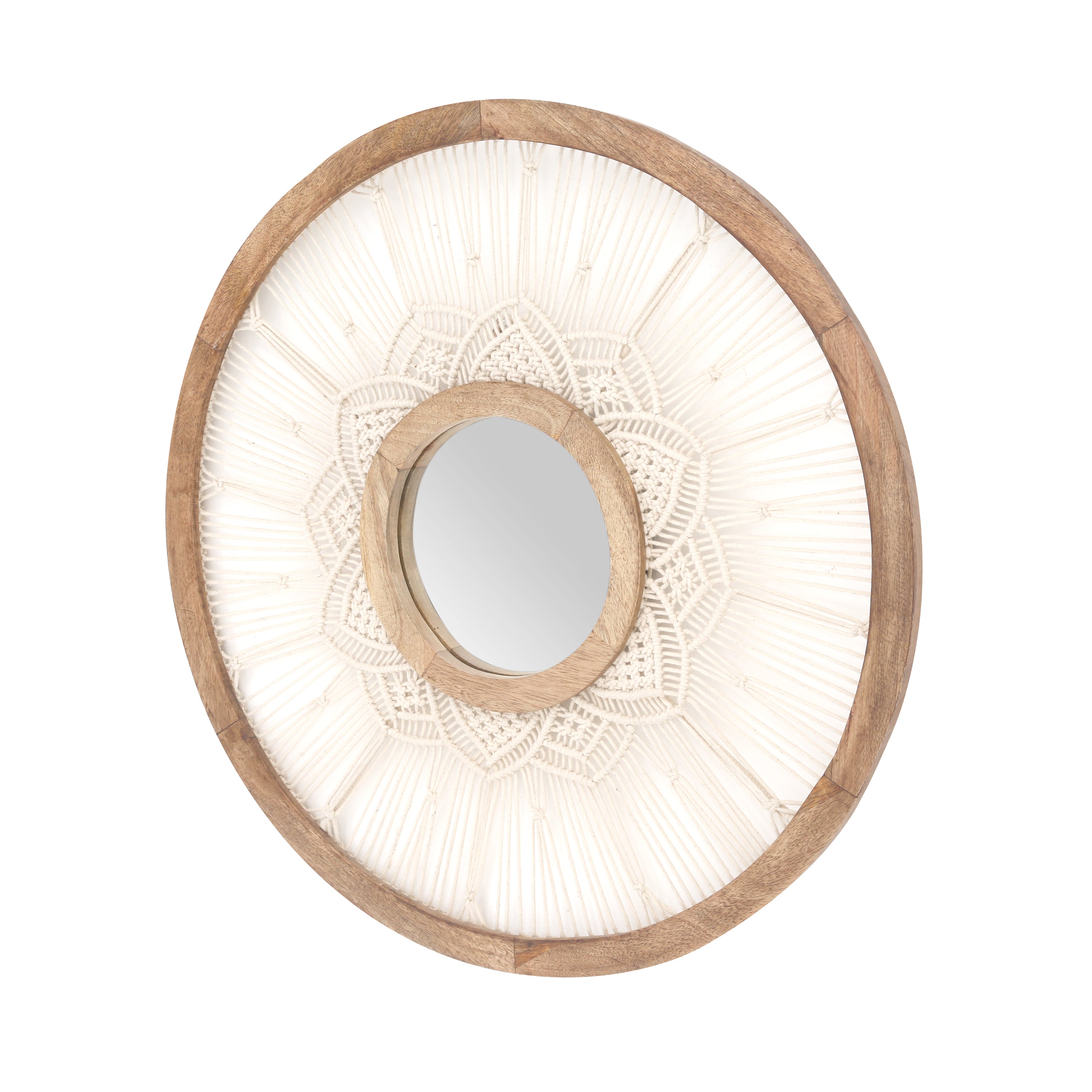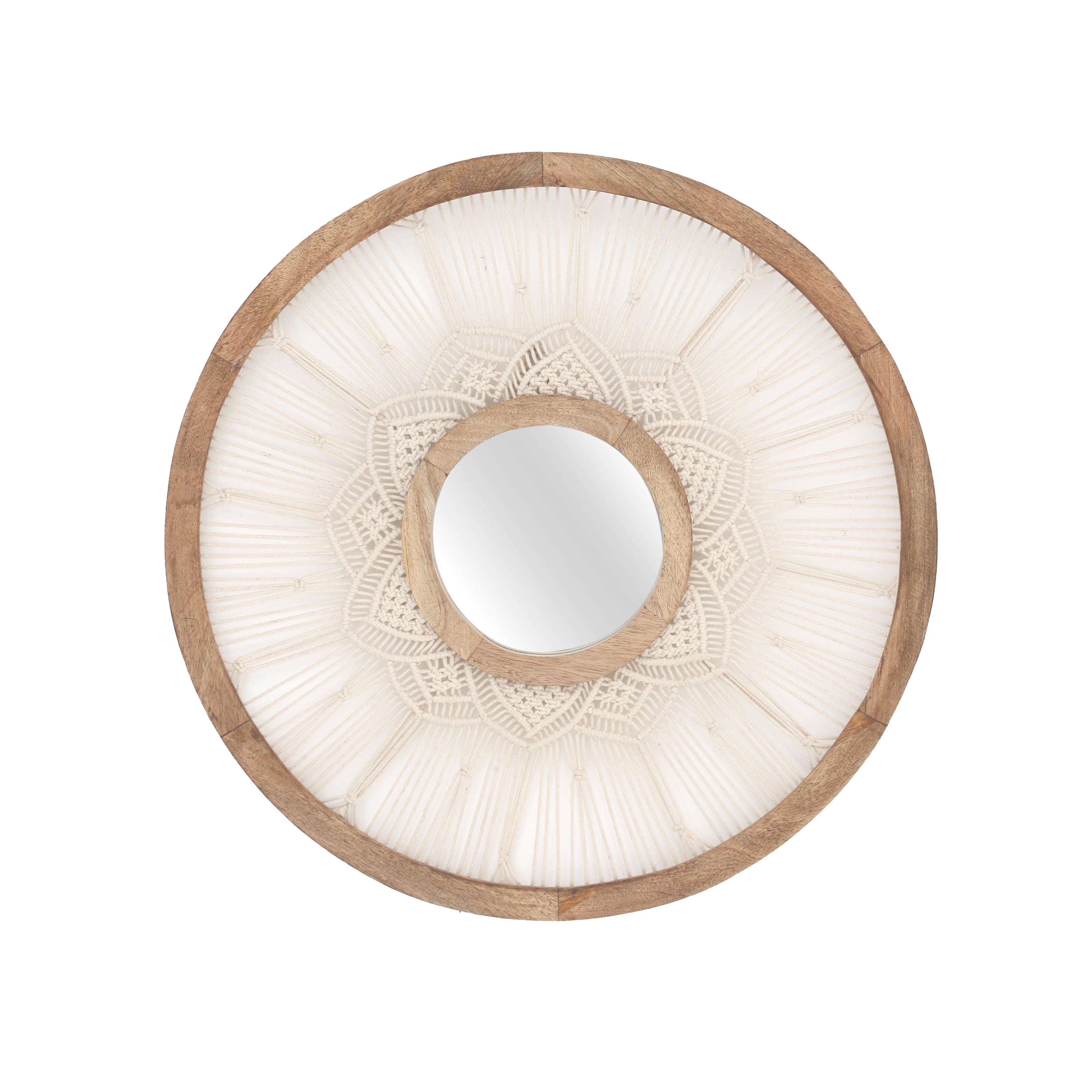 Details: Woven macrame mirror with inner and outer wood frame. Dimensions: 26" Diameter x 1" Deep