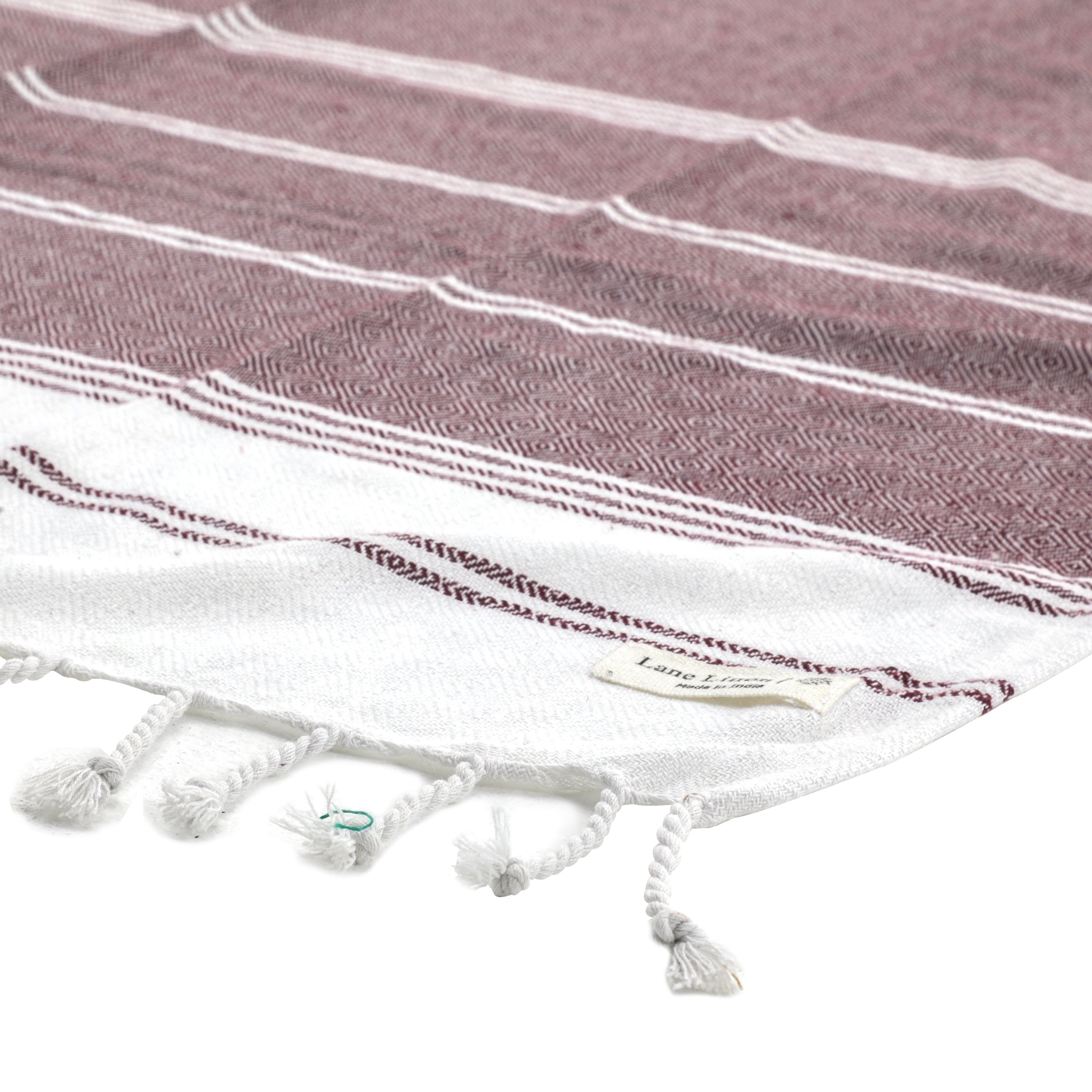 Details: Turkish towels with woven pattern, stripes, and tassels. Dimensions: 39" L x 39" W