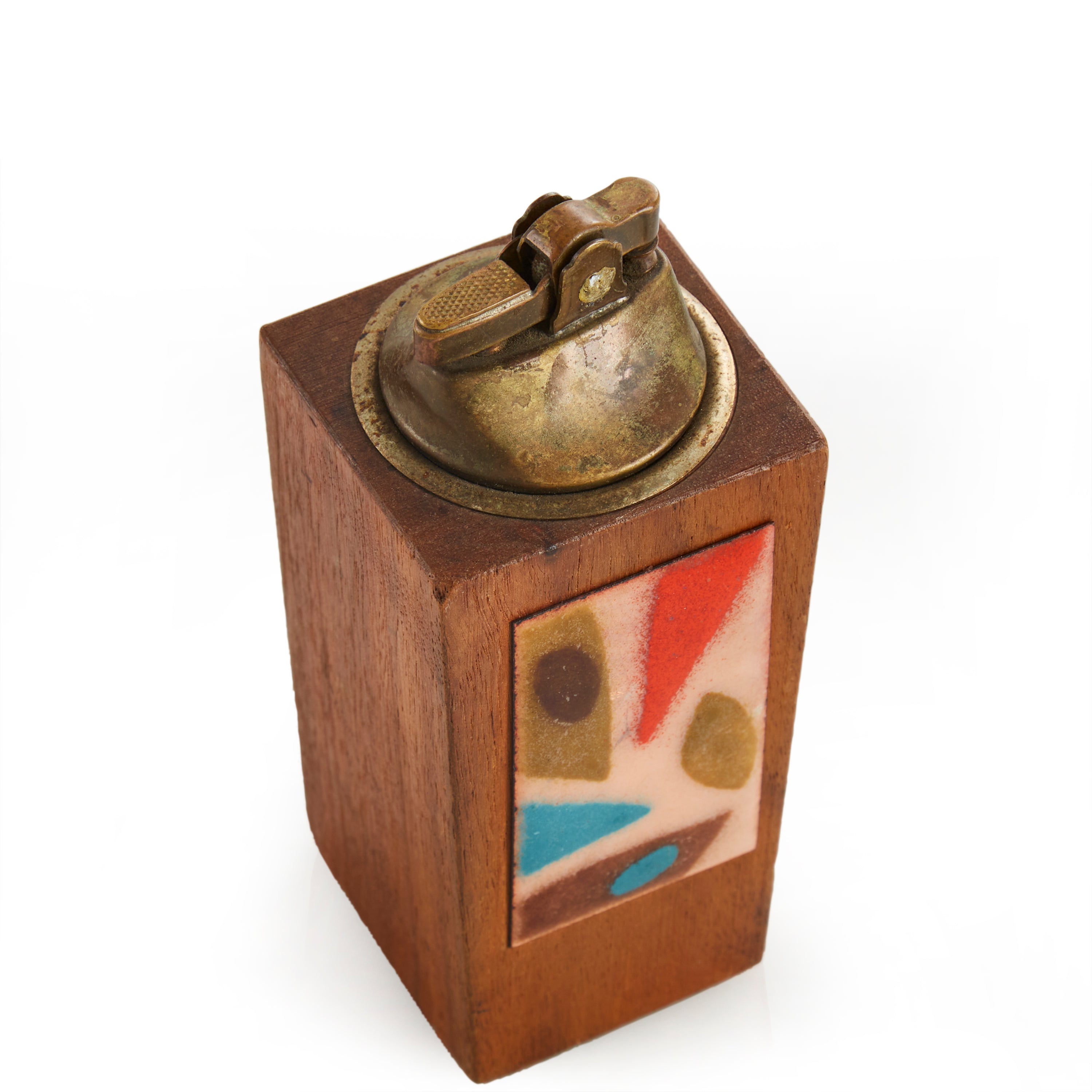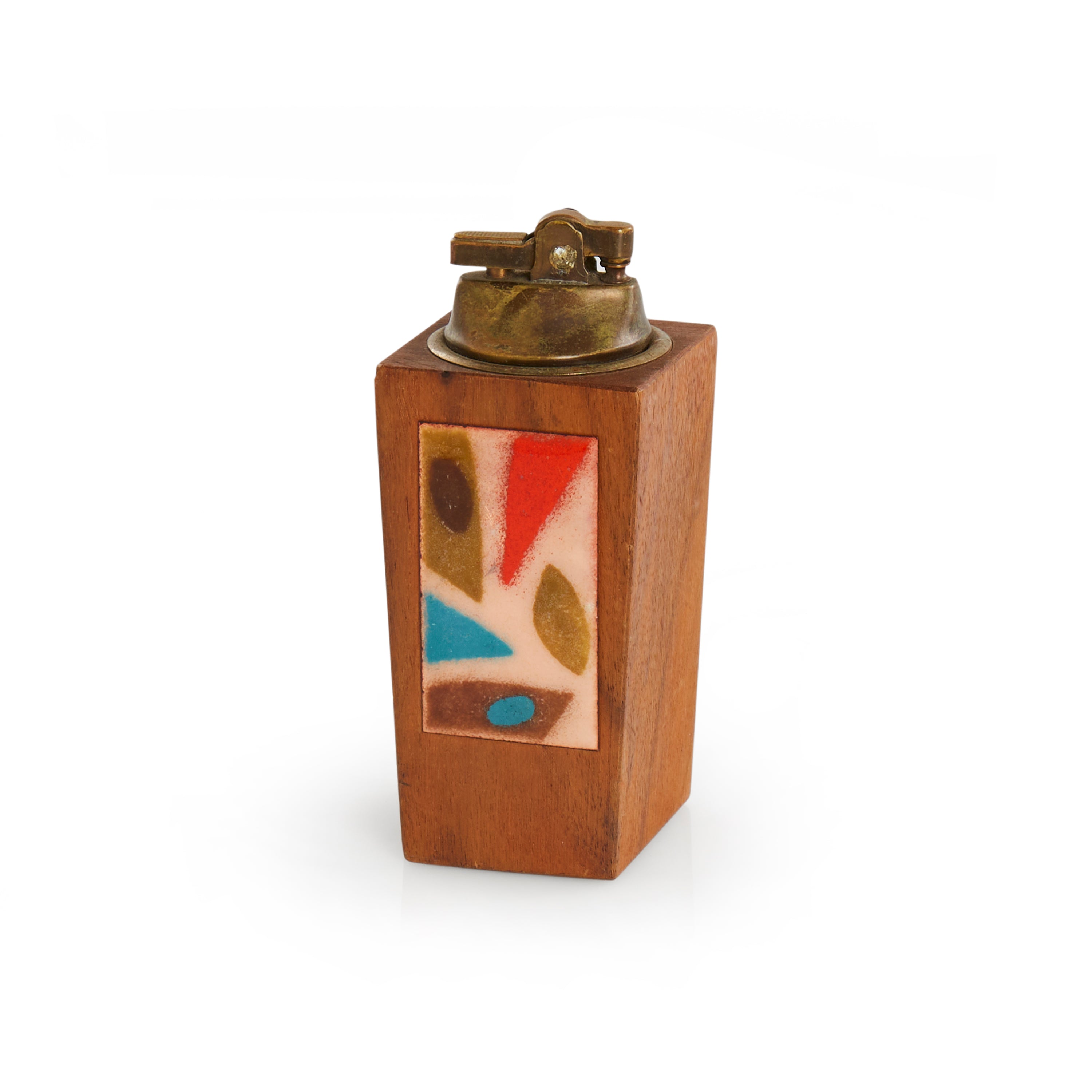 Details: Square tapered table lighter with MCM art on side Dimensions: 5" H x 2" W x 2" D