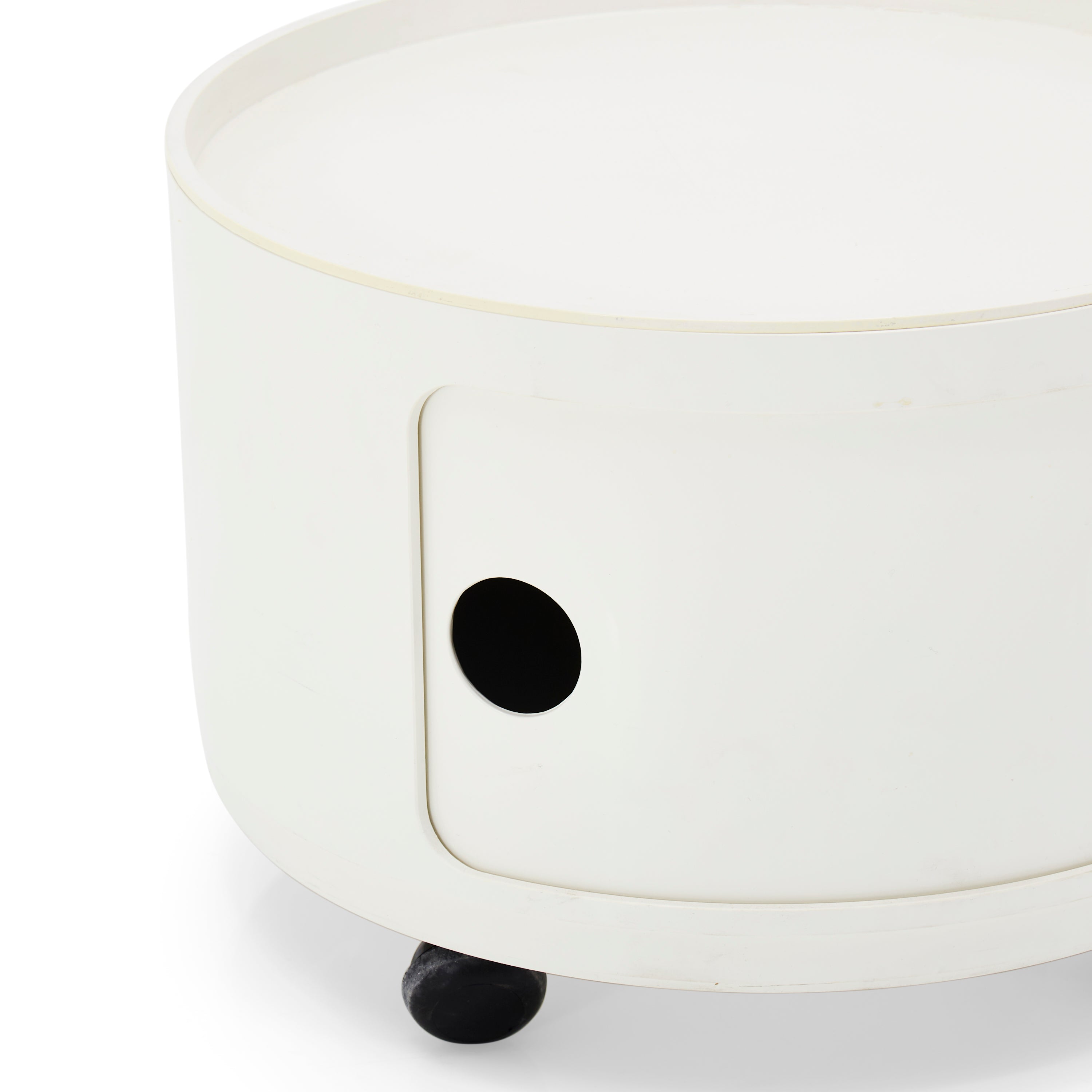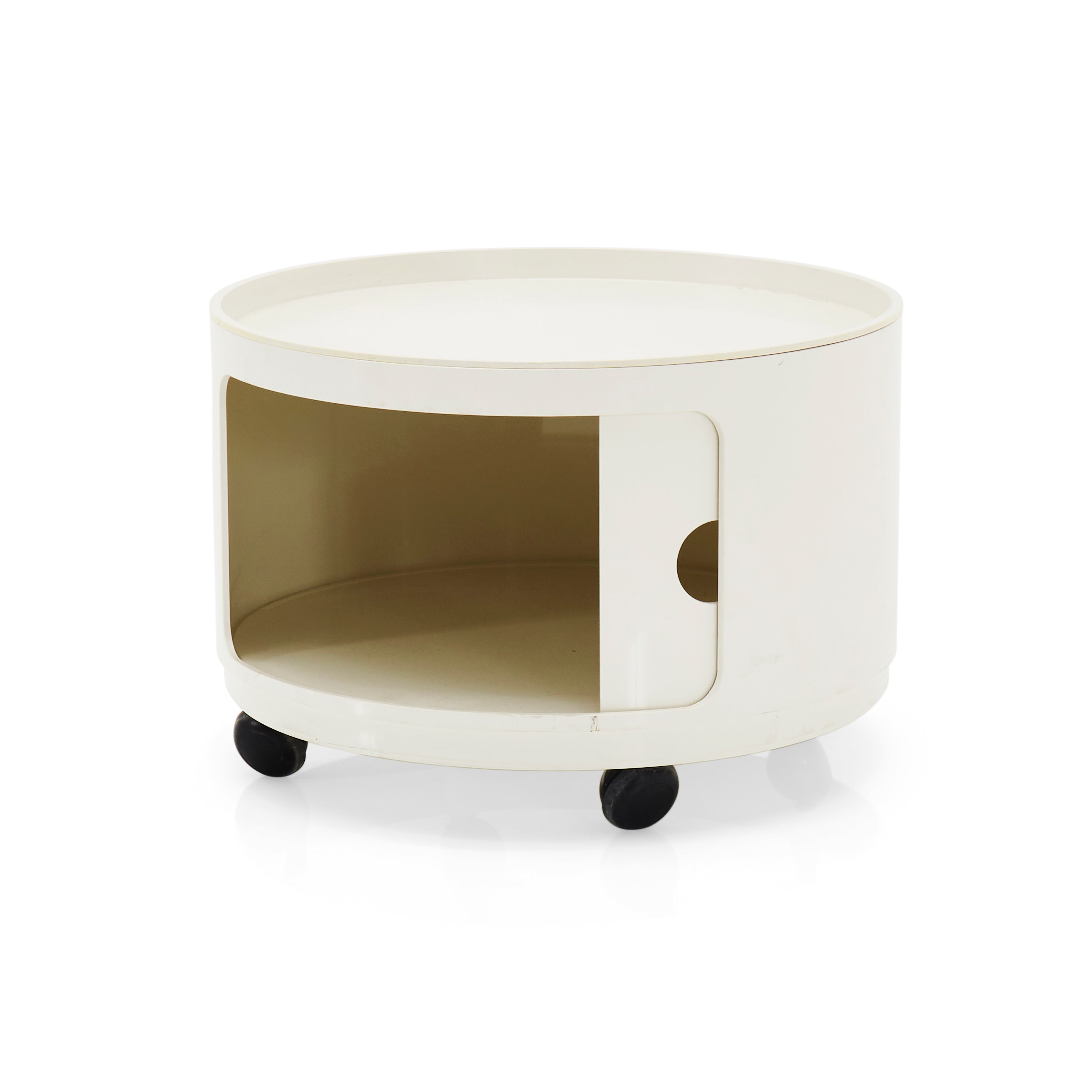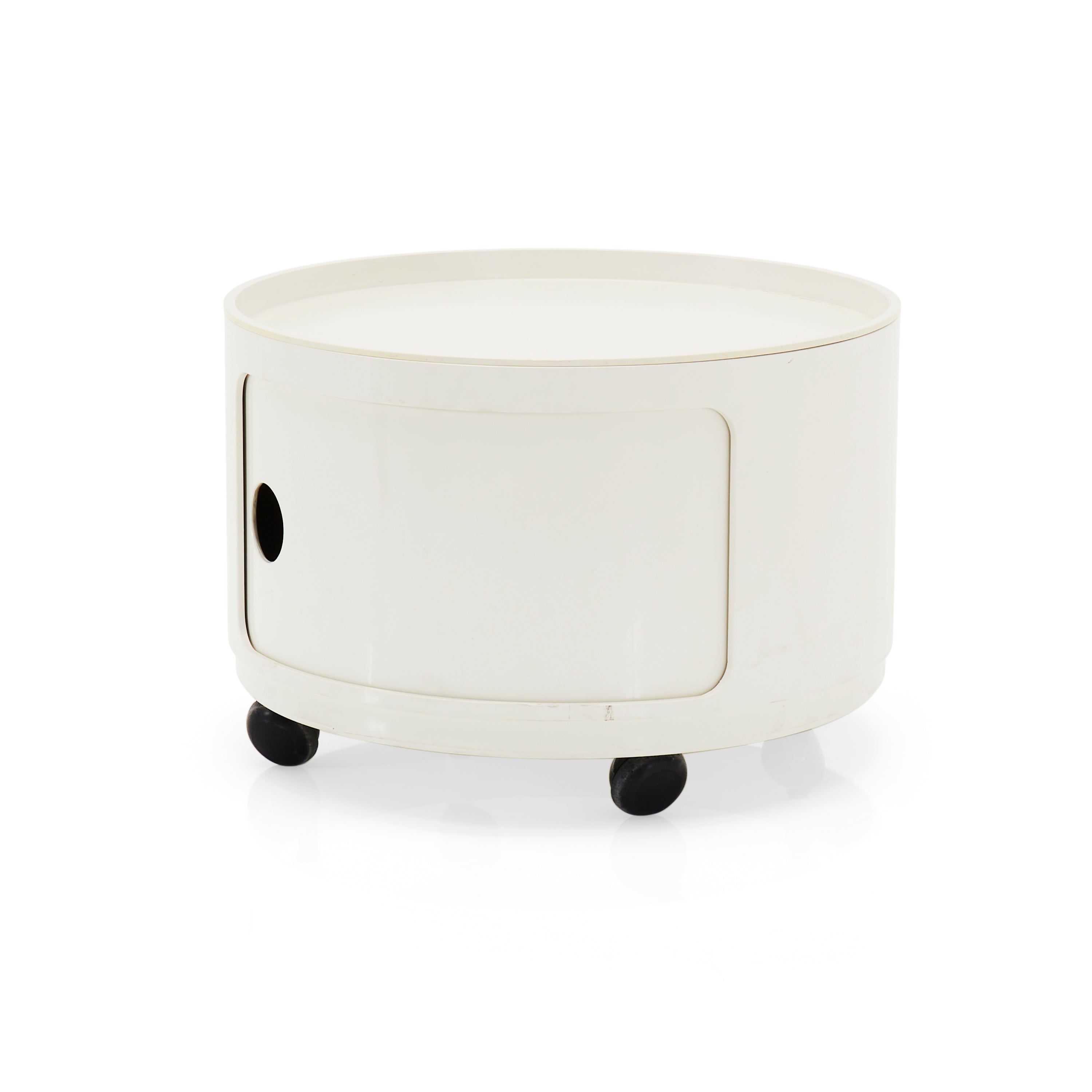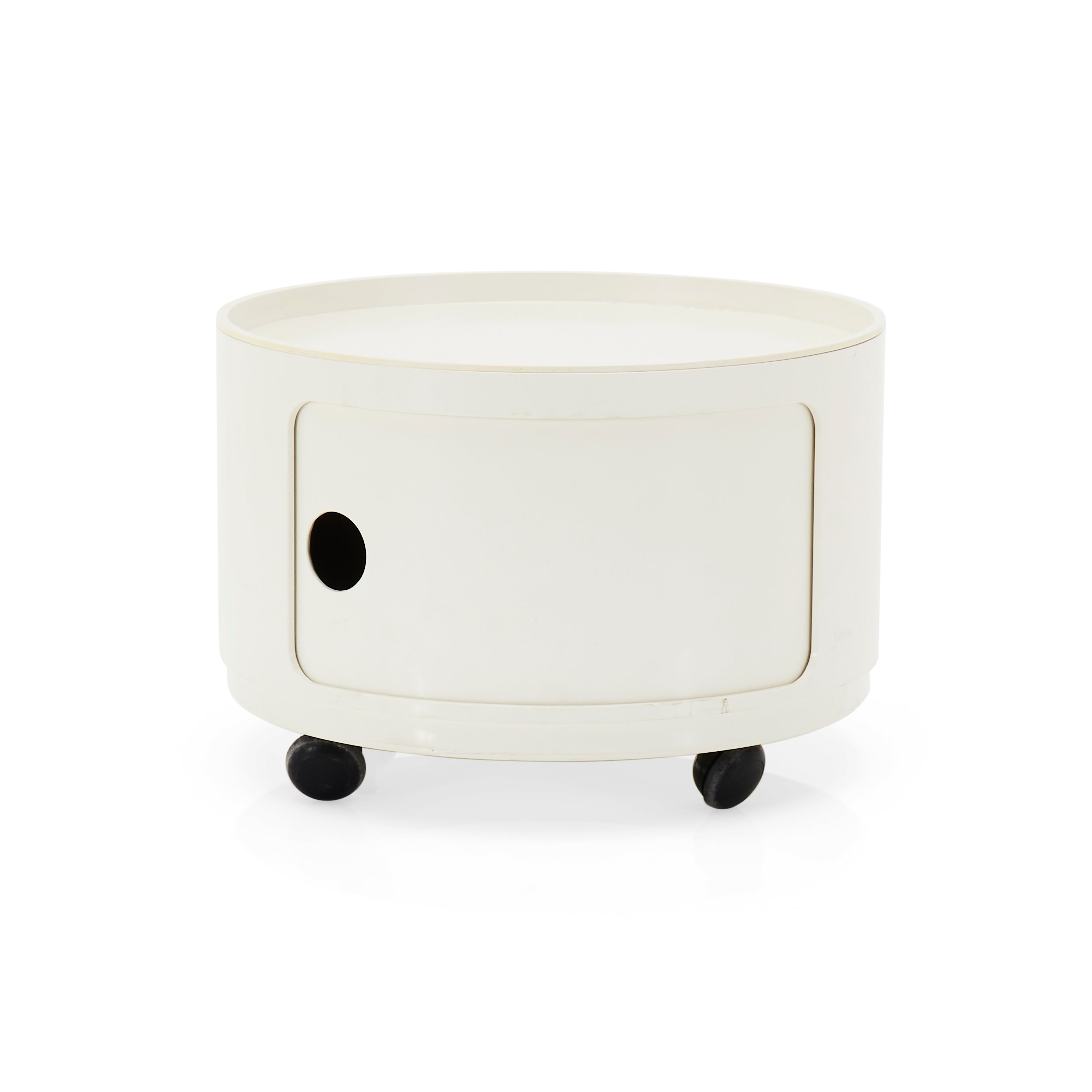 Details: Round white Kartell Componibili plastic storage cabinet with sliding door and wheel. Stackable. Dimensions: 12" H x 17" D Quantity: 3