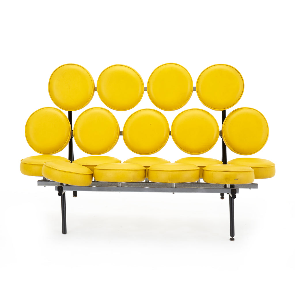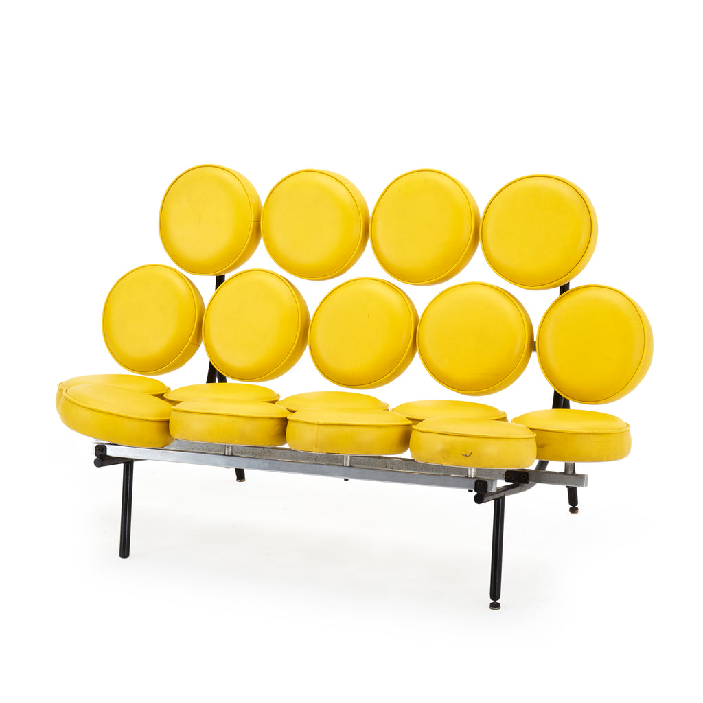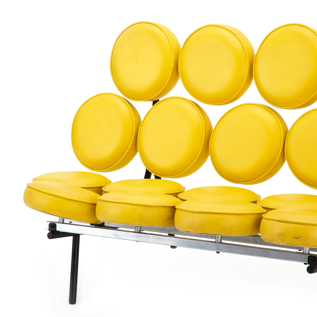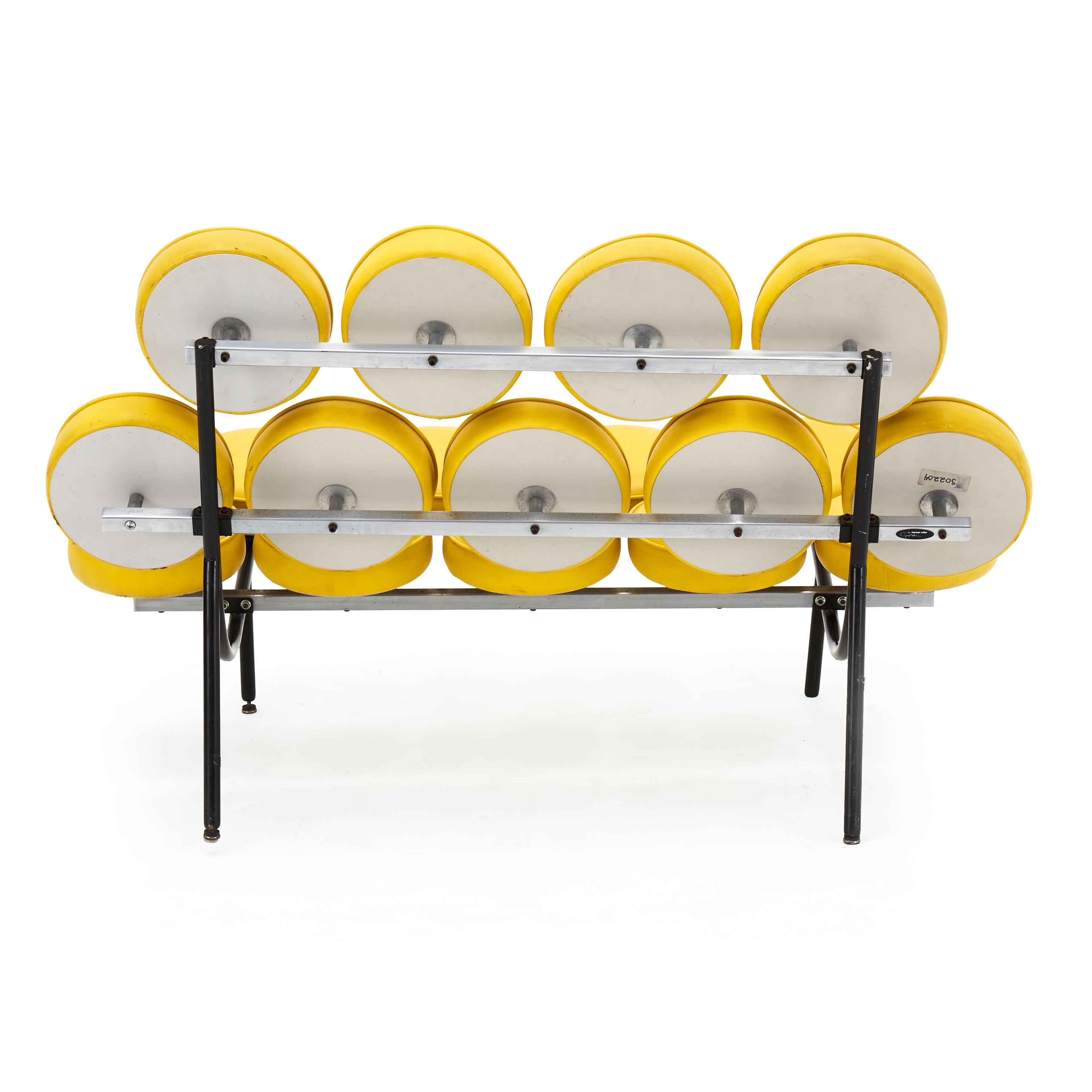 Details: Yellow Ultra Suede, Gossip Bench, Curved Seating, Chrome Legs, White Material Table Connector, Curved Back Rest, Chrome Slanted Legs Dimensions: 36" H x 115"...