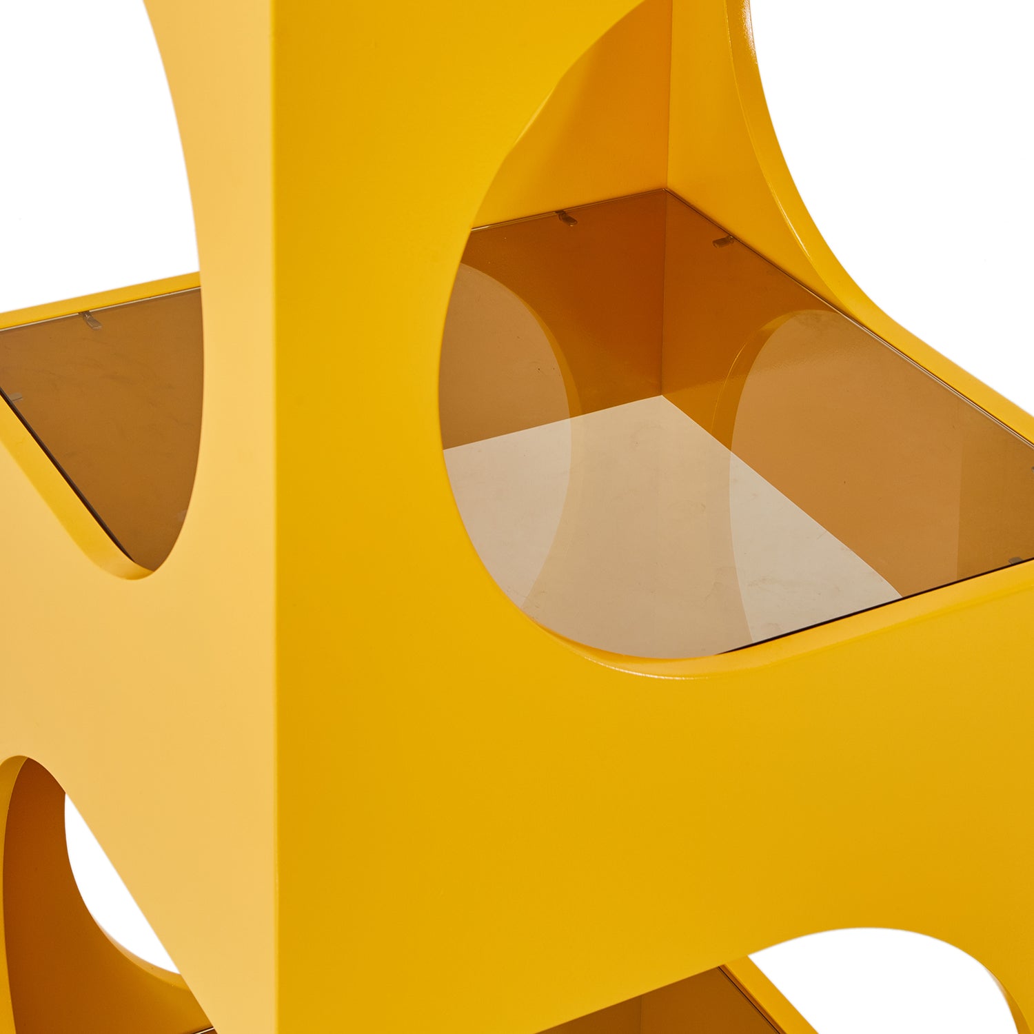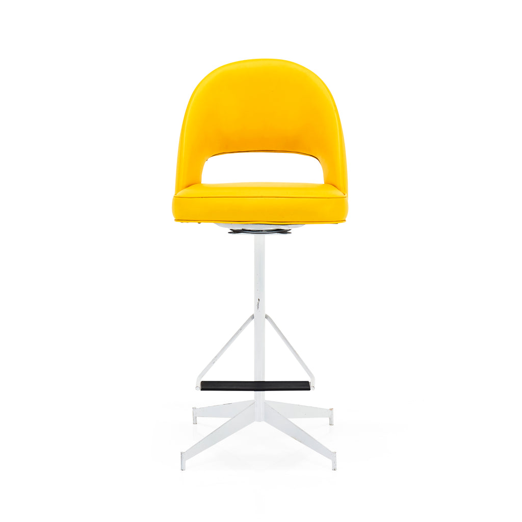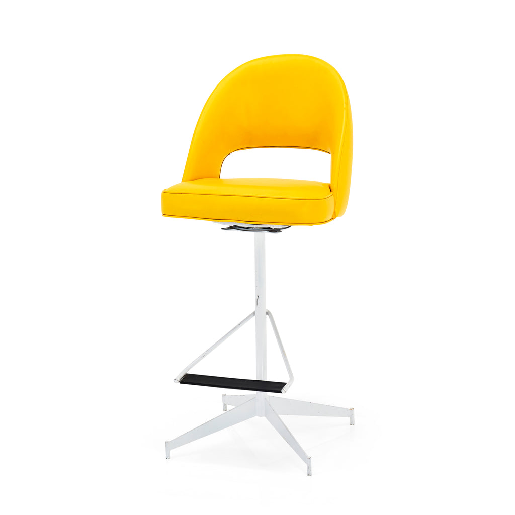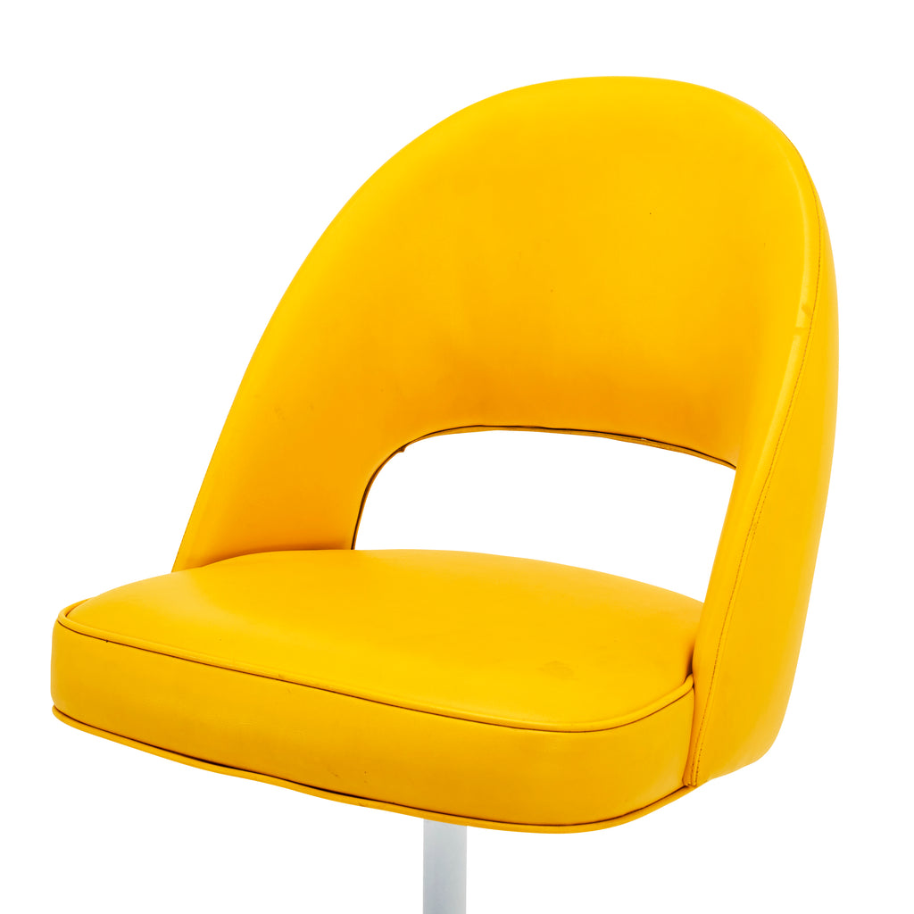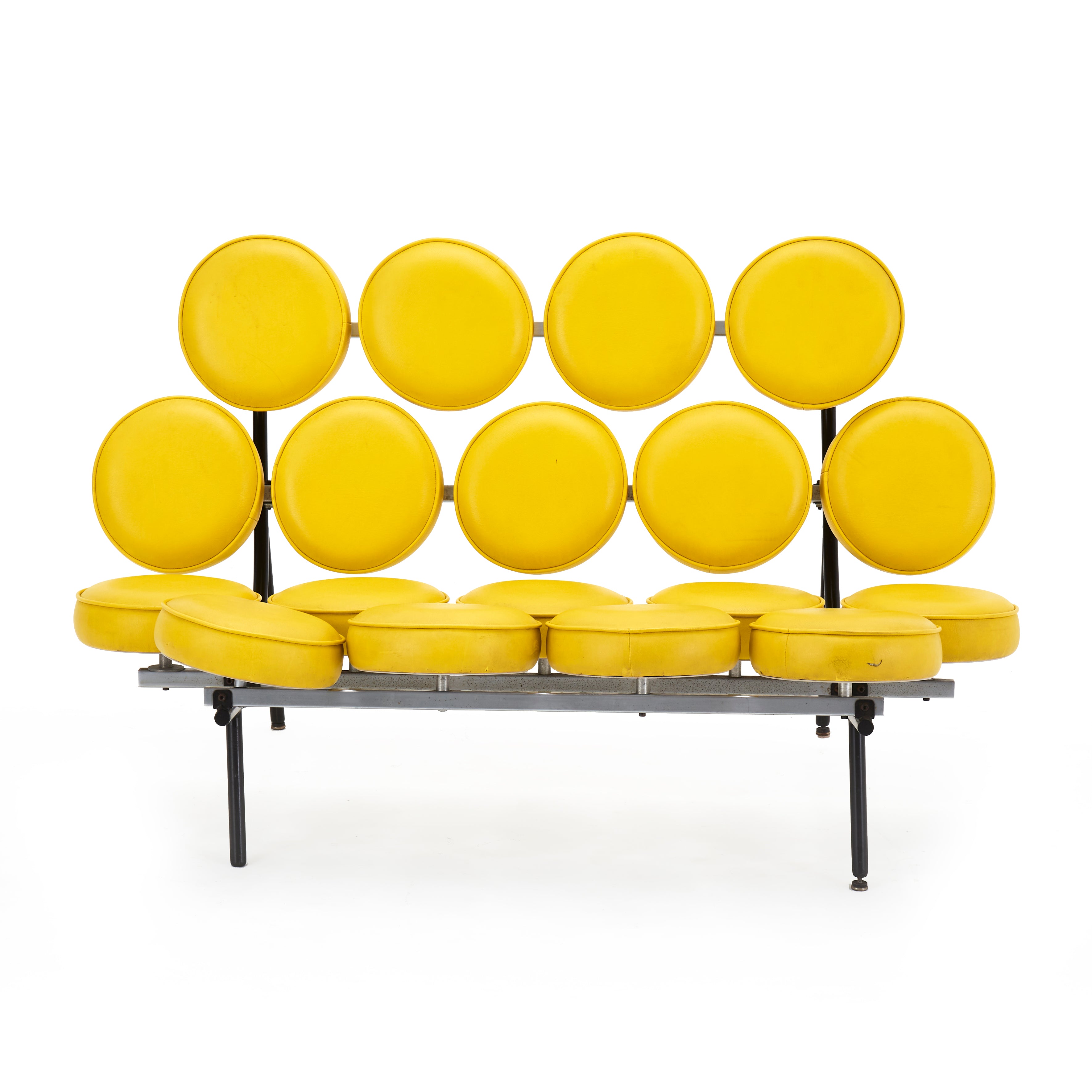 Details: Yellow Ultra Suede, Gossip Bench, Curved Seating, Chrome Legs, White Material Table Connector, Curved Back Rest, Chrome Slanted Legs Dimensions: 36" H x 115"...