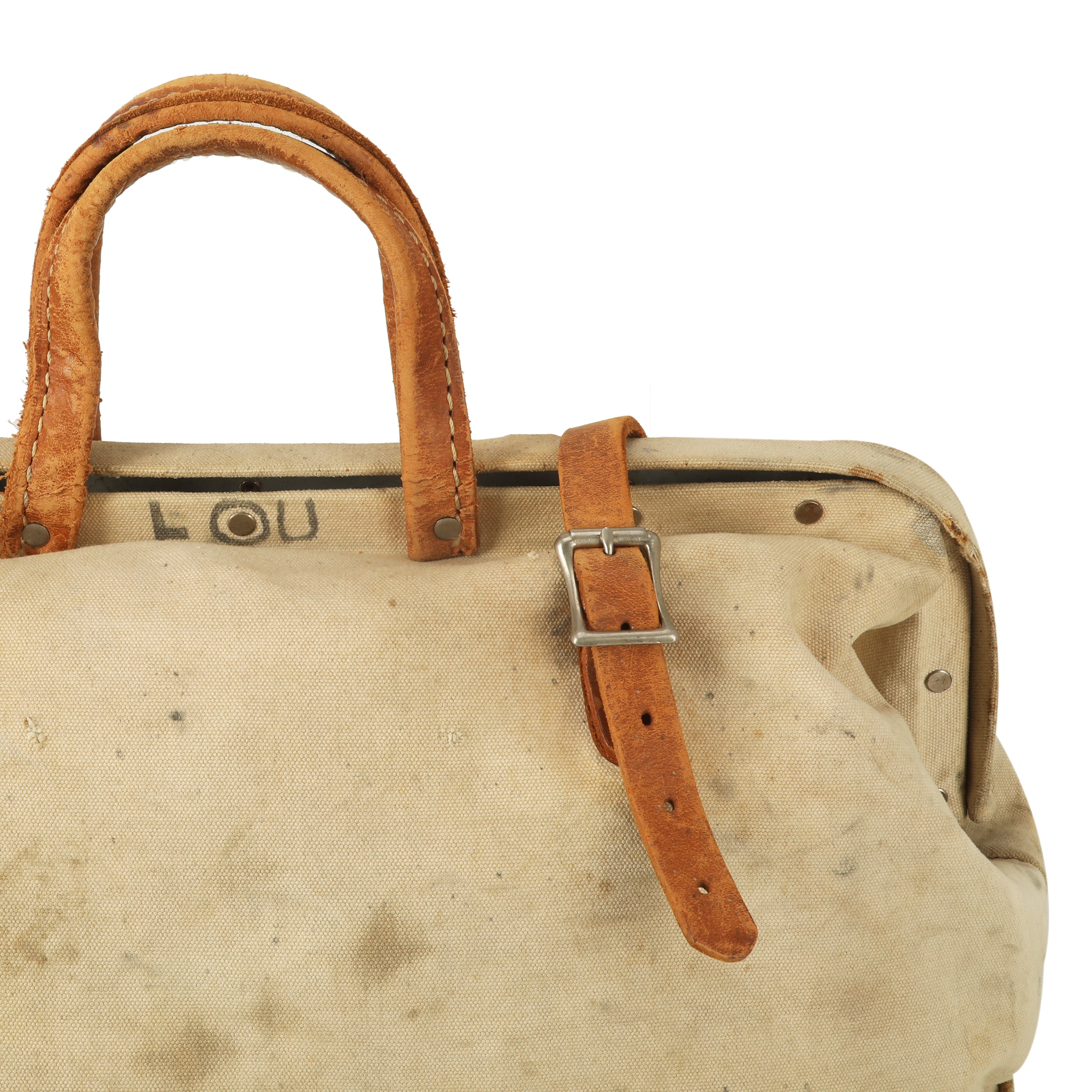 Details: Vintage tan duffle bag with brown handles and straps. Used to belong to someone named Lou, so it goes. Visible wear and some stains, rented...