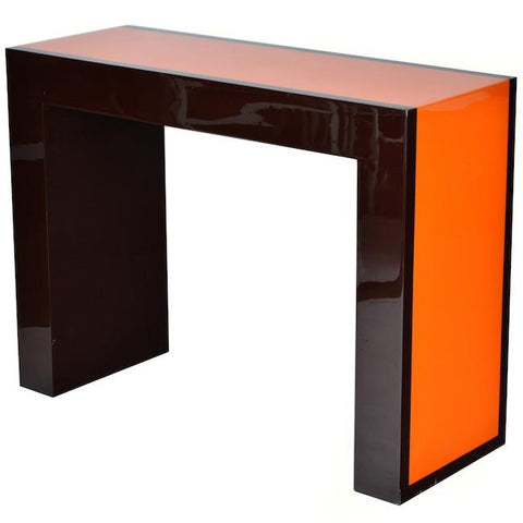 Details: Brown and orange lacquer console table Dimensions: 36" H x 48" W x 18" D