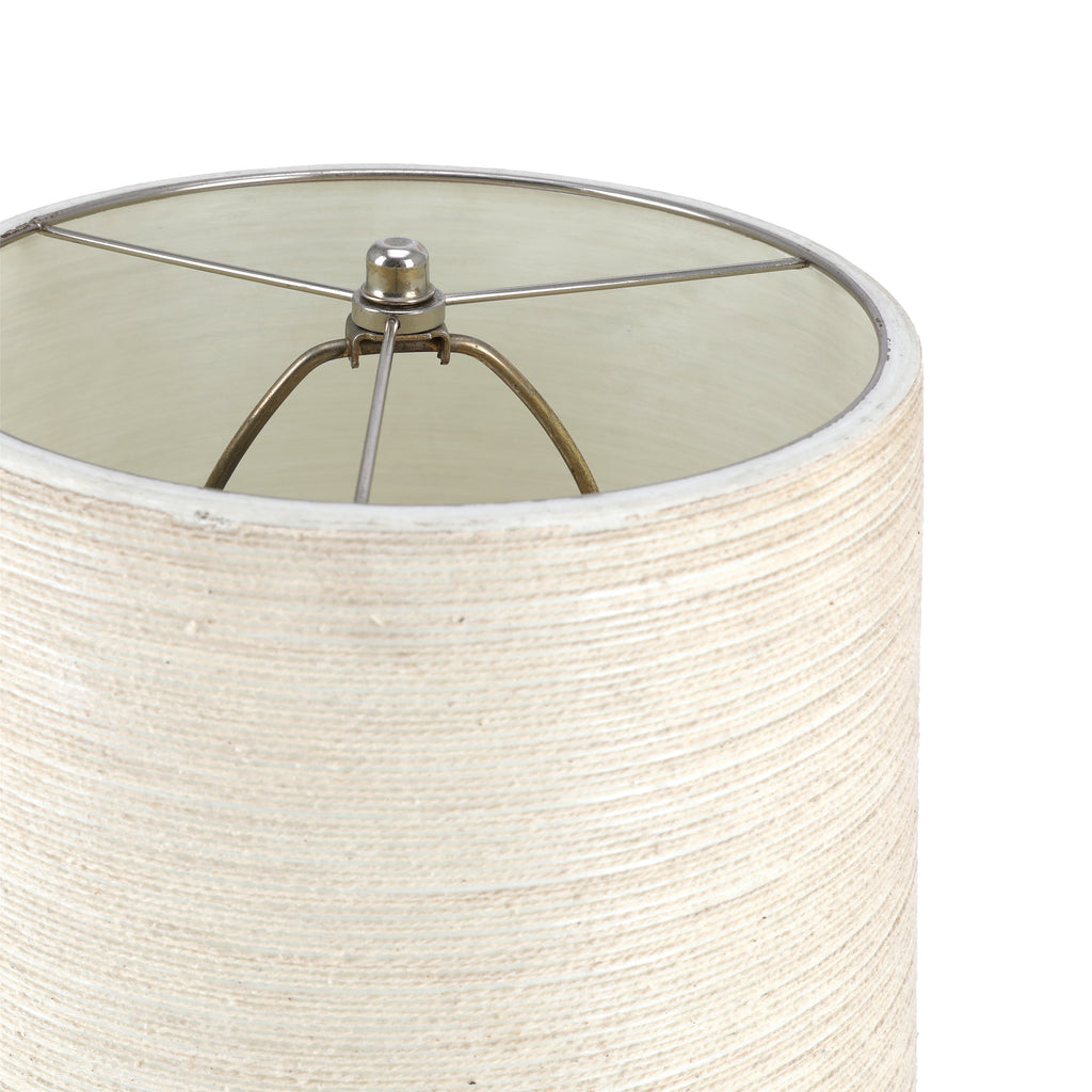 Details: Table lamp with rectangular shade and distressed metal base with old-fashioned bicycle decoration
