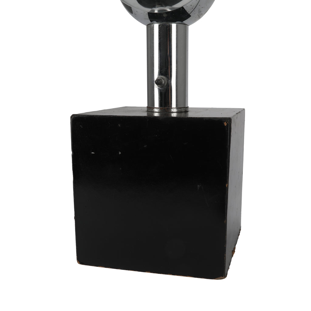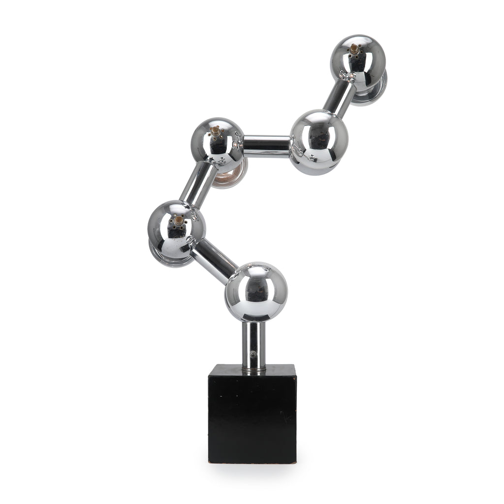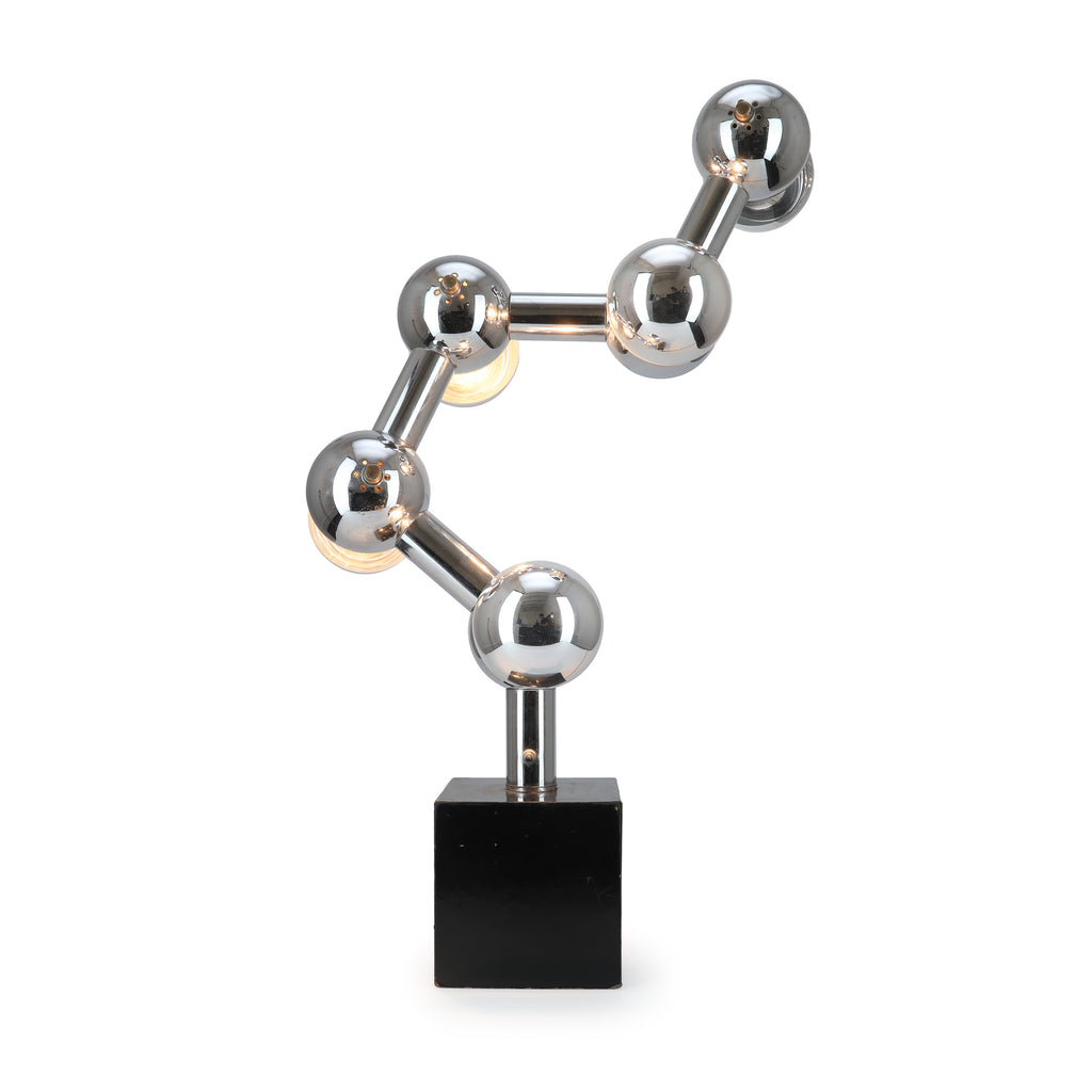 Details: Futuristic chrome table lamp in the shape of a molecular compound. Black cube base.