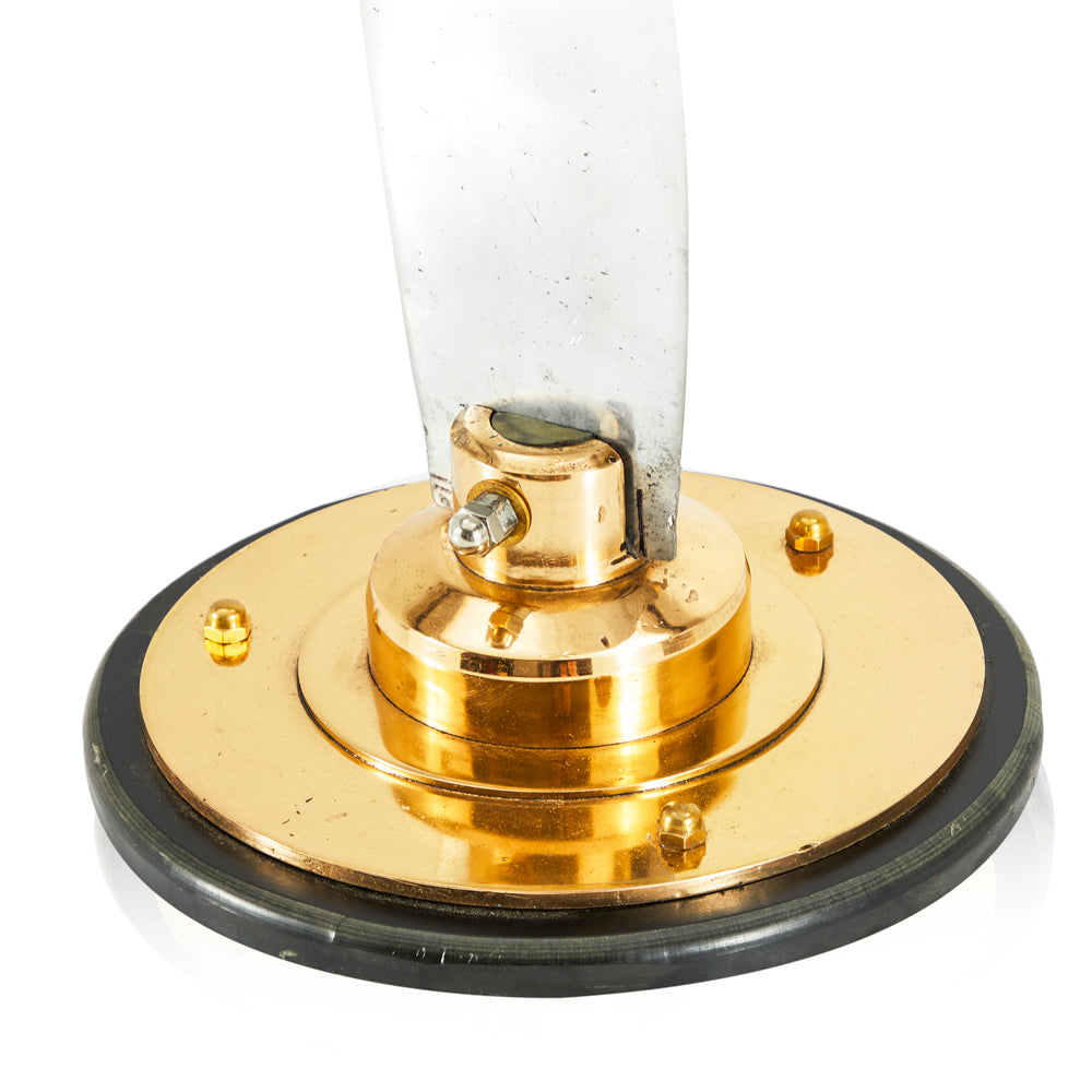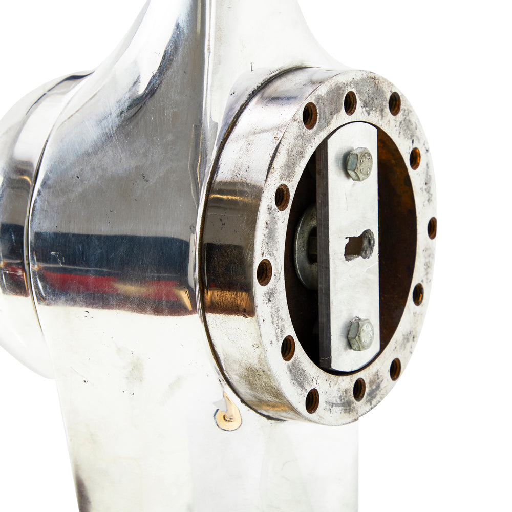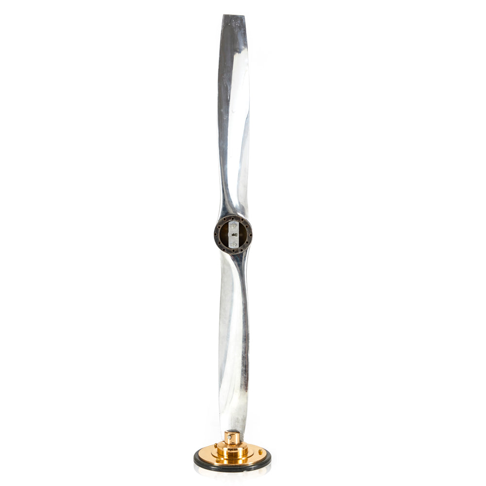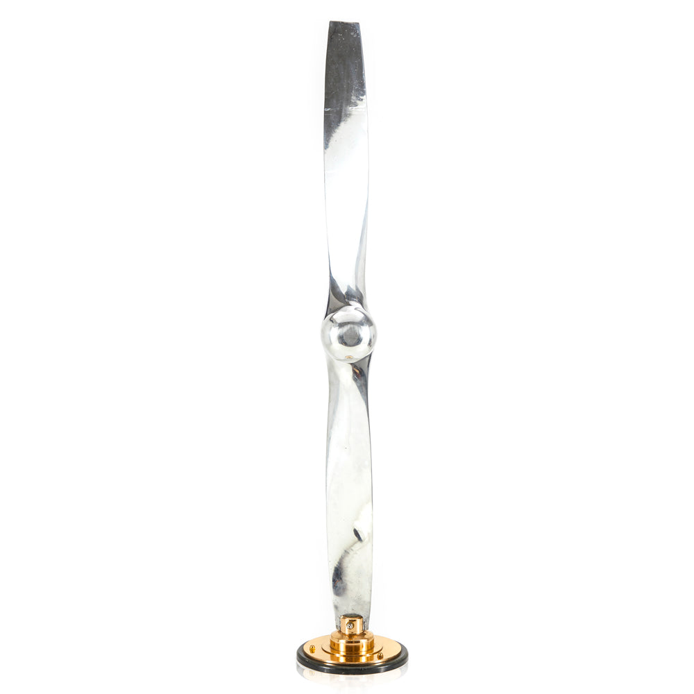 Details: Chrome airplane propeller floor sculpture fixed to bronze base Dimensions: 67" H x 12" W x 12" D Quantity: 1