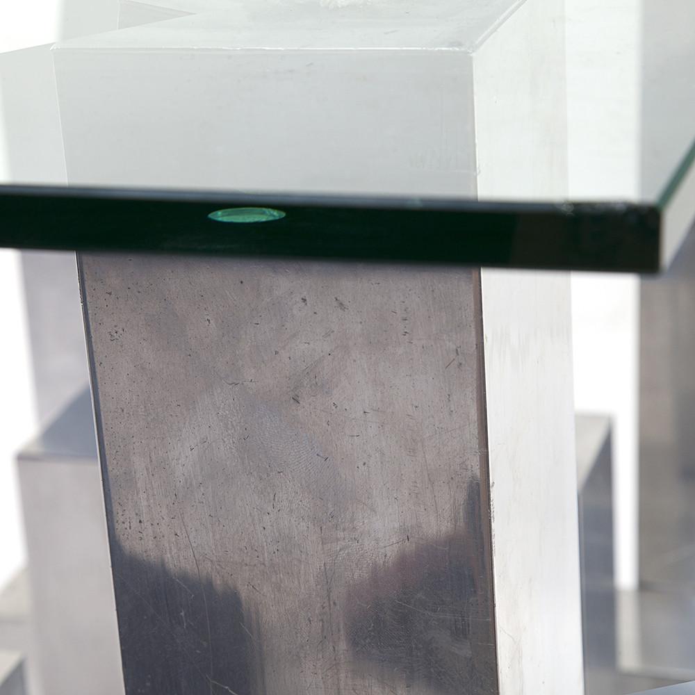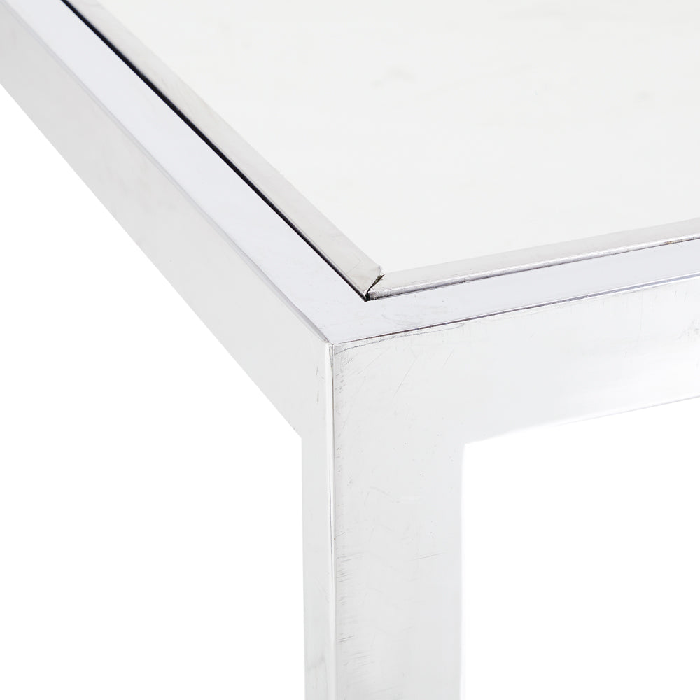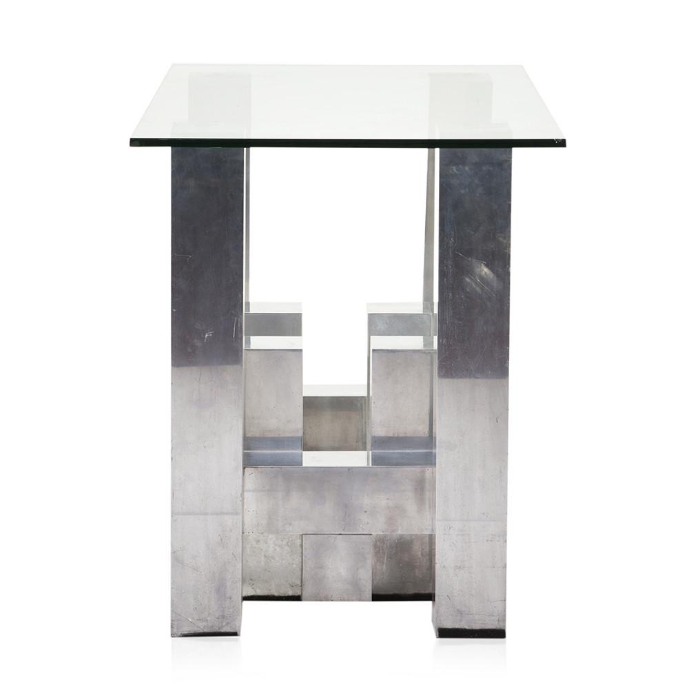 Details: Chrome skyscraper base console table with dark glass top Dimensions: 29" H x 41" W x 23" D