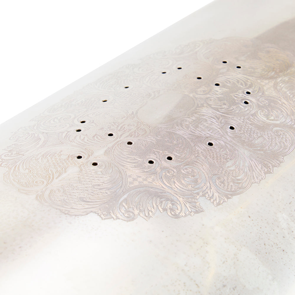 Details: Vintage mirror with brushed aluminum frame and built in semi-circle shelf. Dimensions: 46" H x 24" W x 6" D