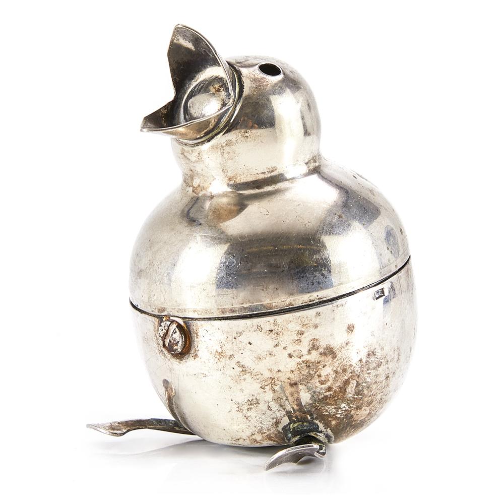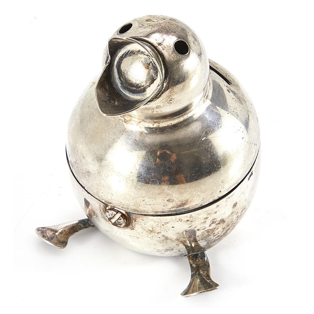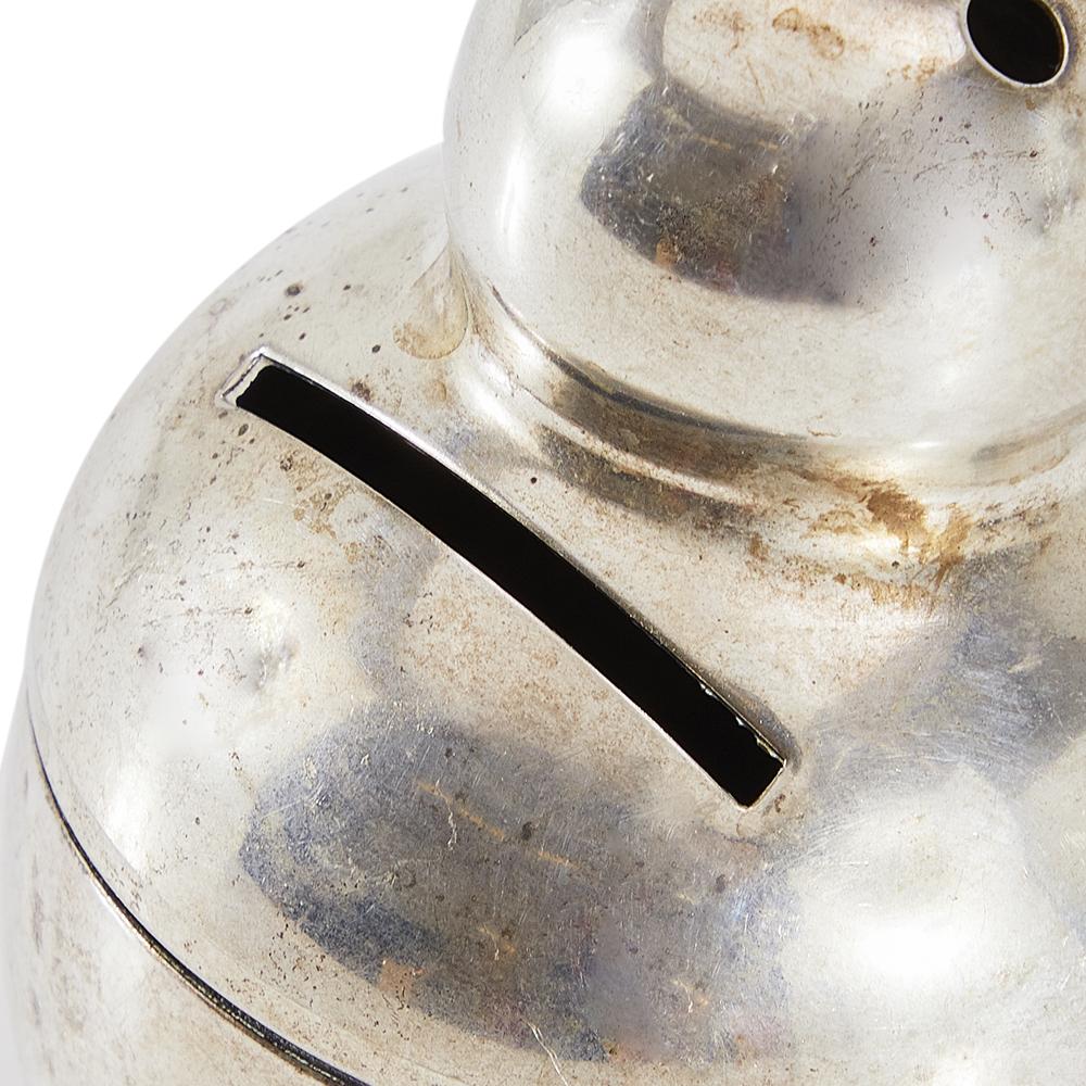 Details: Rusted chrome piggy bank in the shape of small bird Dimensions: 3.75" H x 2.75" W x 2.5" D