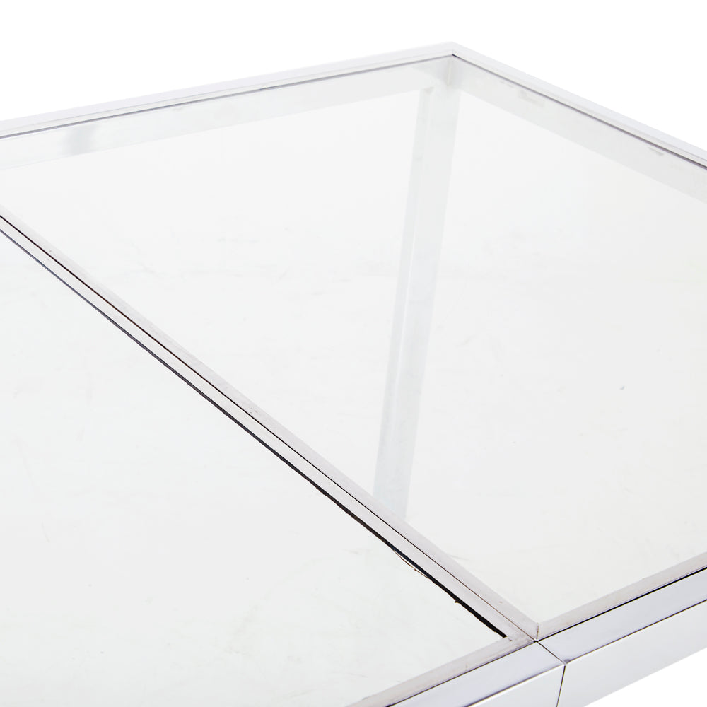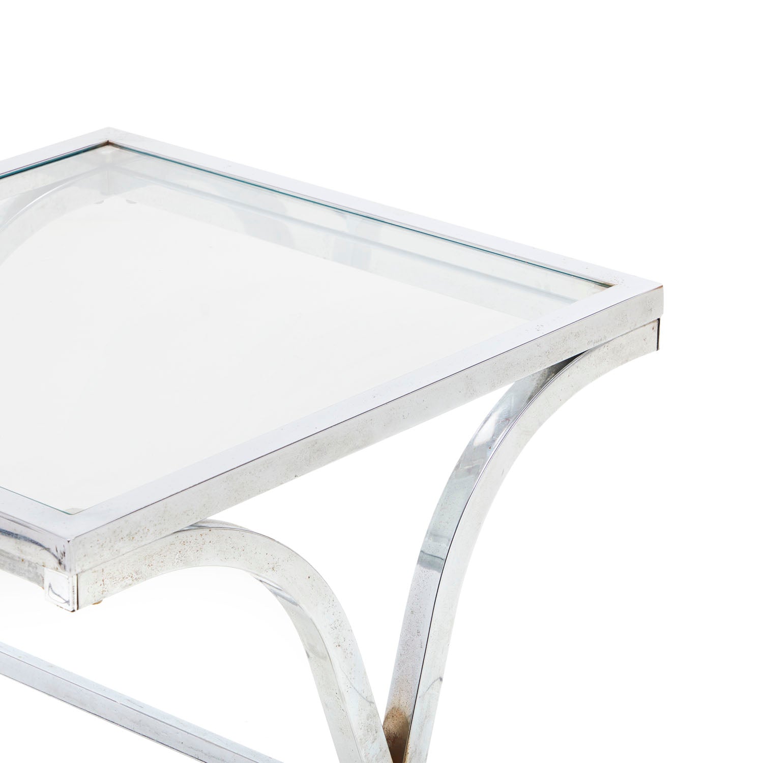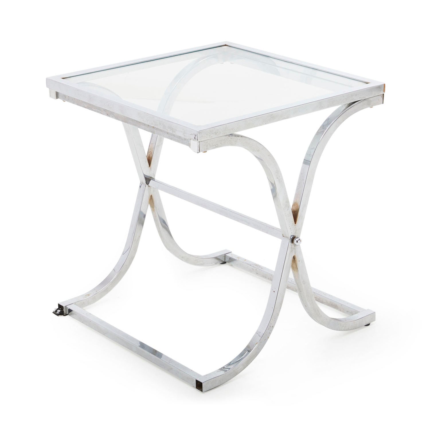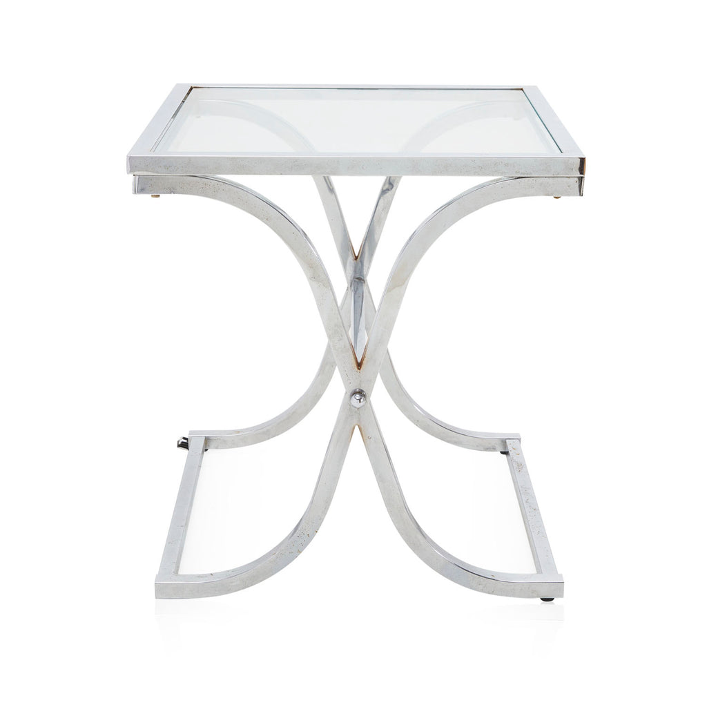 Details: Chrome side table with glass top and x-shaped frame Dimensions: 24" H x 22" W x 22" D