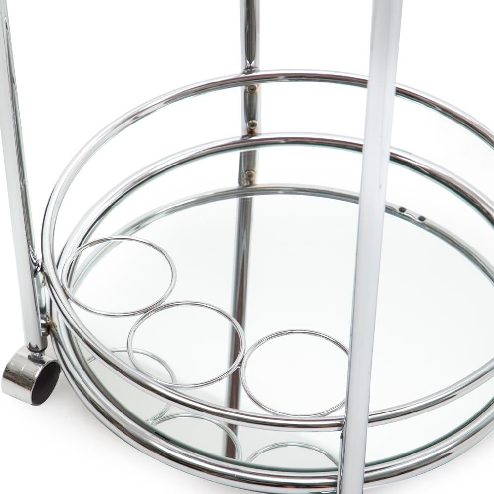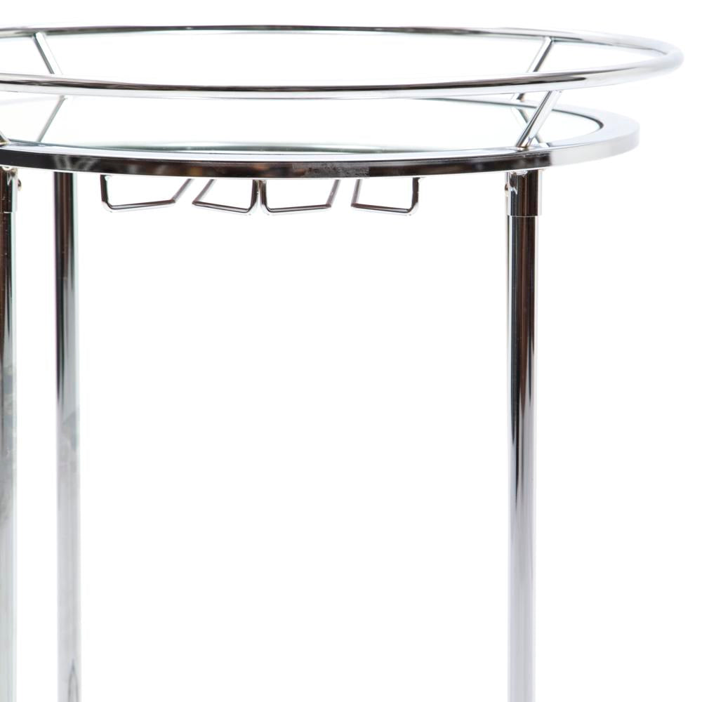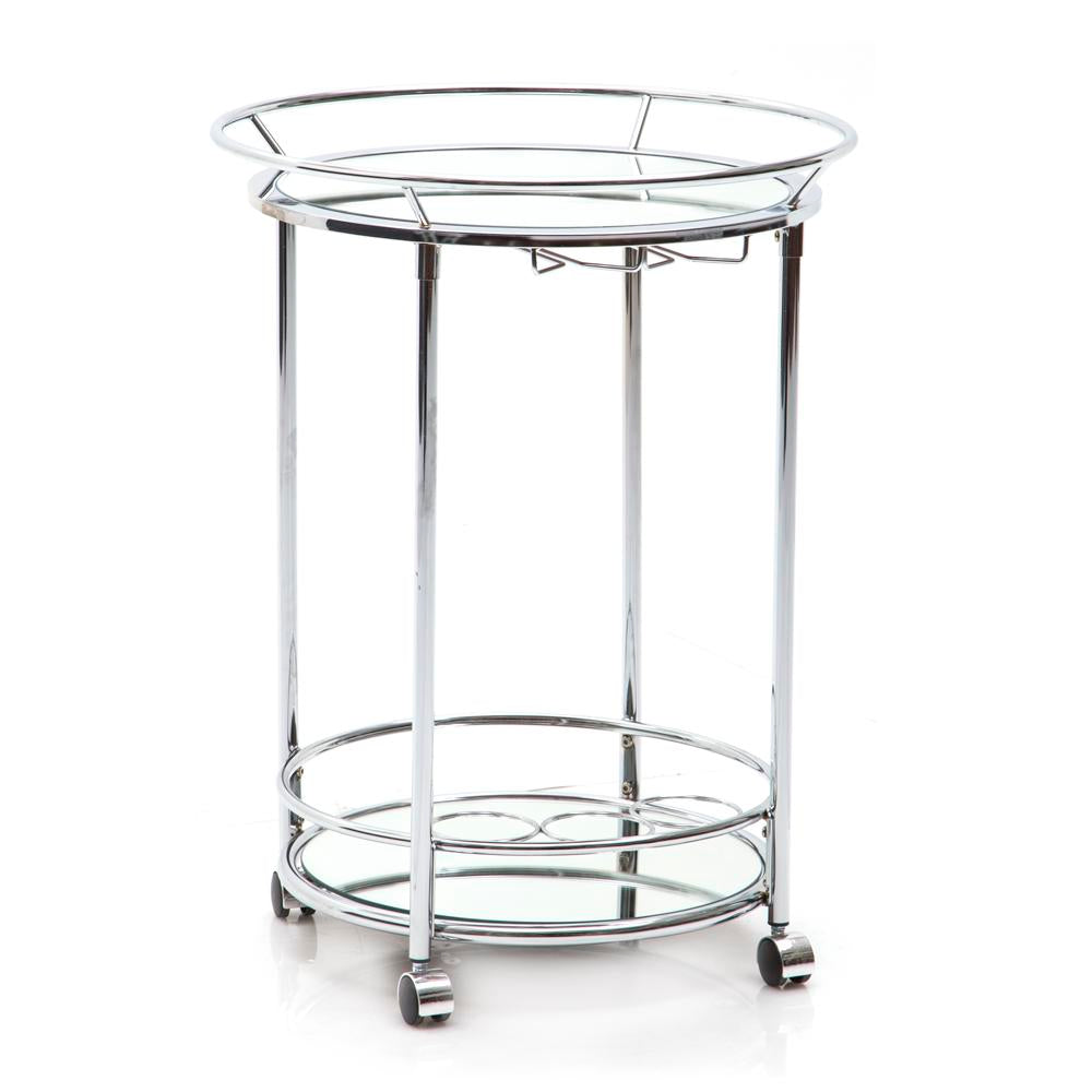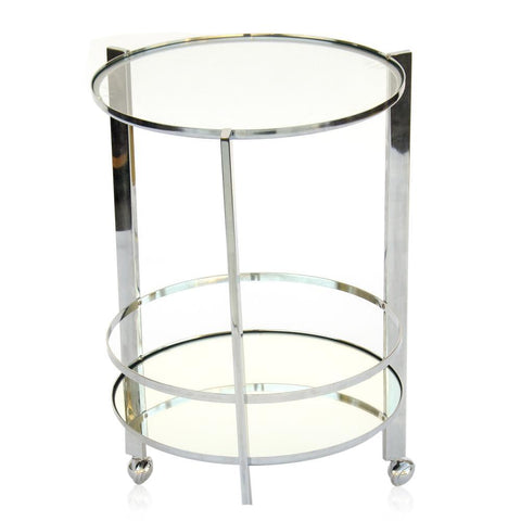 Details: Chrome and glass circular rolling side bar table Dimensions: 29.5" H x 19.5" W x 19.5" D
