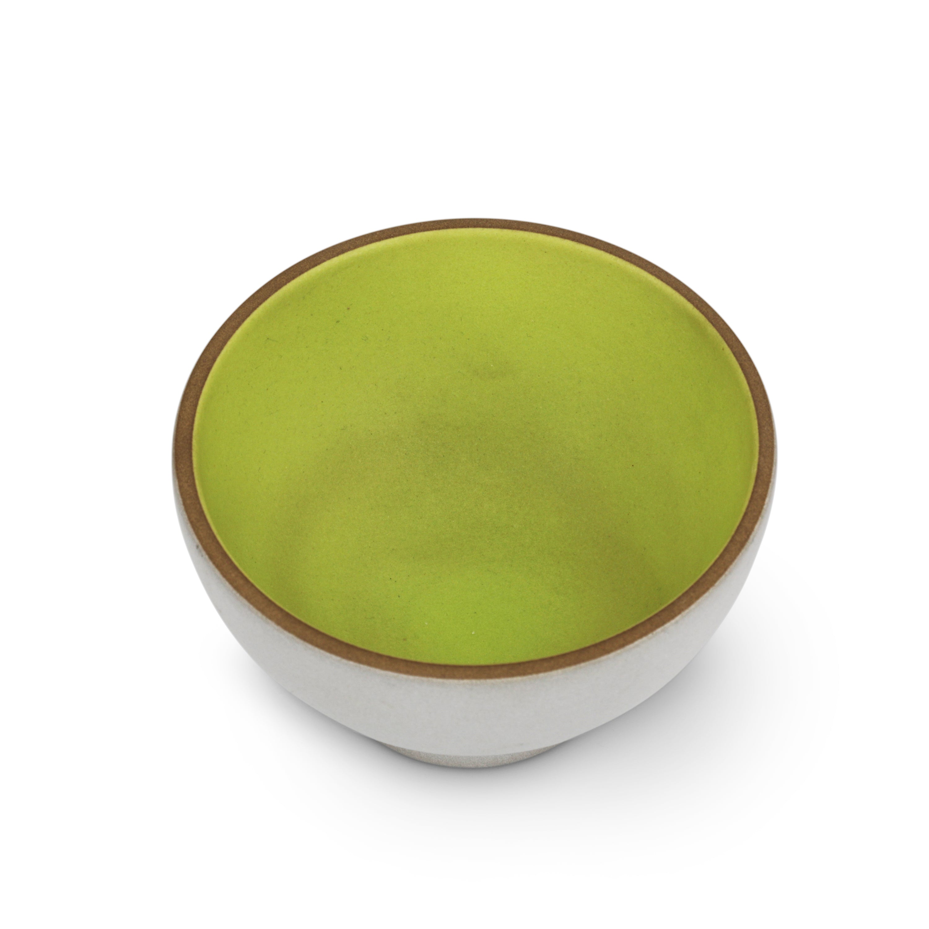 Details: Grey ceramic bowls with green interior and brown rim. Dimensions: 3" H x 5" D Quantity: 4