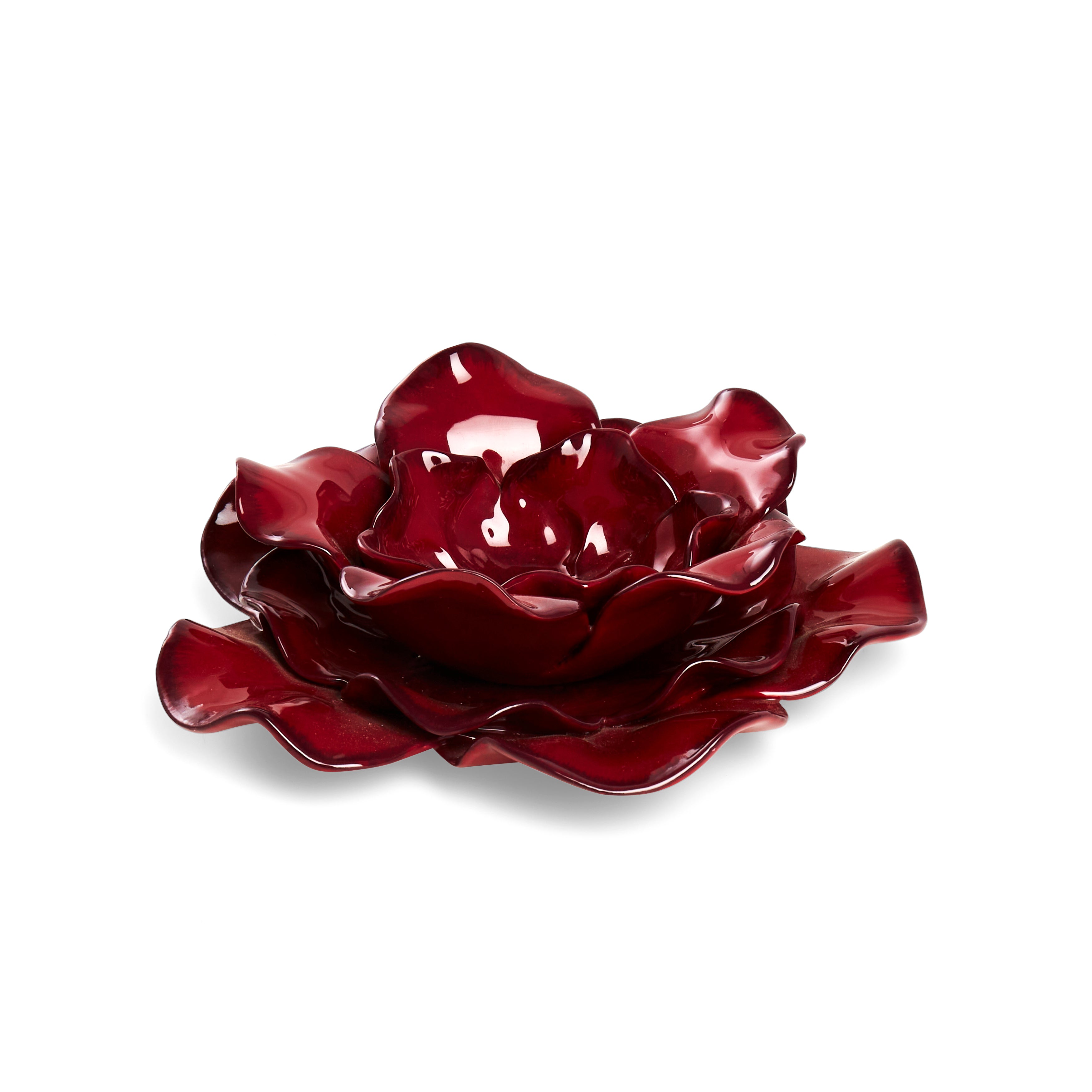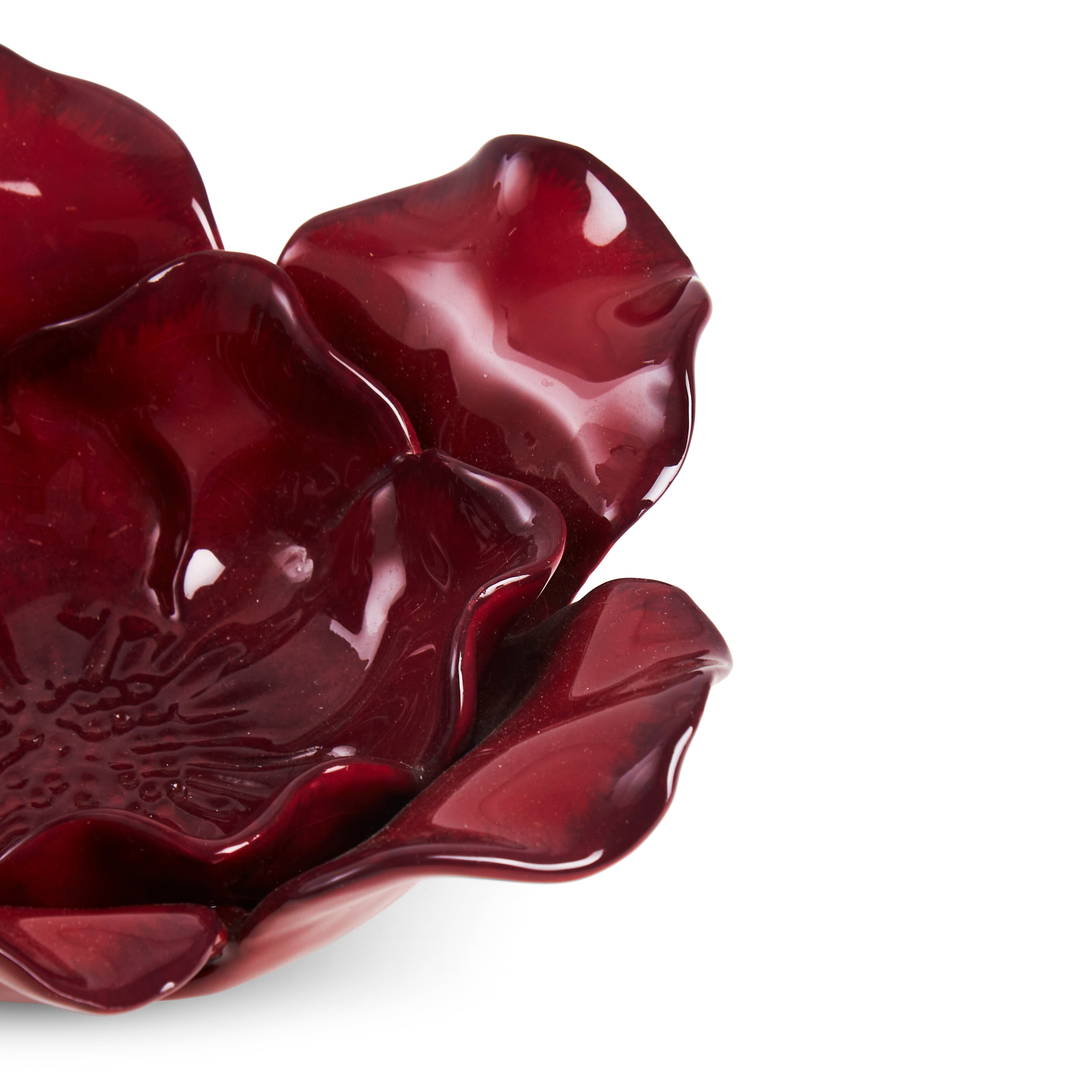 Details: Red ceramic tray shaped like a flower Dimensions: 1" H x 9" D Matching stackable bowl available. Item Number - 41544