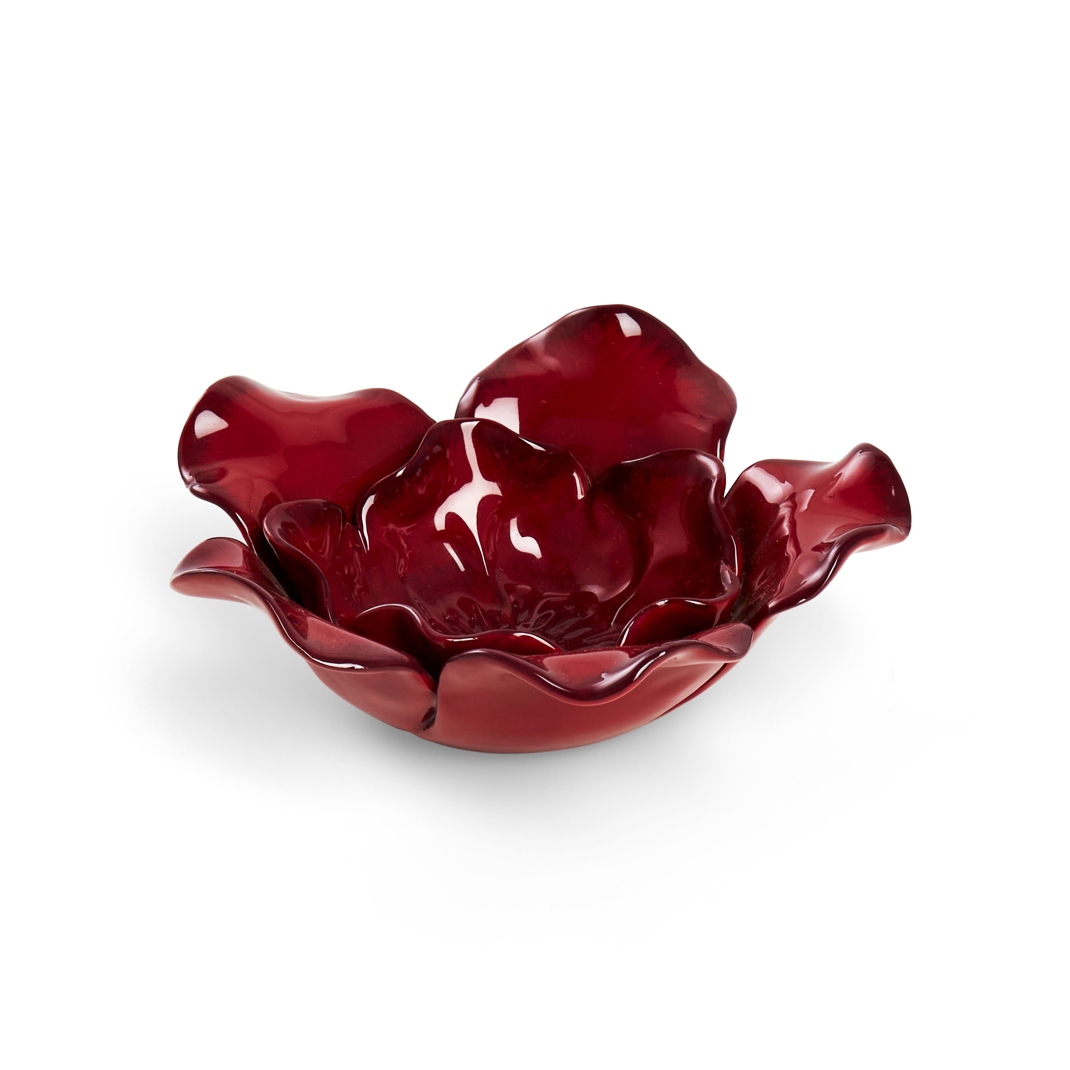 Details: Red glass bowl shaped like a flower Dimensions: 2" H x 7" D Matching stackable tray available. Item Number - 41540