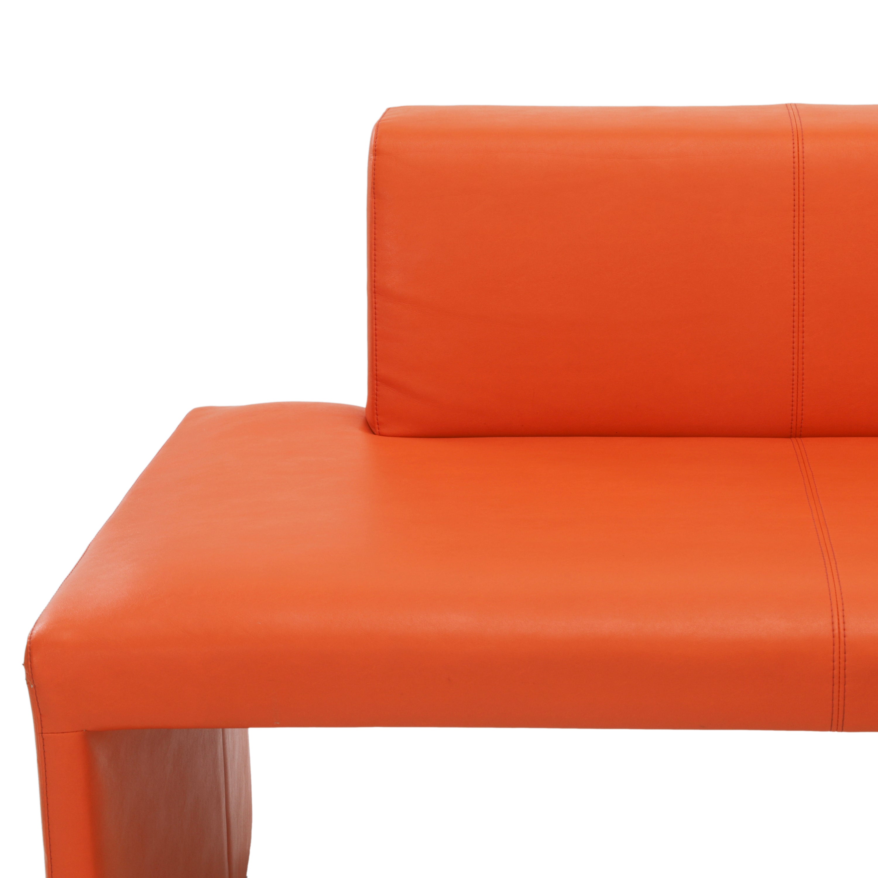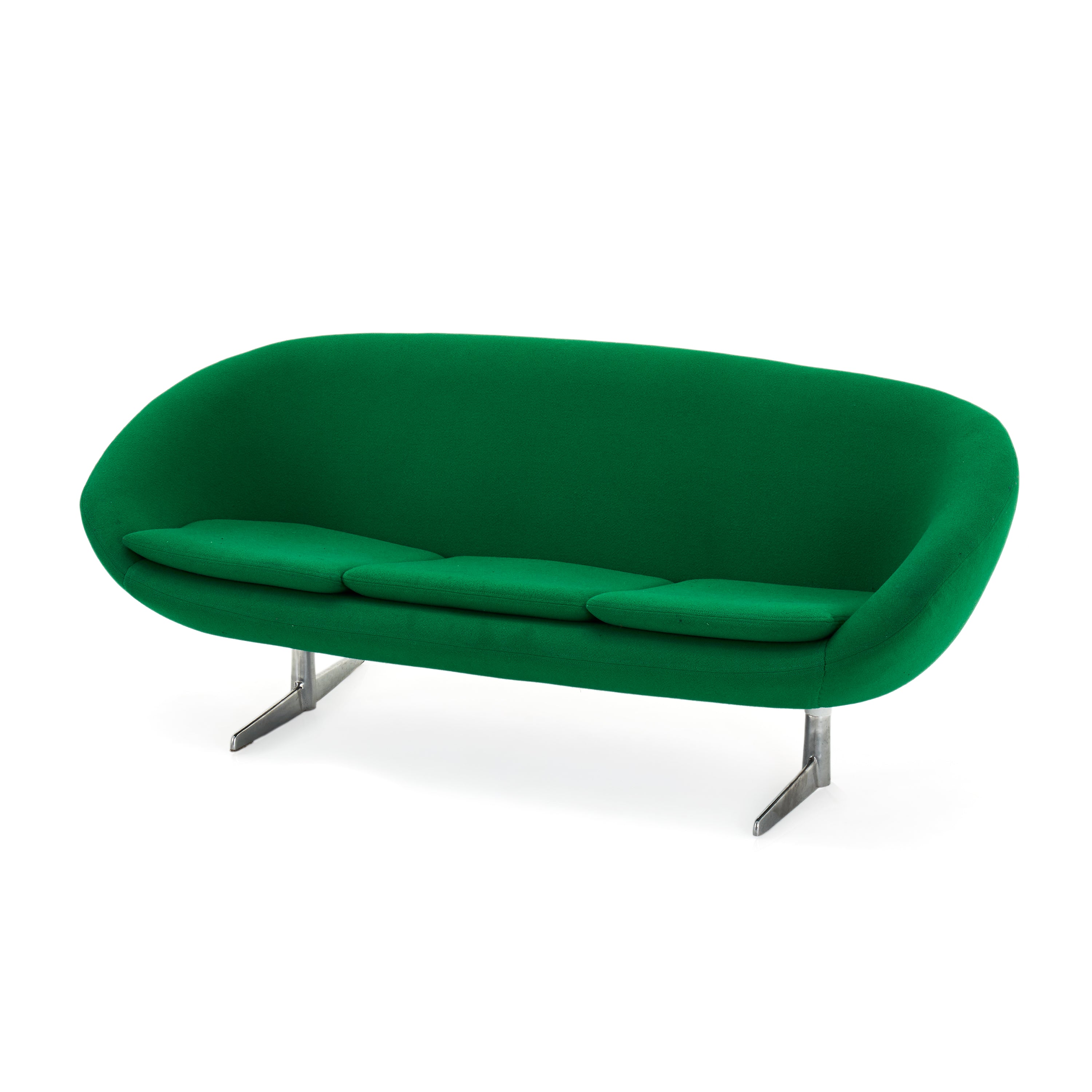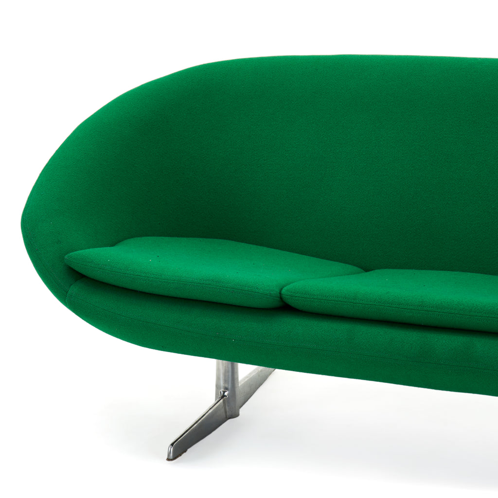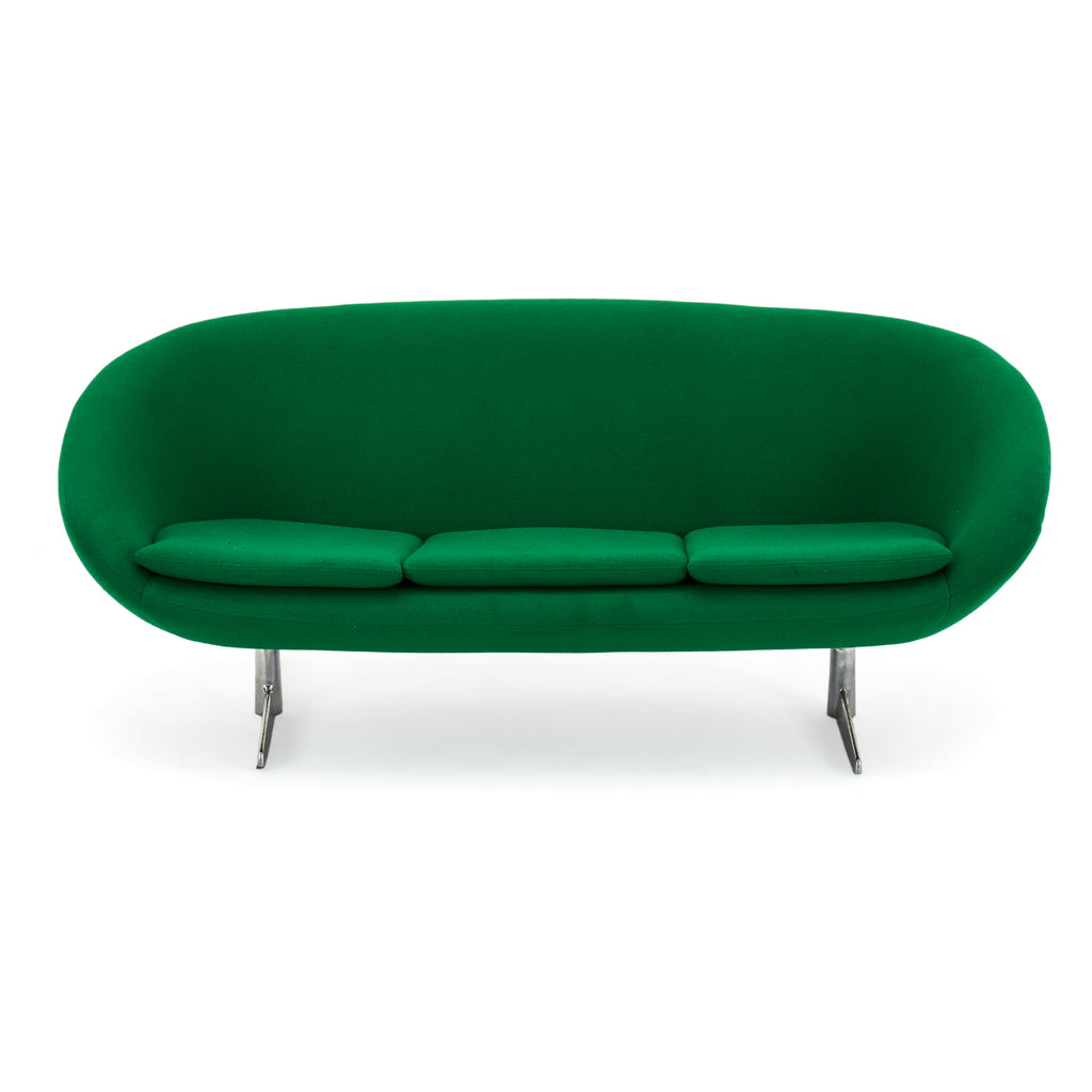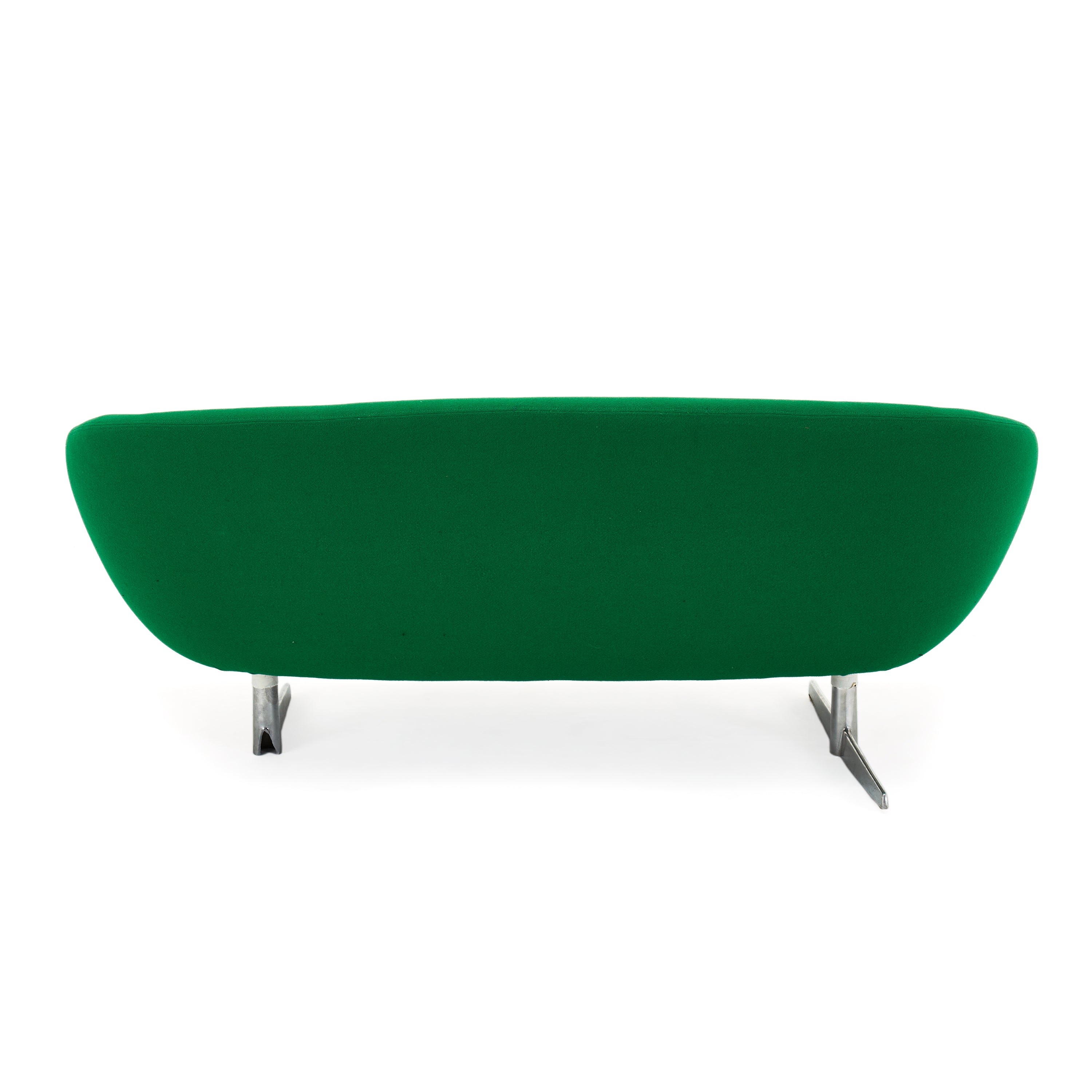 Details: Curved turquoise futuristic lounge chair with rounded grey metal base. Piece is constructed of leather upholstery, with polished metal legs. Dimensions: 36" H x 88"...