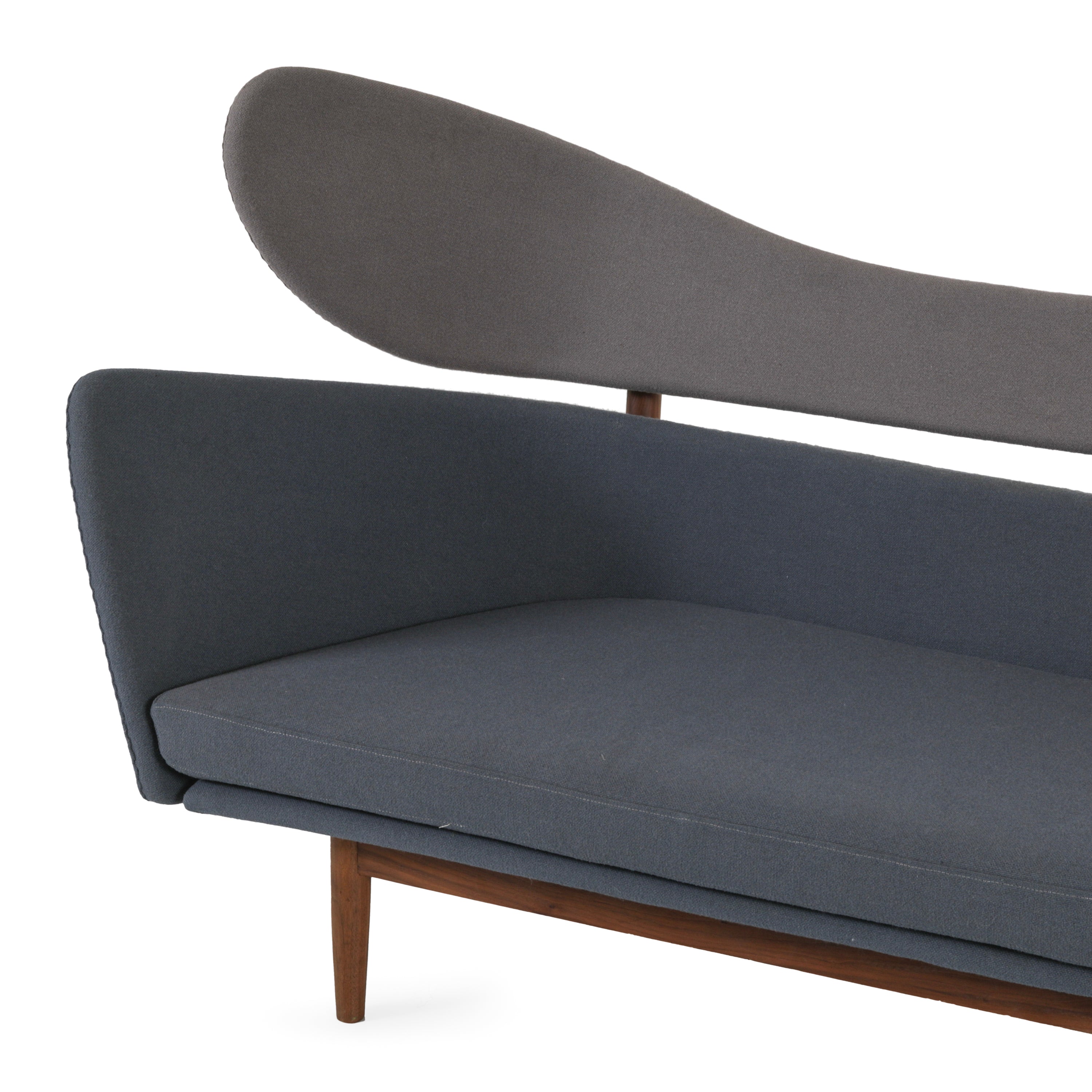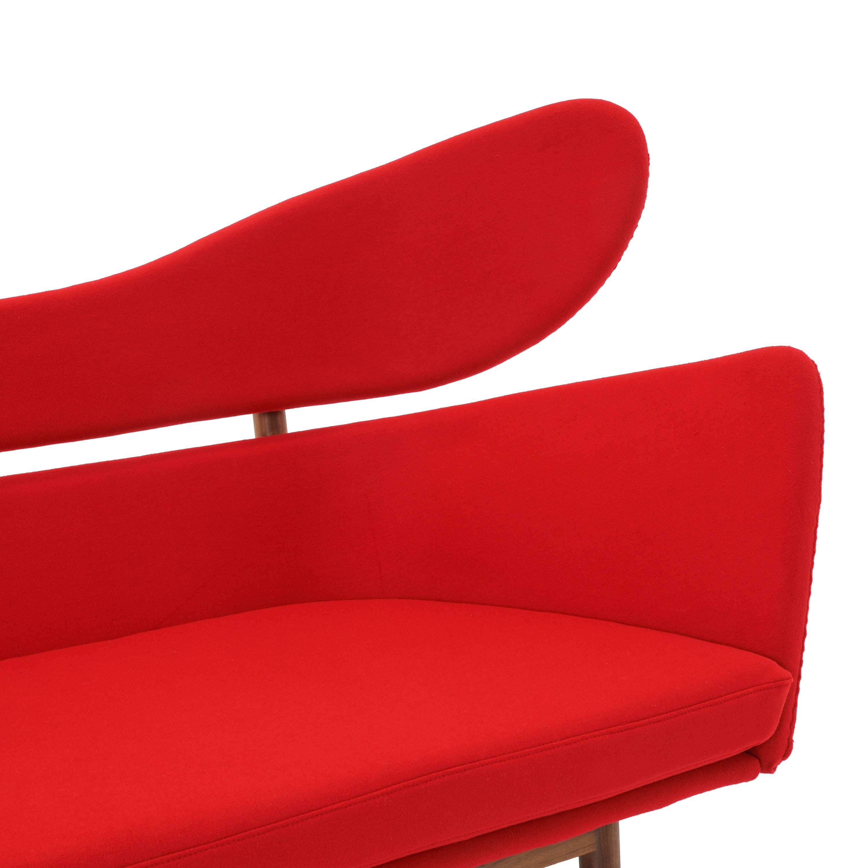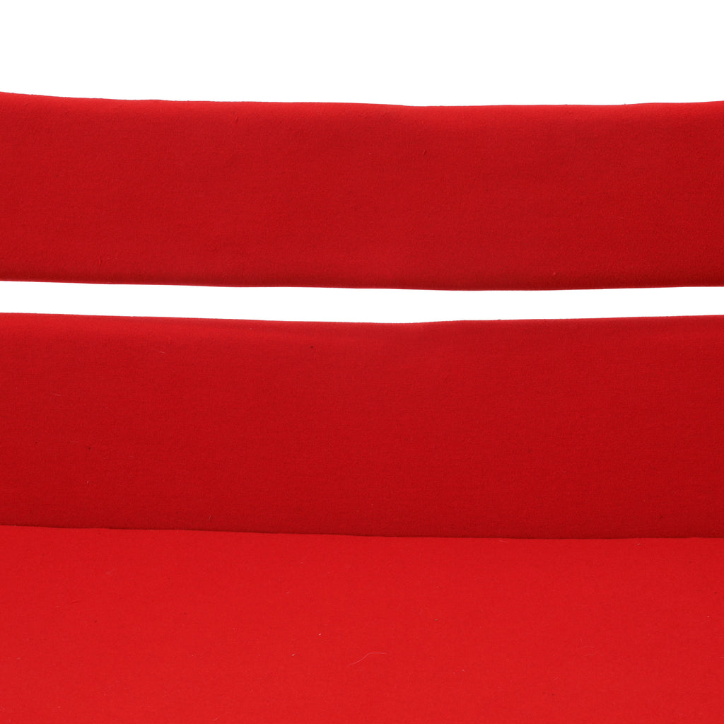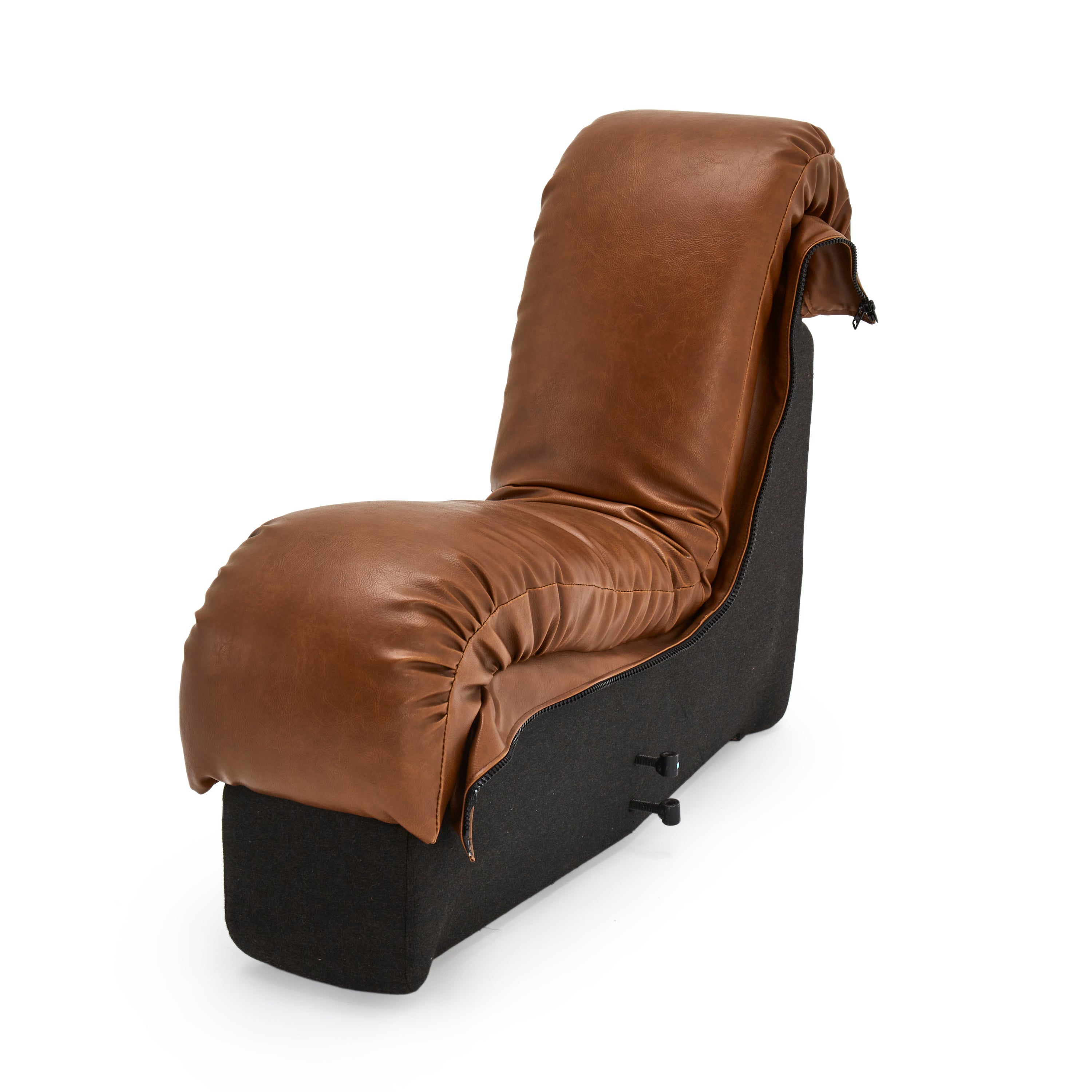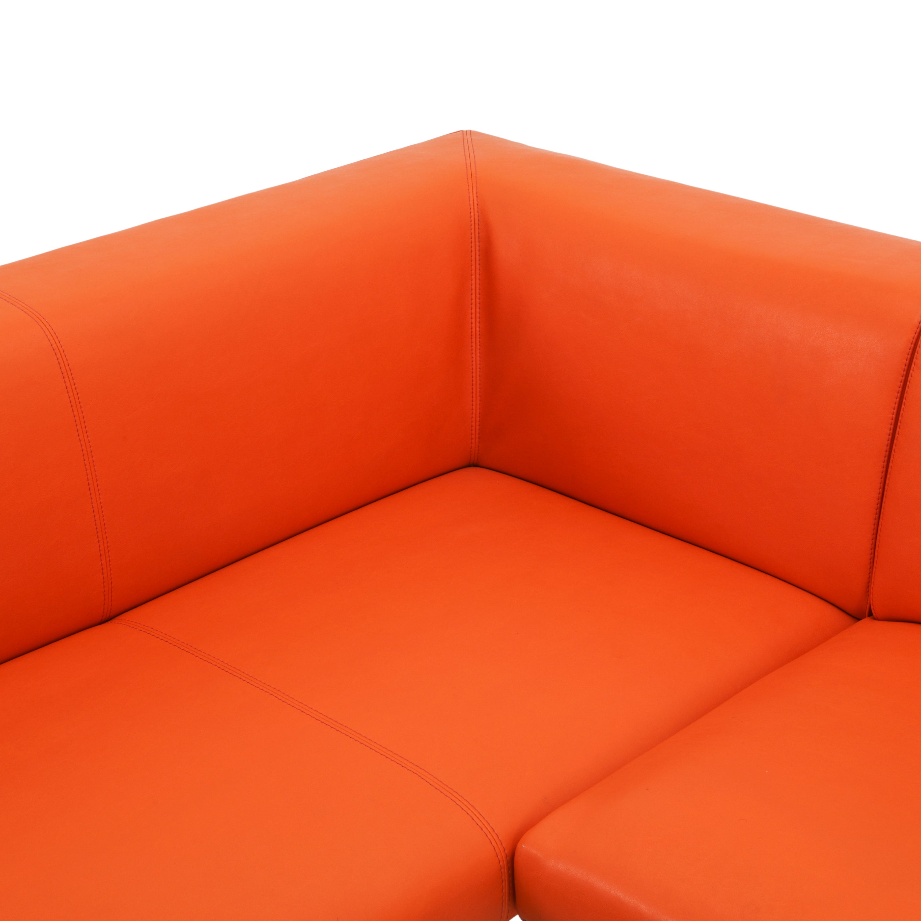 Details: Curved turquoise futuristic lounge chair with rounded grey metal base. Piece is constructed of leather upholstery, with polished metal legs. Dimensions: 36" H x 88"...
