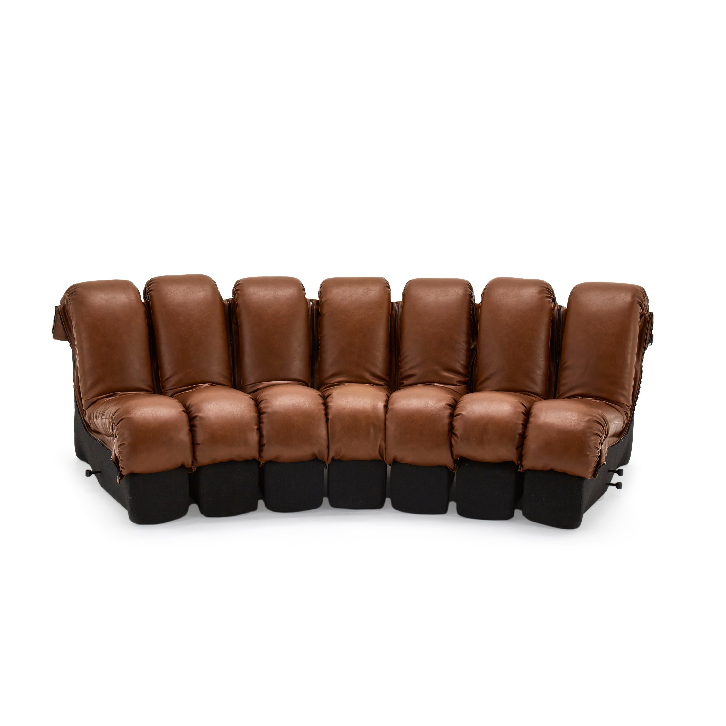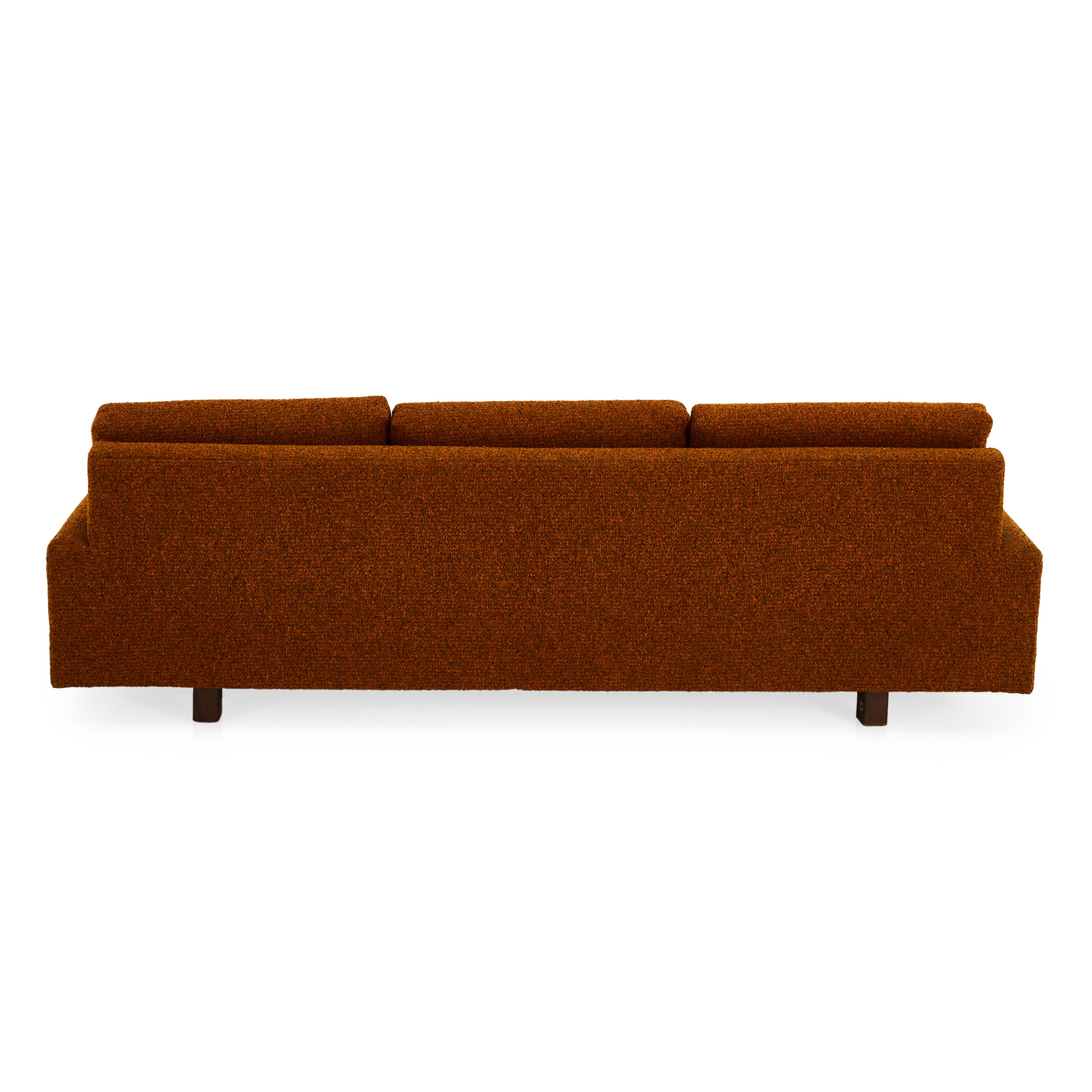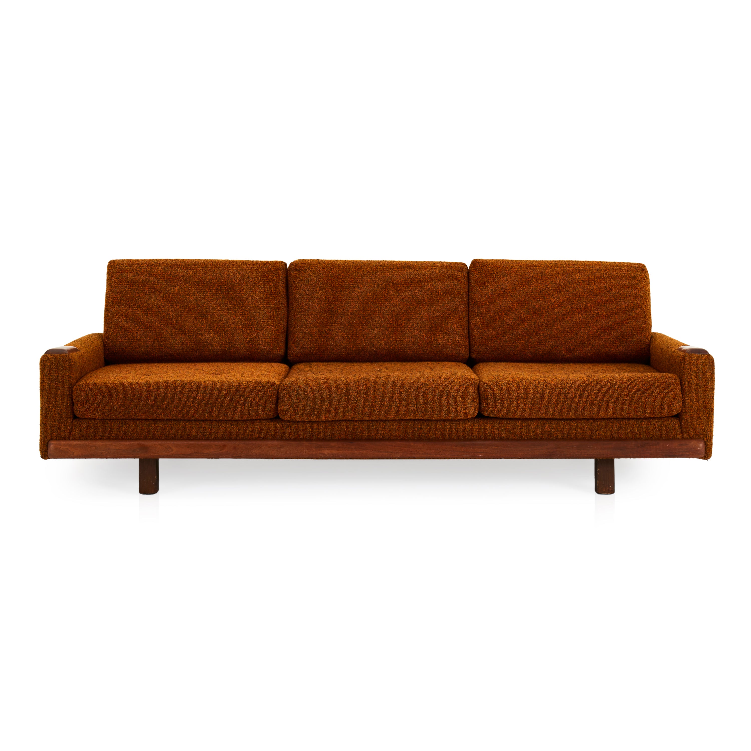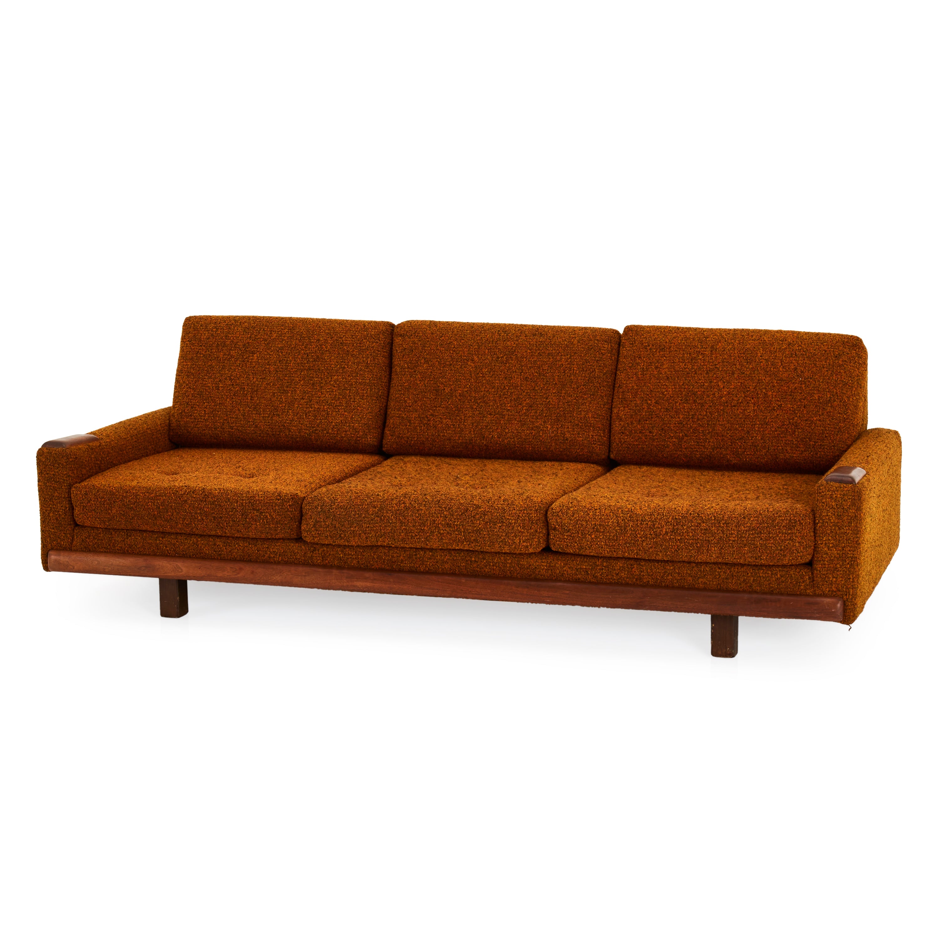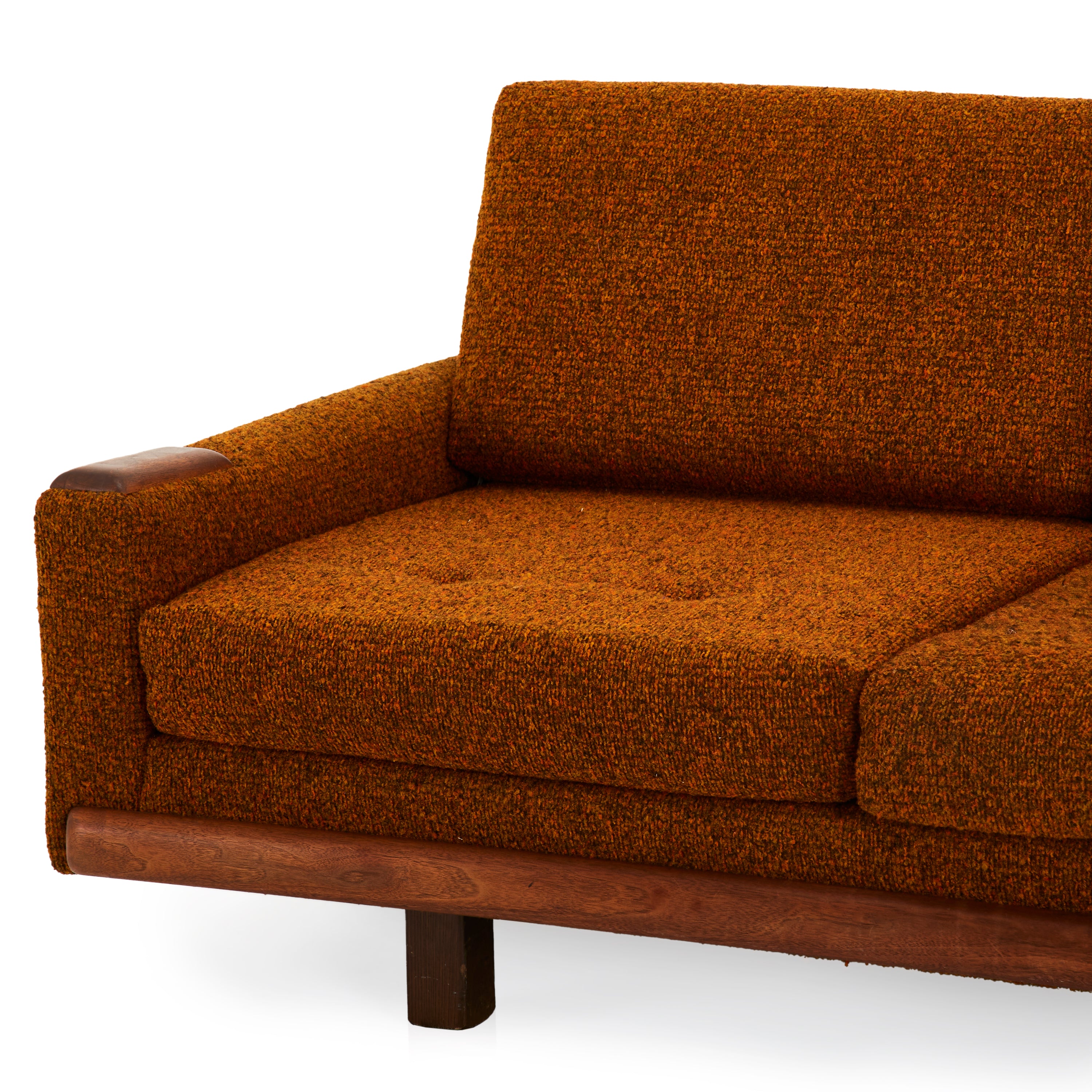 Details: Brown upholstered sofa with unique curved armchair style; by Steve Leonard for Brayton International. (Recently reupholstered). Dimensions: 24" H x 98" W x 32"...
