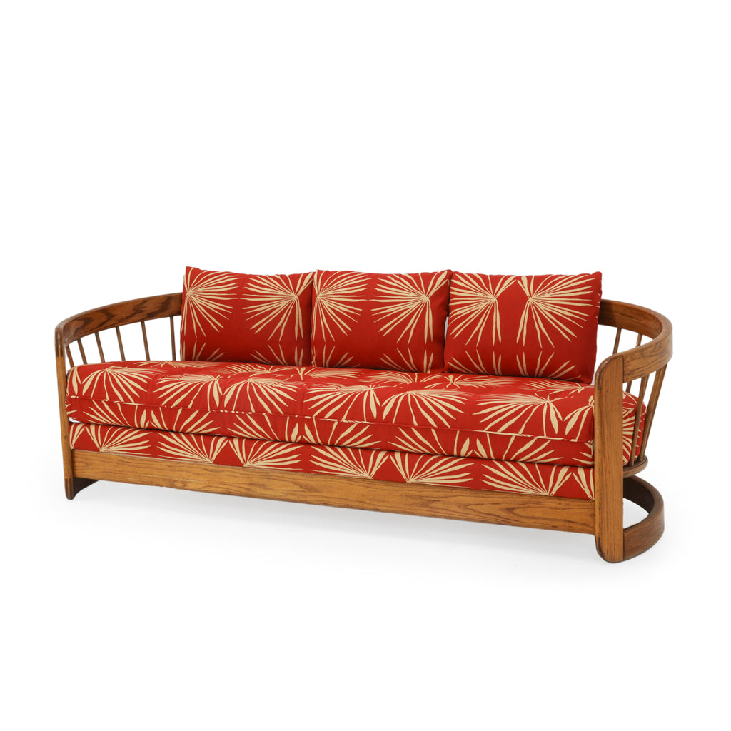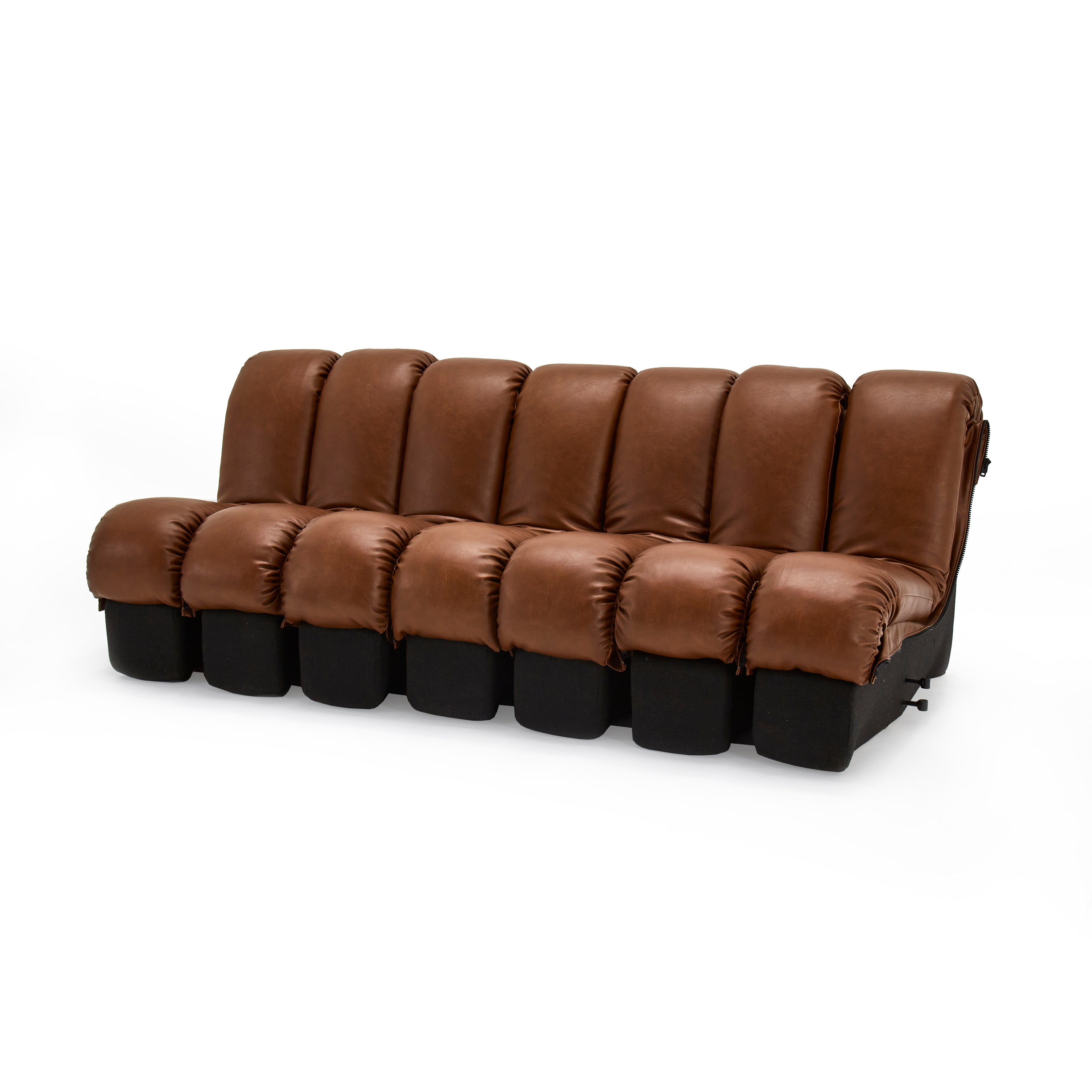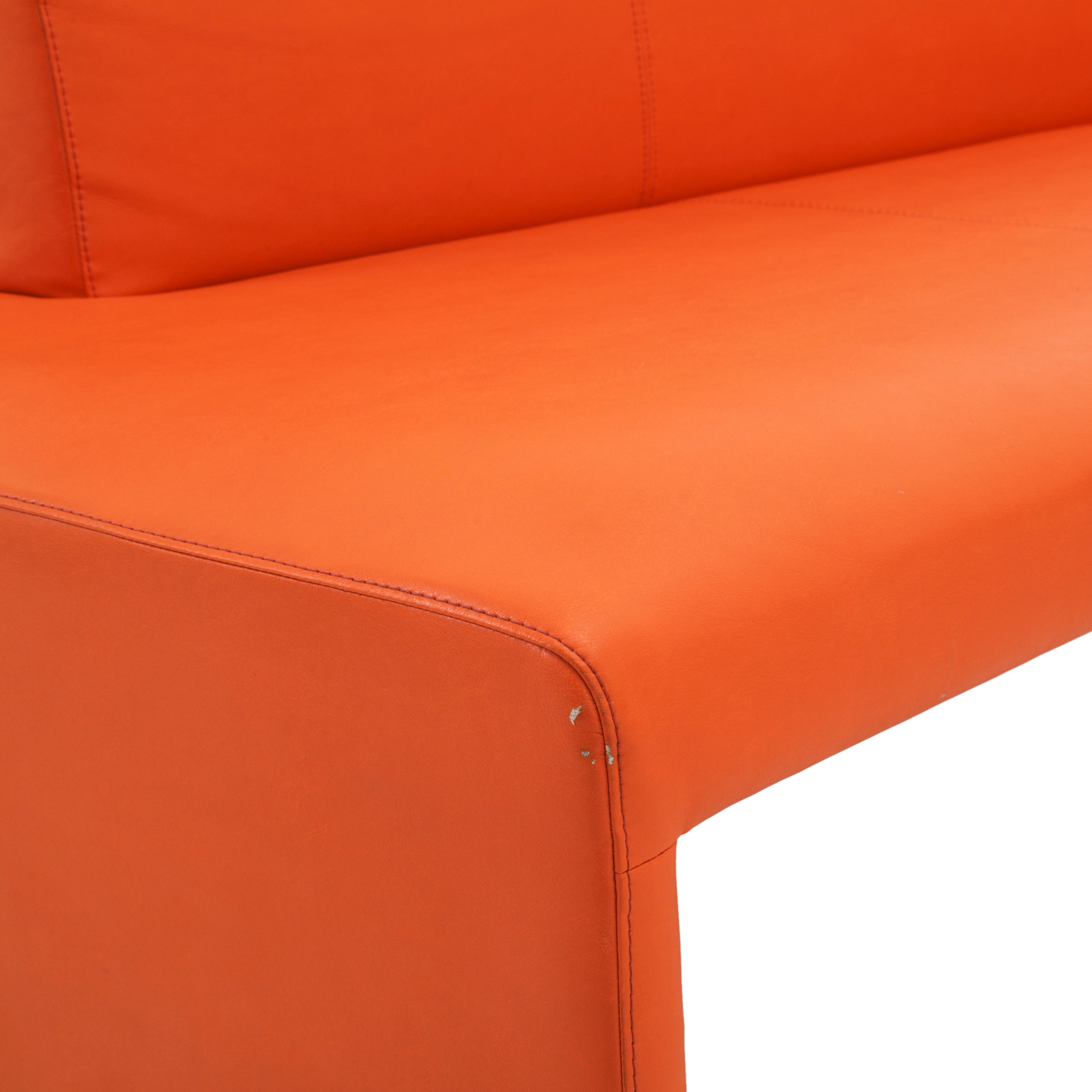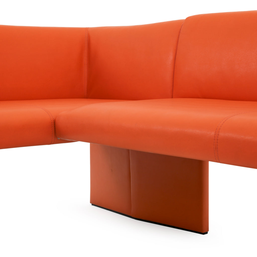 Details: Brown upholstered sofa with unique curved armchair style; by Steve Leonard for Brayton International. (Recently reupholstered). Dimensions: 24" H x 98" W x 32"...