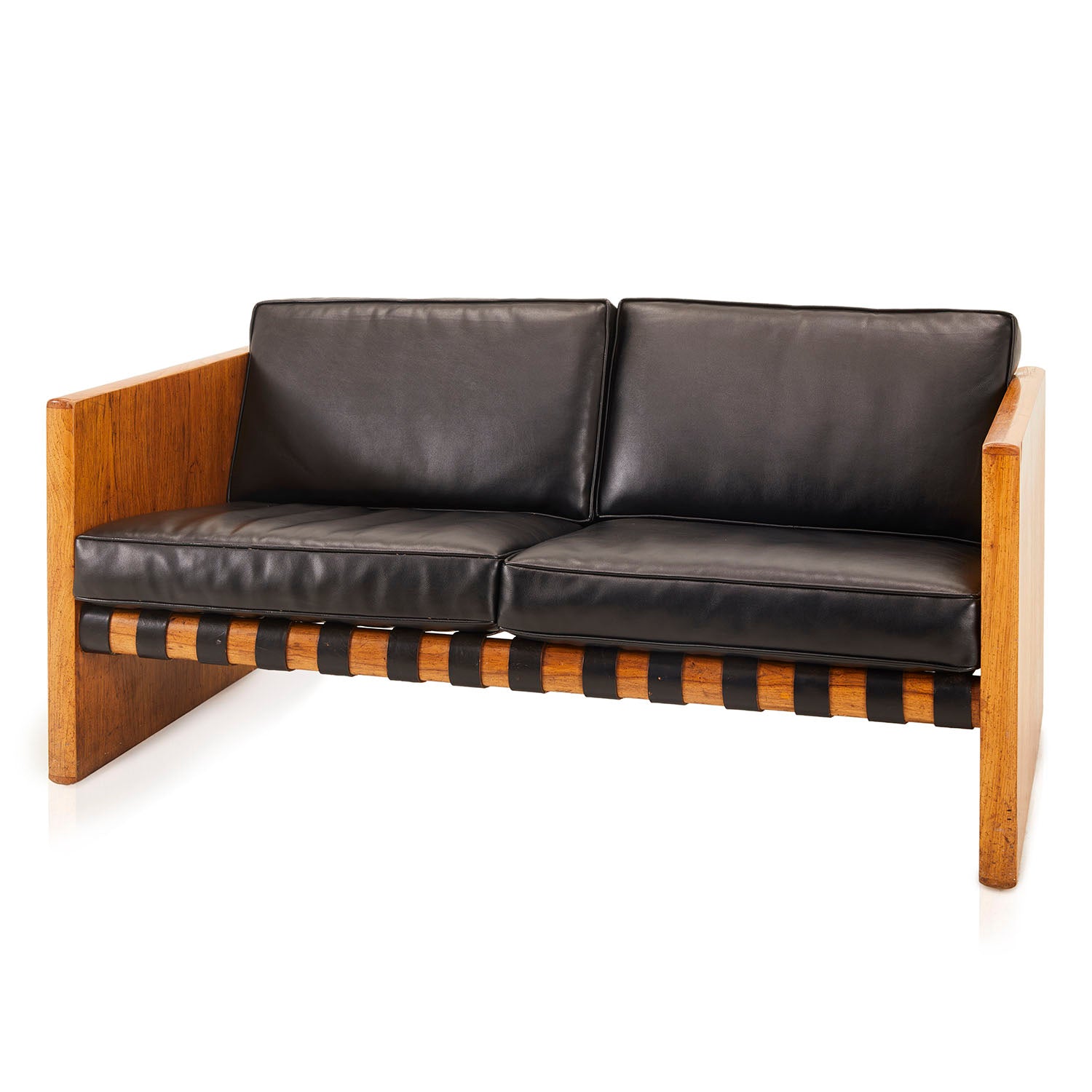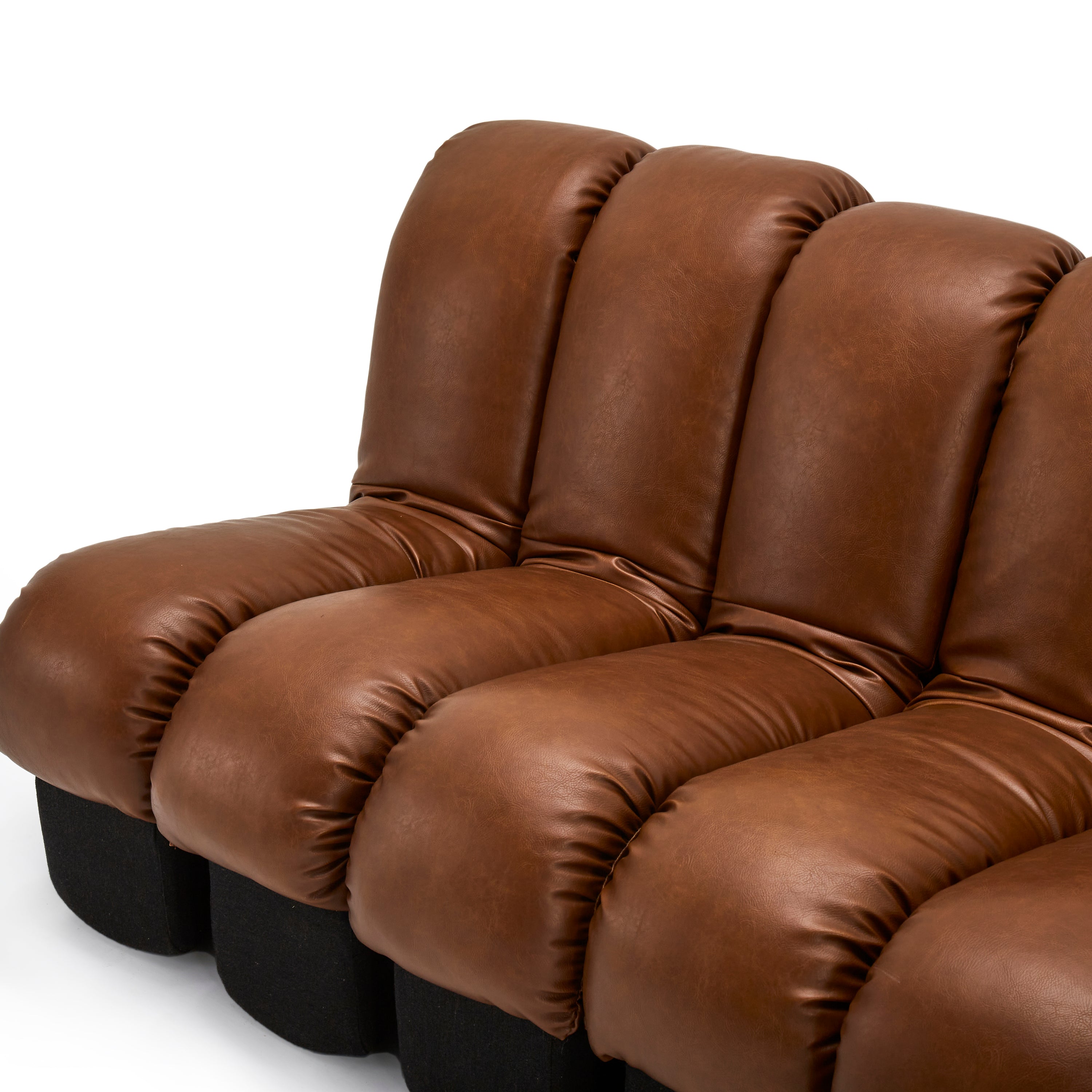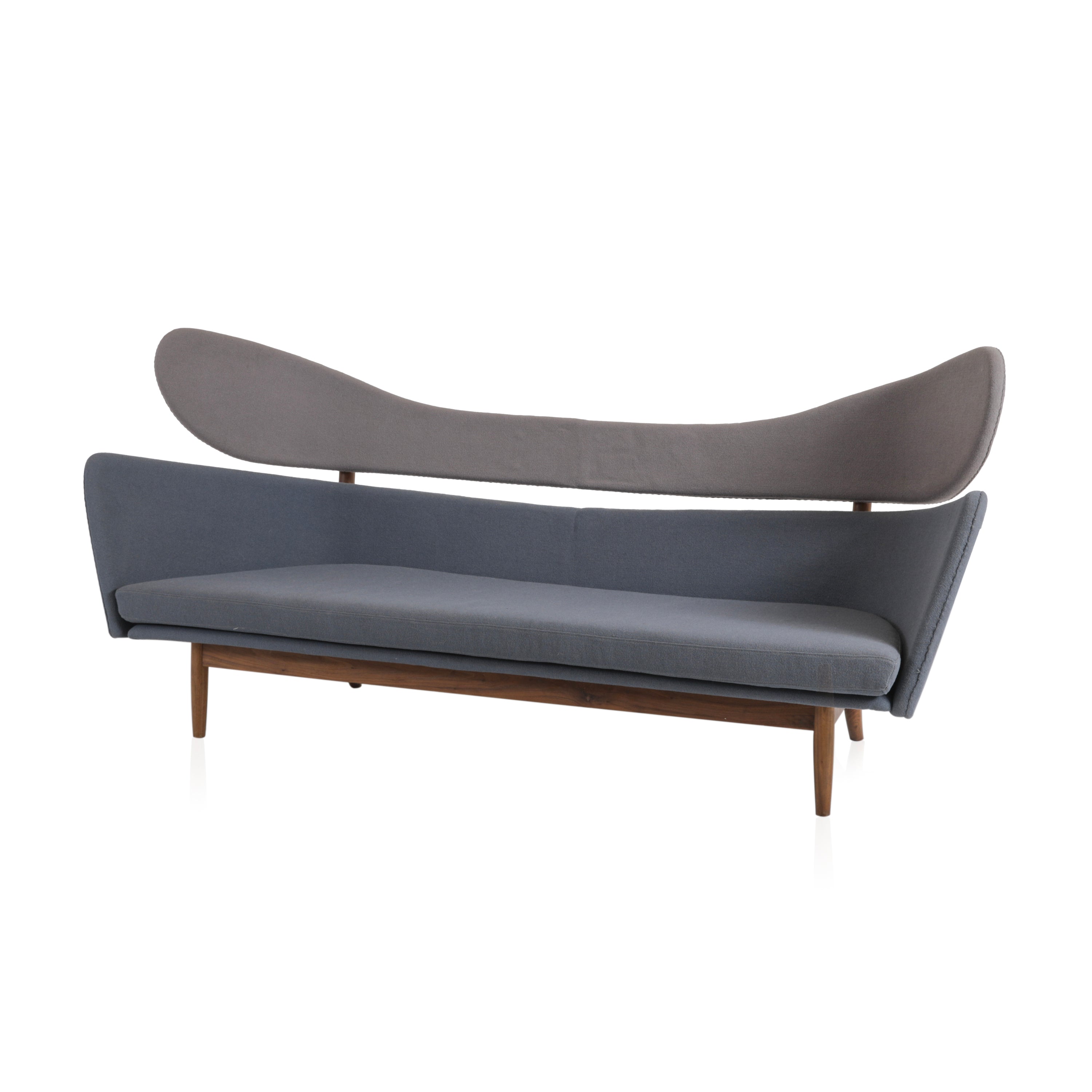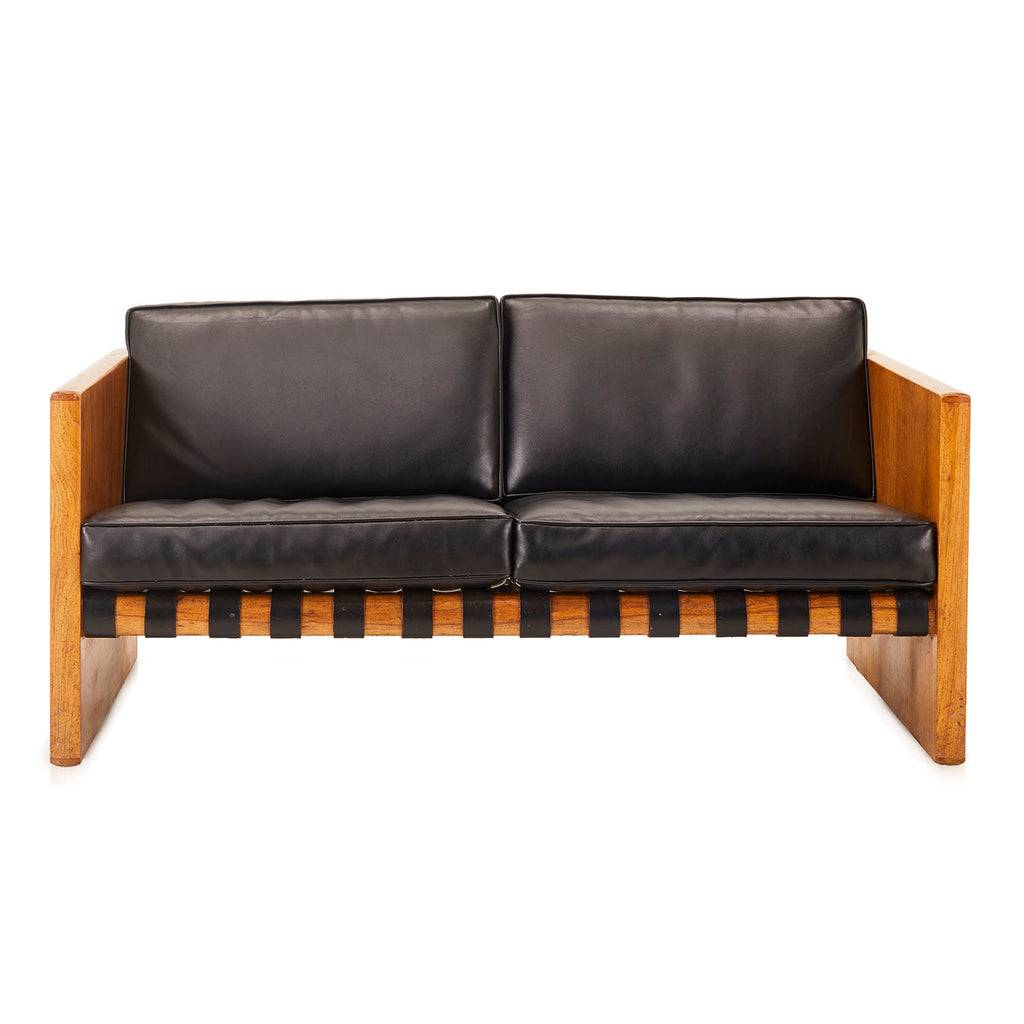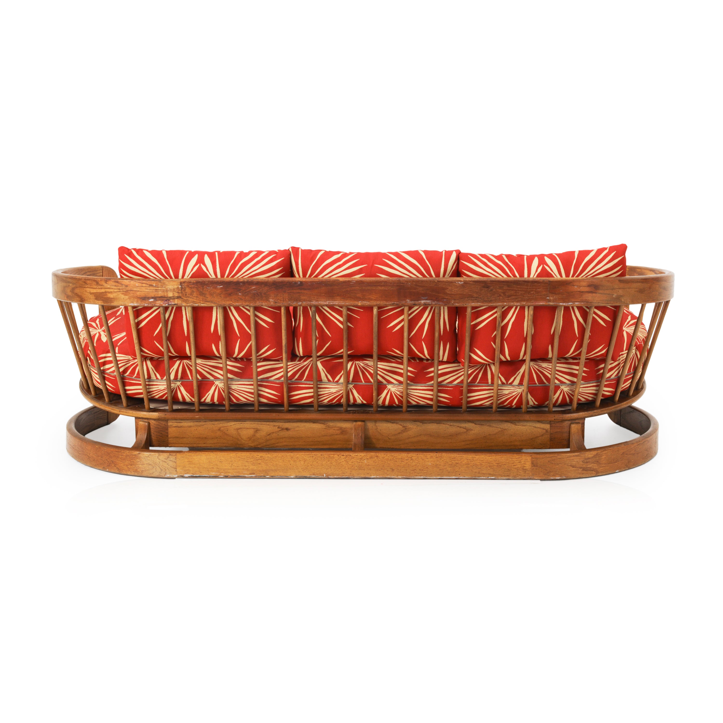 Details: Brown upholstered sofa with unique curved armchair style; by Steve Leonard for Brayton International. (Recently reupholstered). Dimensions: 24" H x 98" W x 32"...