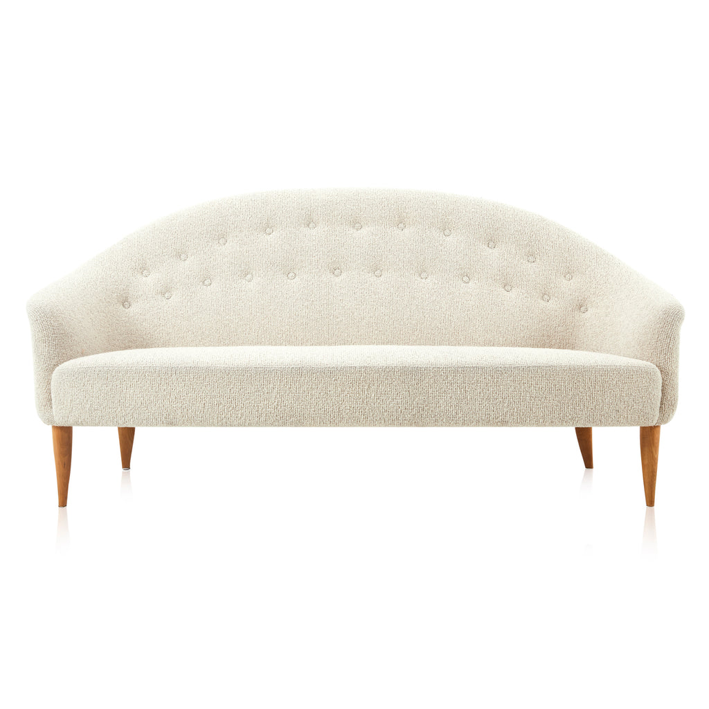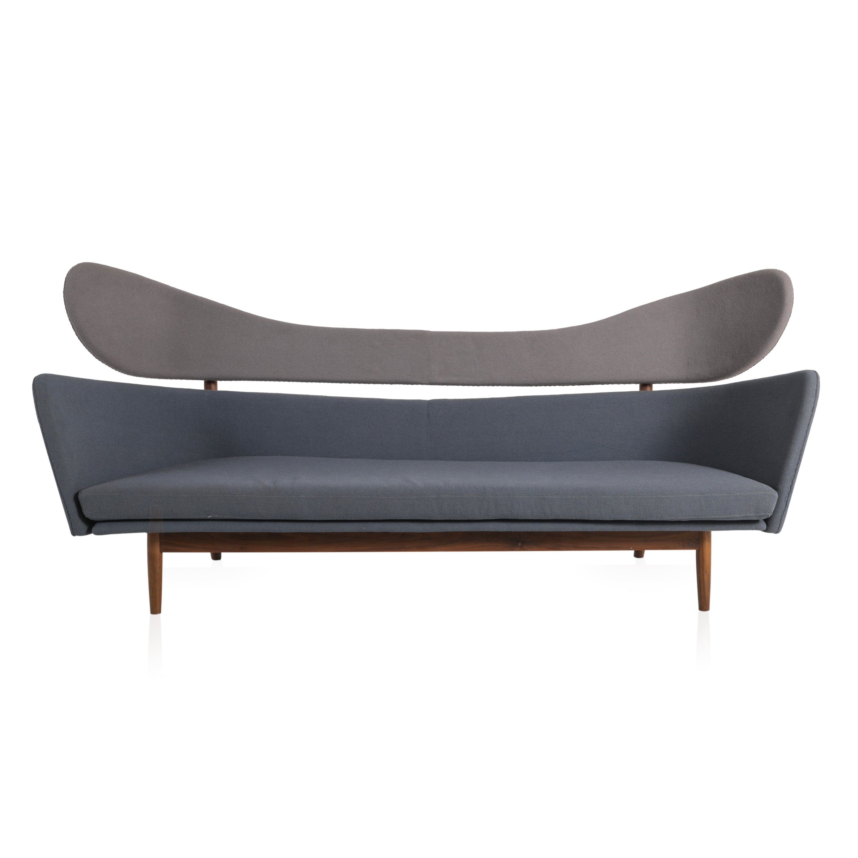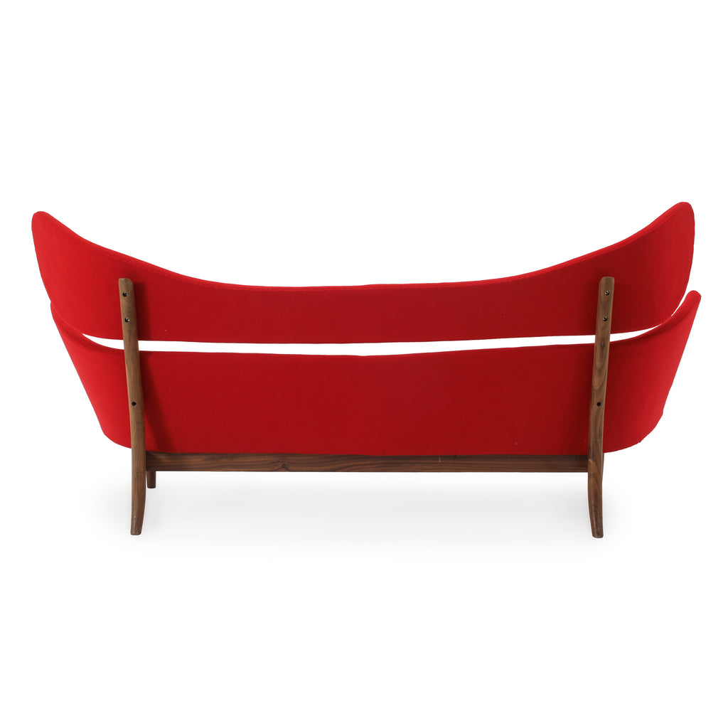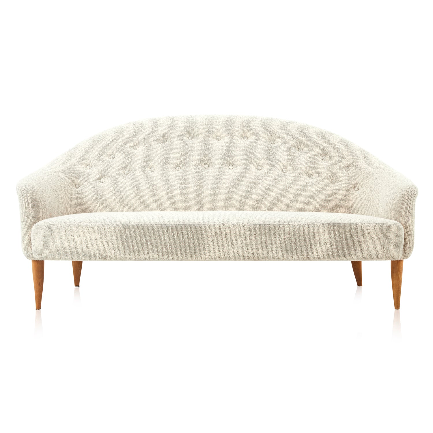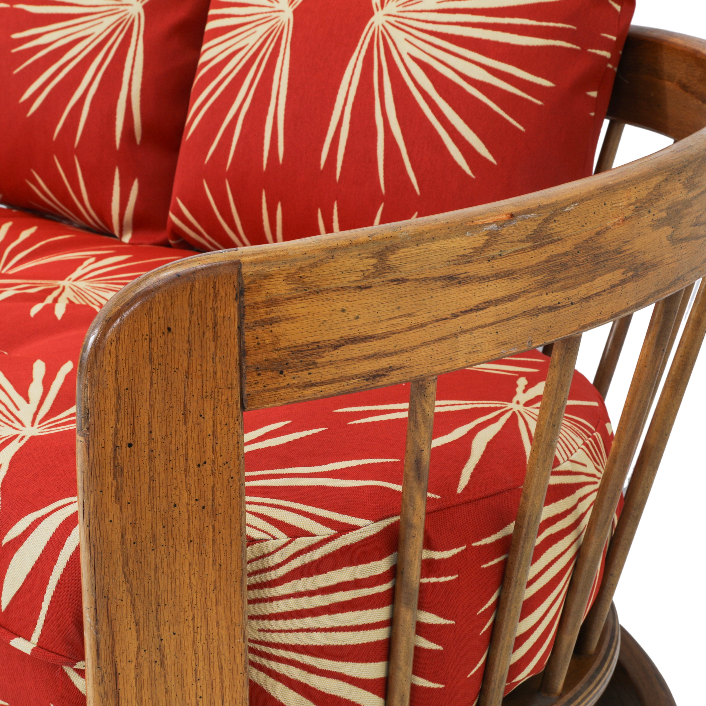Details: Brown upholstered sofa with unique curved armchair style; by Steve Leonard for Brayton International. (Recently reupholstered). Dimensions: 24" H x 98" W x 32"...