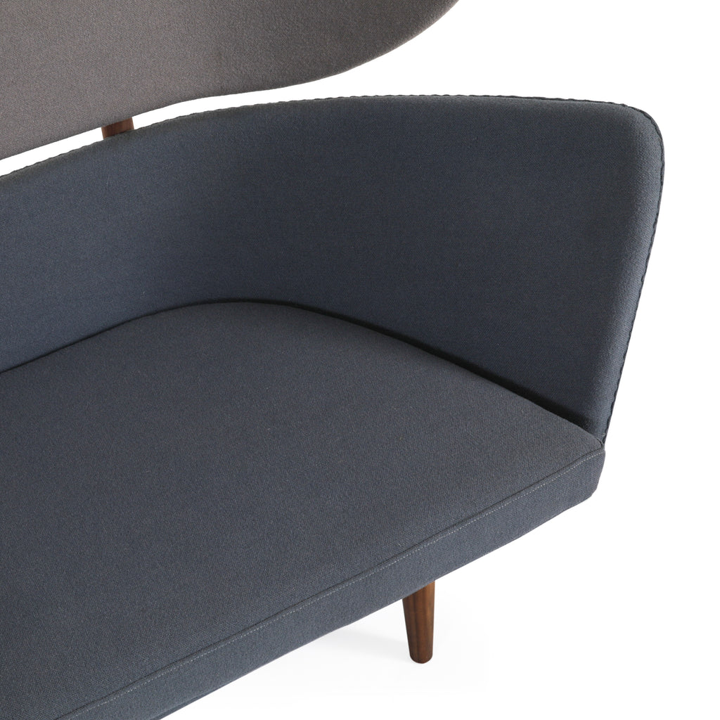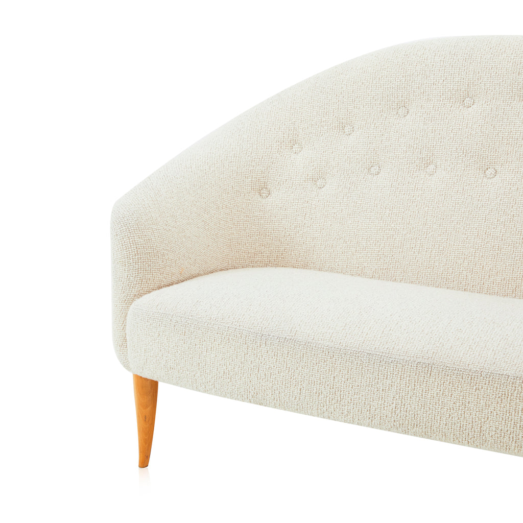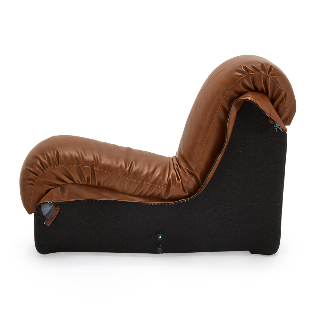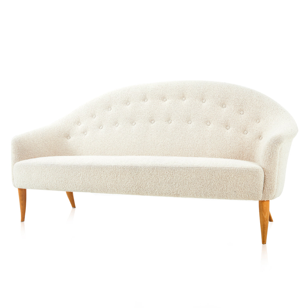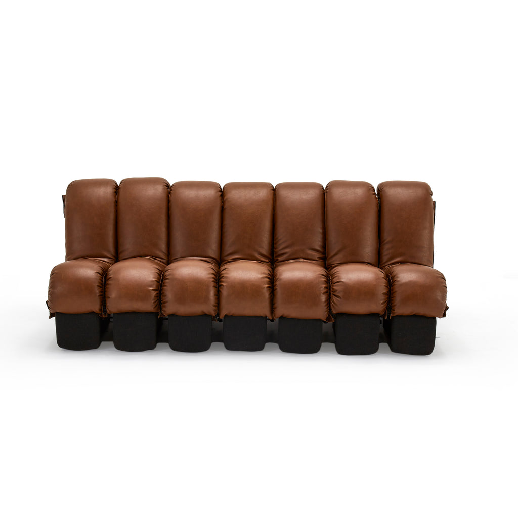 Details: Brown upholstered sofa with unique curved armchair style; by Steve Leonard for Brayton International. (Recently reupholstered). Dimensions: 24" H x 98" W x 32"...