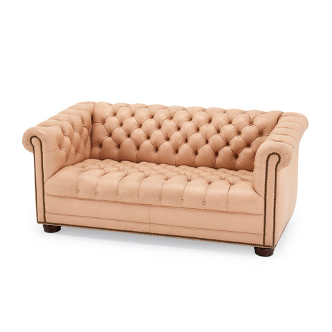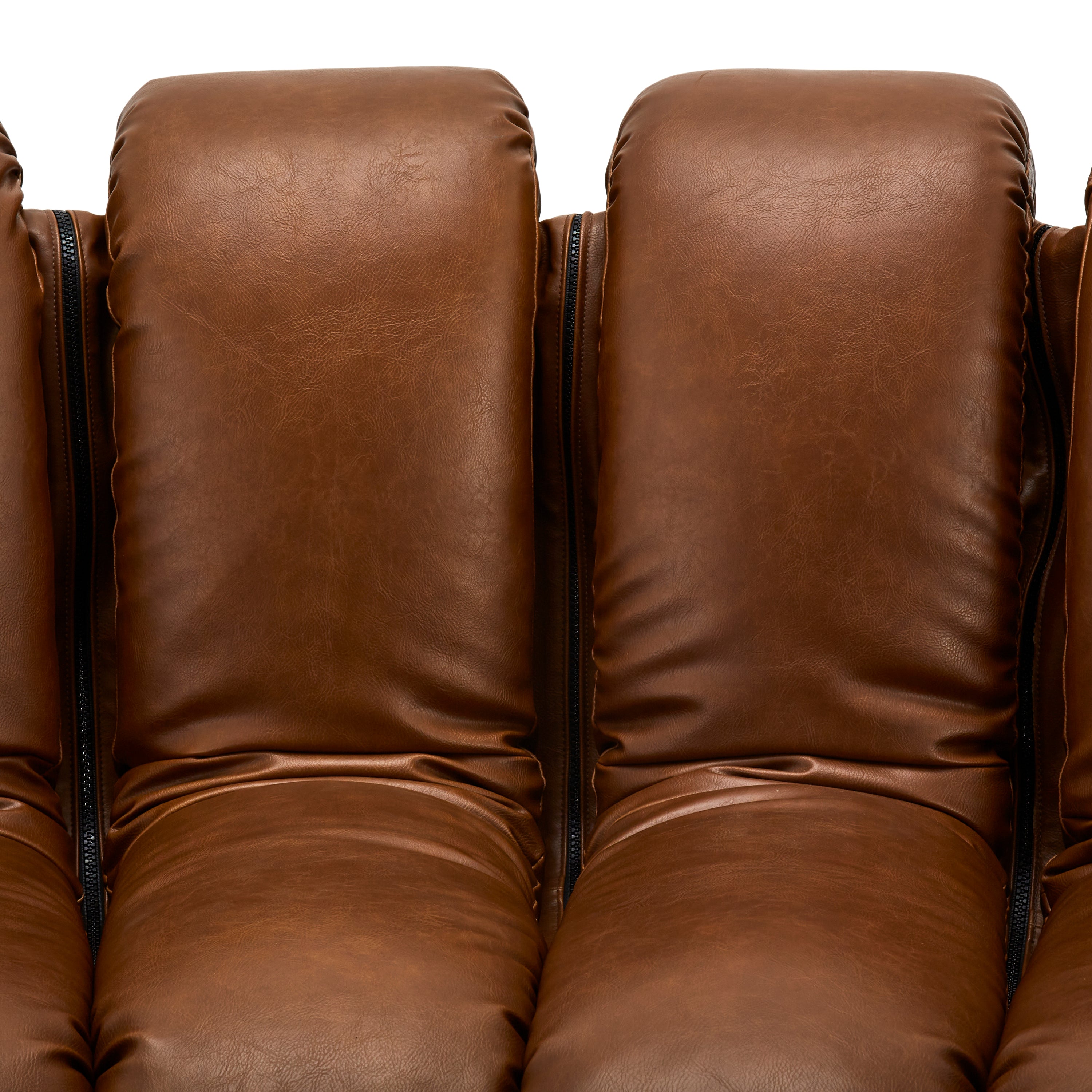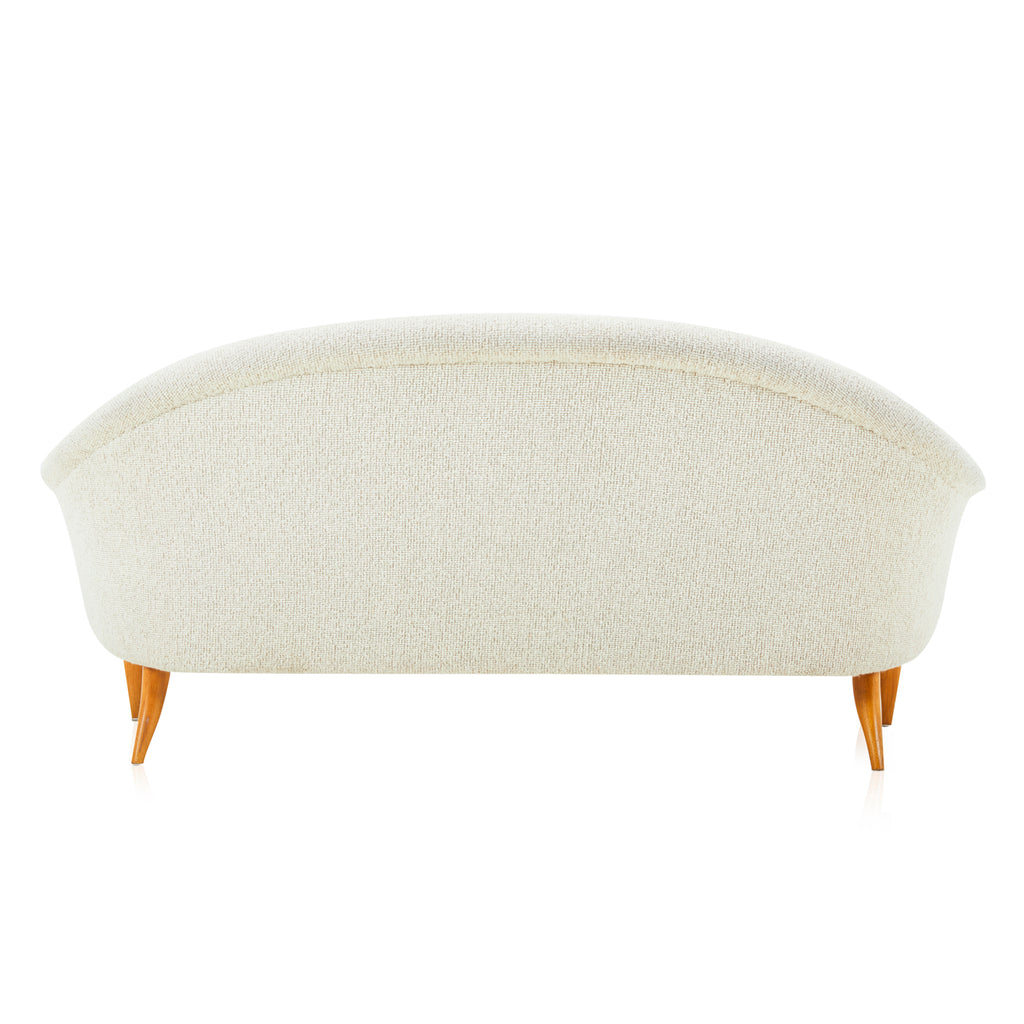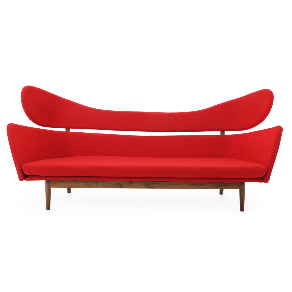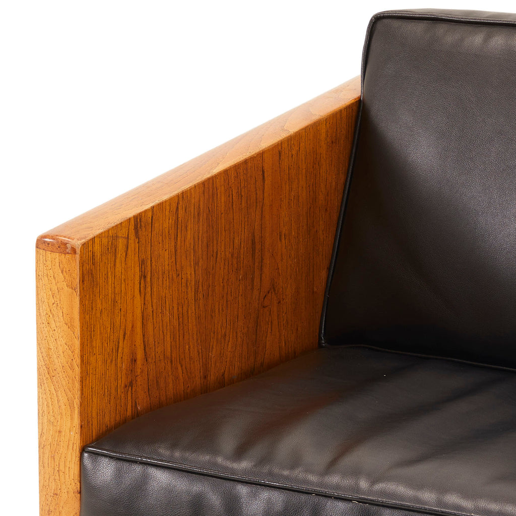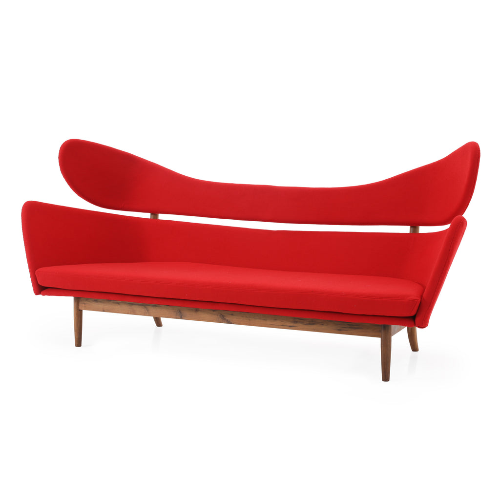 Details: Brown upholstered sofa with unique curved armchair style; by Steve Leonard for Brayton International. (Recently reupholstered). Dimensions: 24" H x 98" W x 32"...