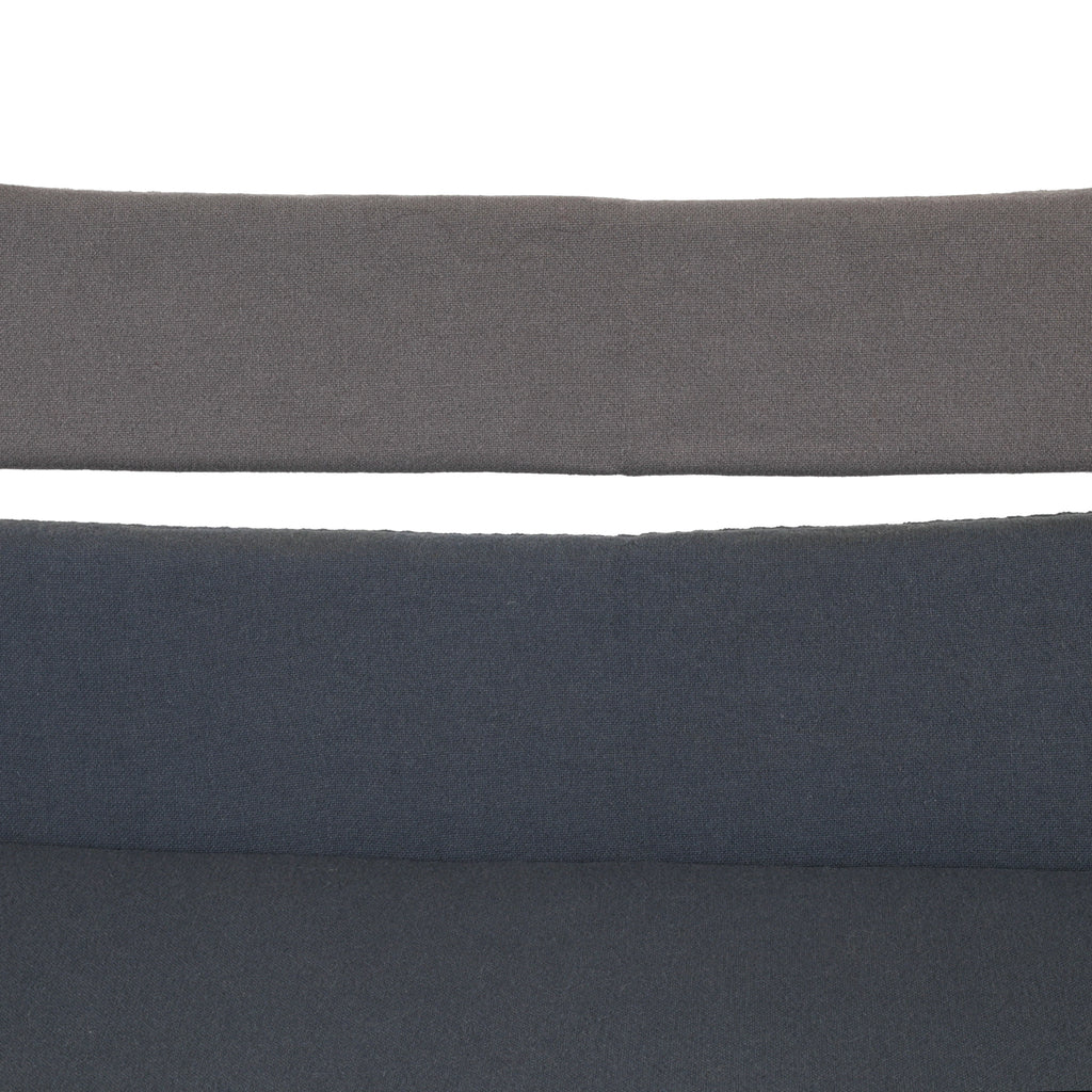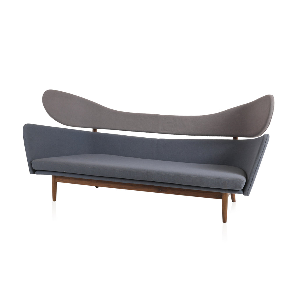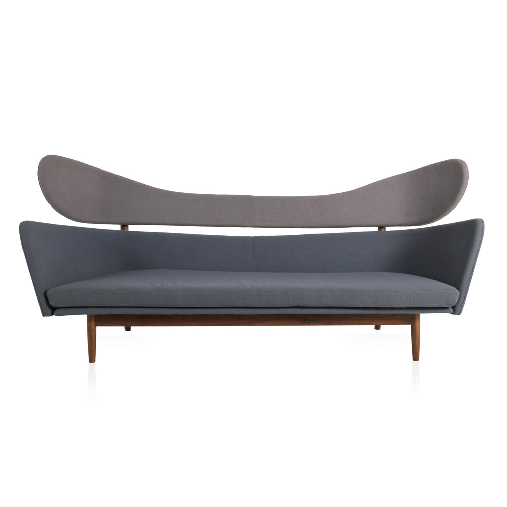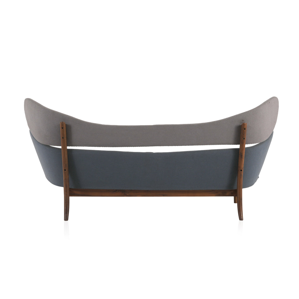 Details: Art deco style blue velvet sofa with stepped wood and grey upholstery on back / sides. Wheels on bottom. Vintage piece with some wear, rented...