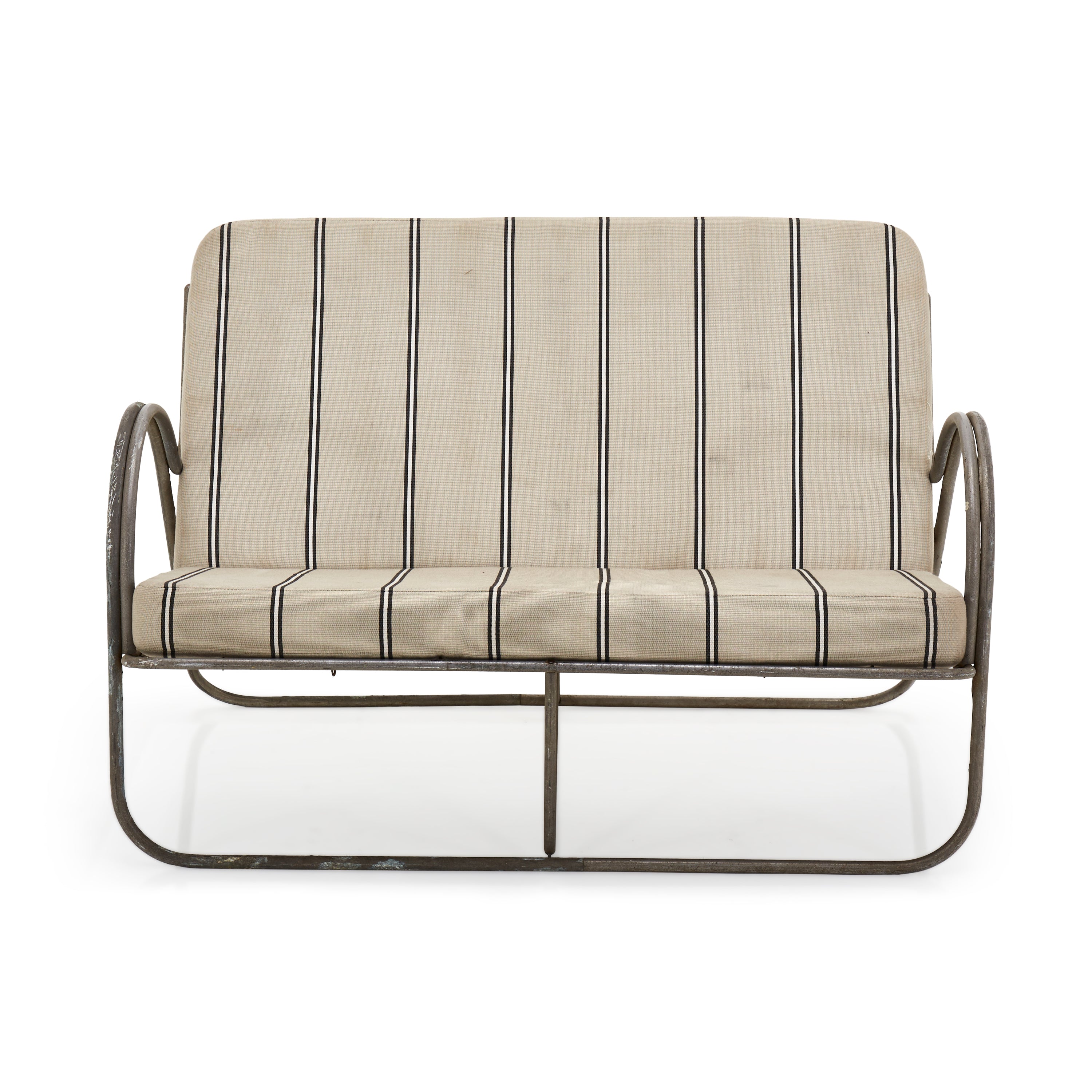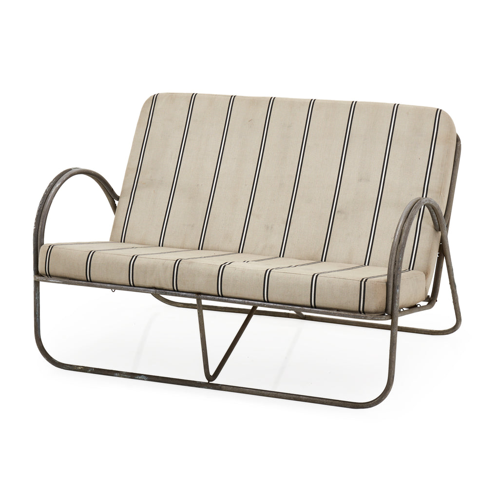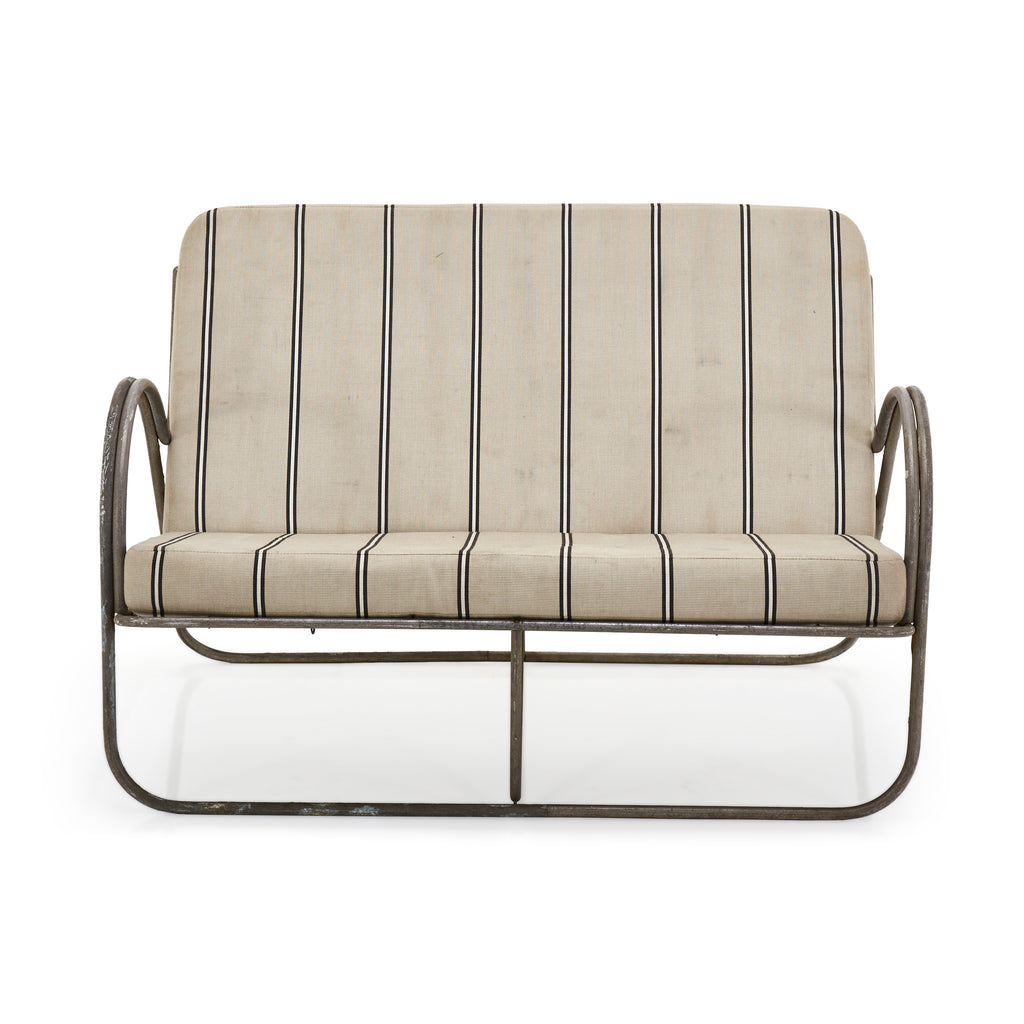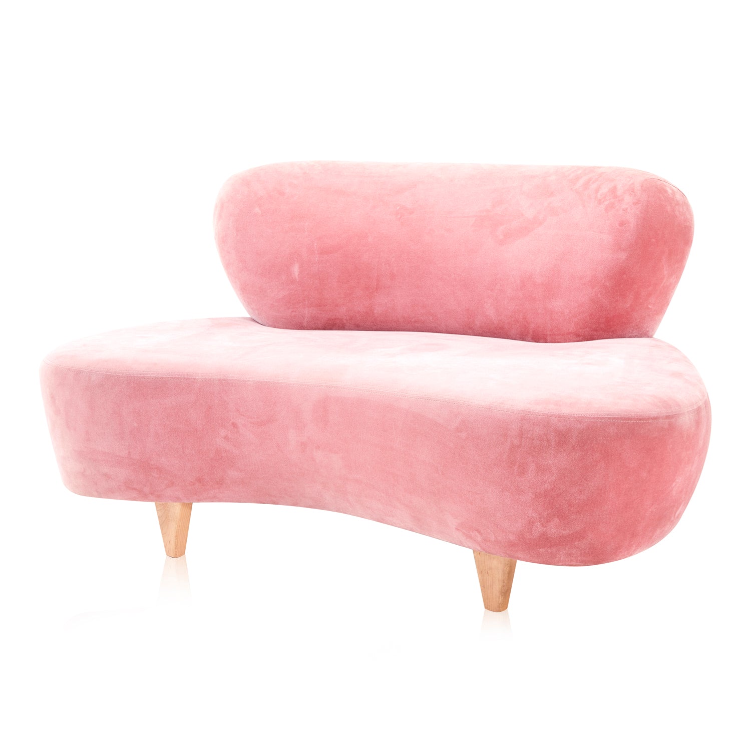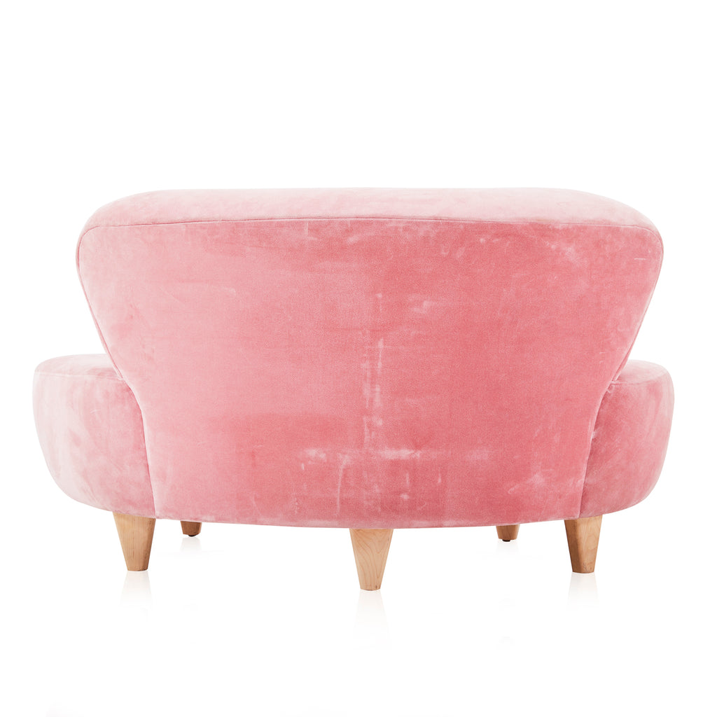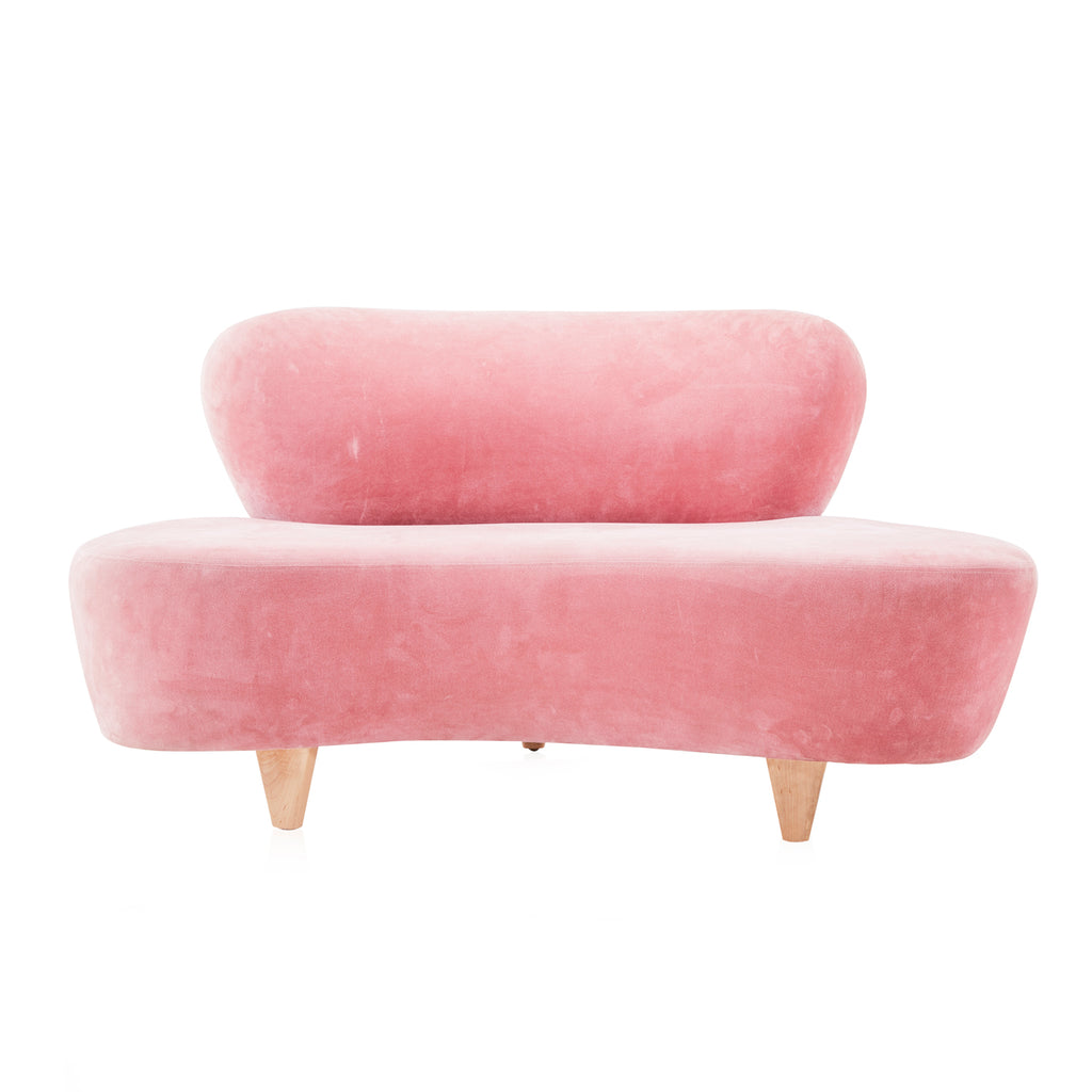 Details: Memphis-style pink painted wood frame love seat with (removable) grey cushion with pink piping