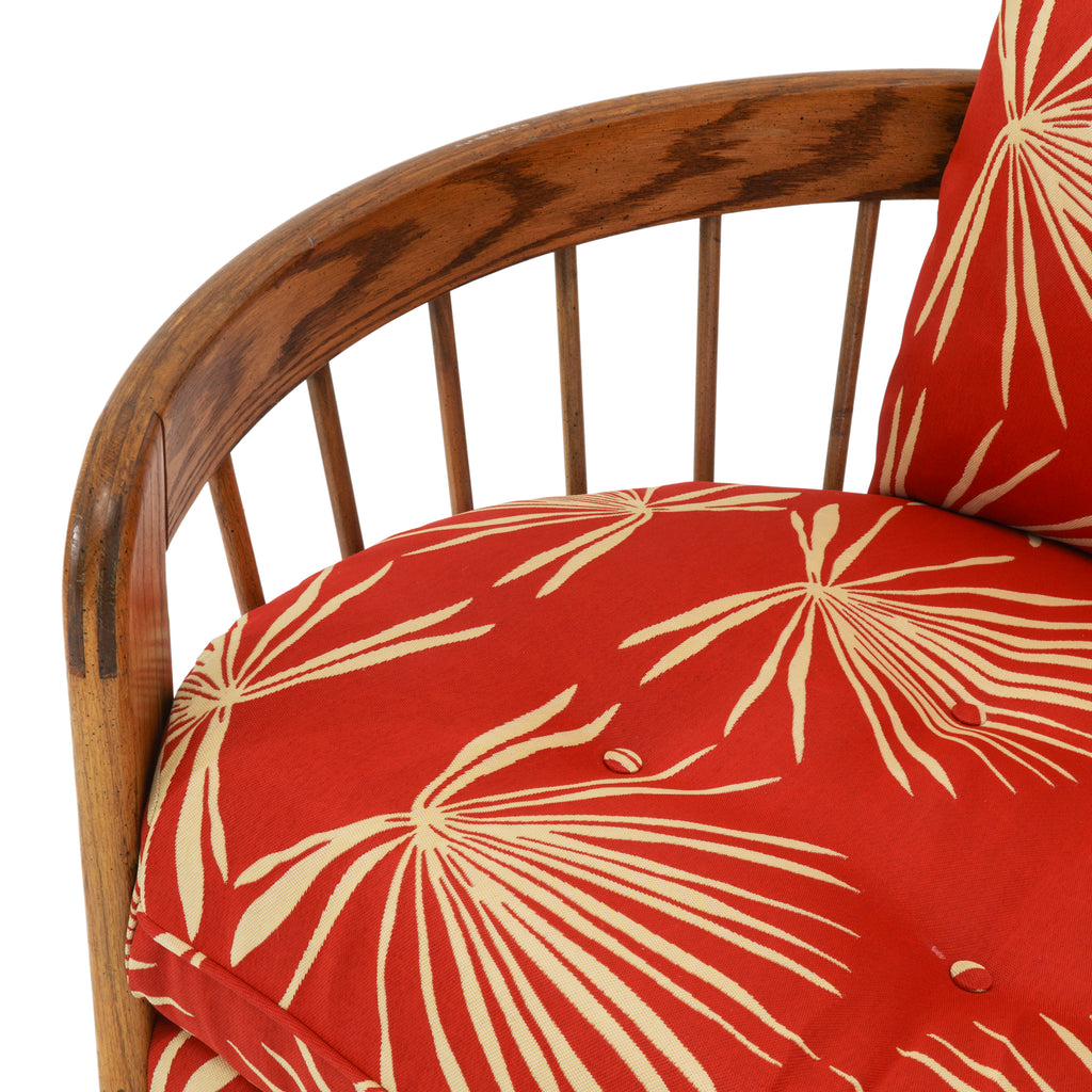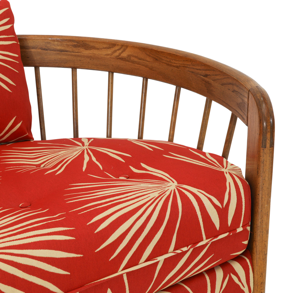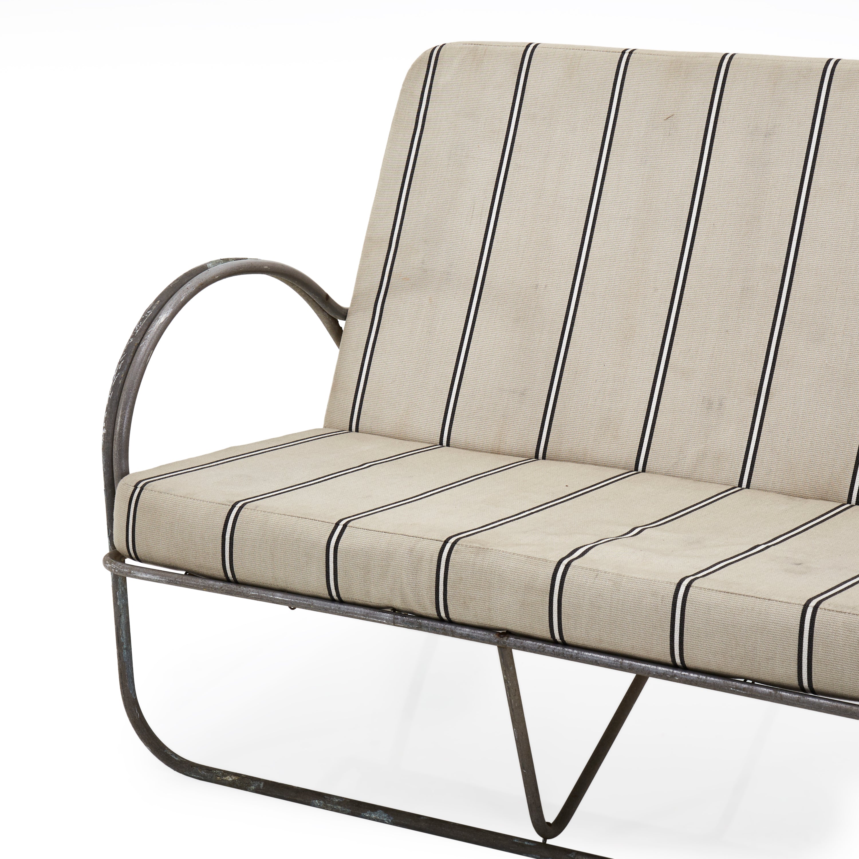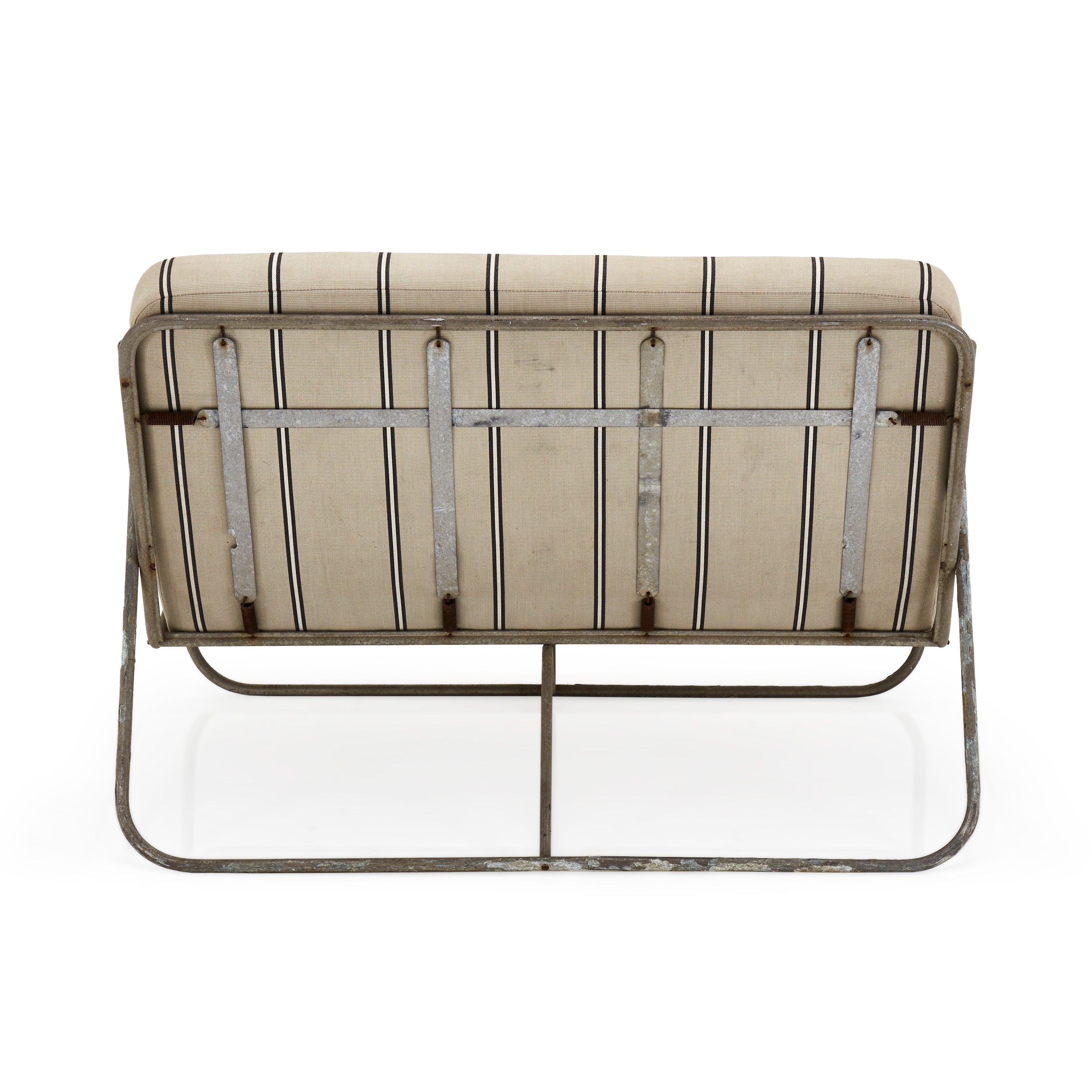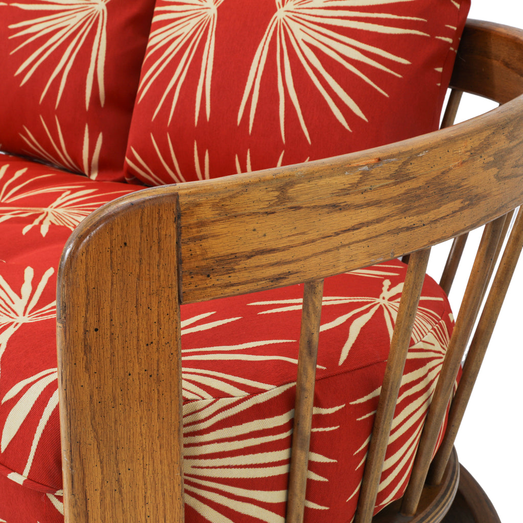 Details: Memphis-style pink painted wood frame love seat with (removable) grey cushion with pink piping