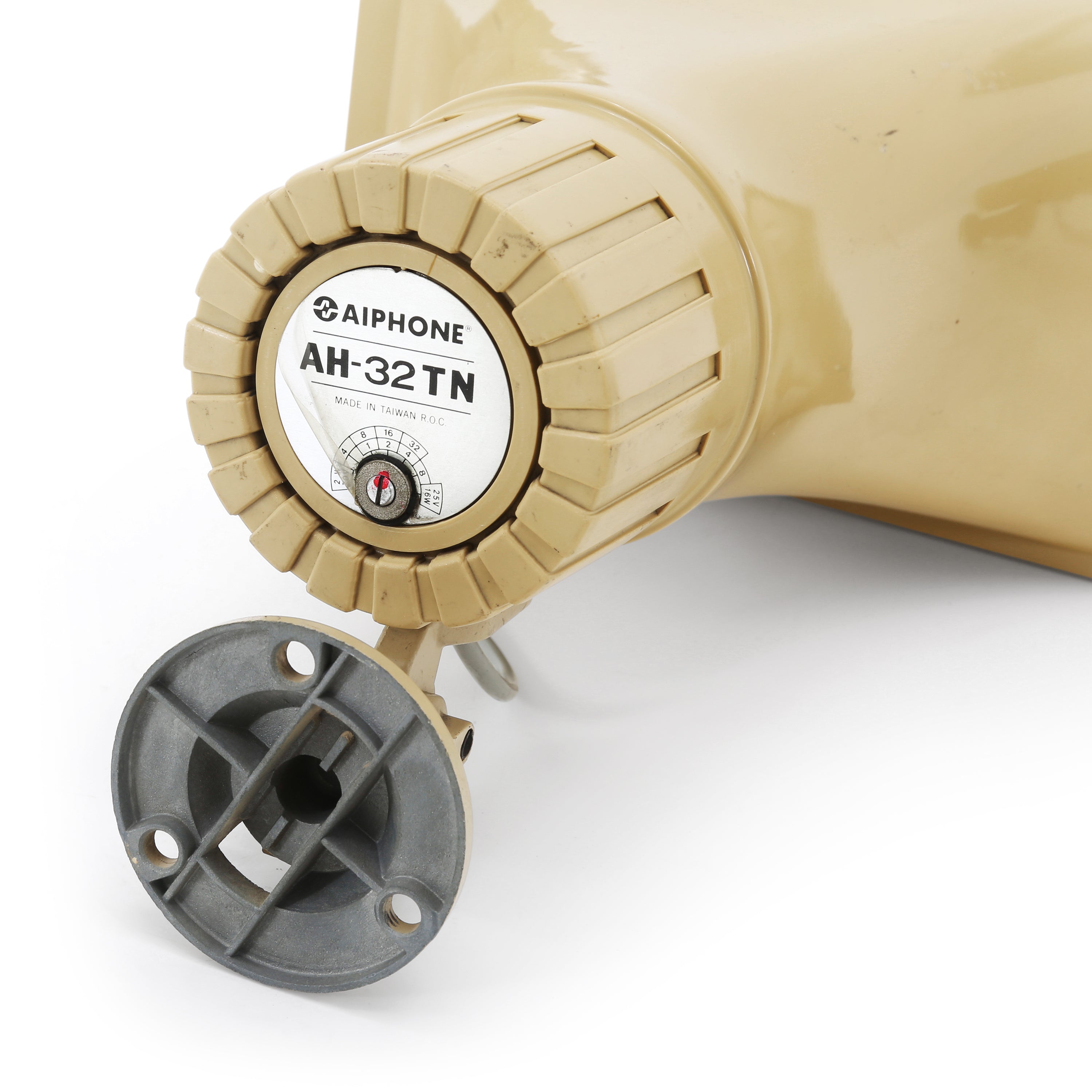 Description: Brown wood and cream radio and matching speaker set with rotating dials. Body is constructed of dark wood and cream plastic components. Dimensions: 9"...