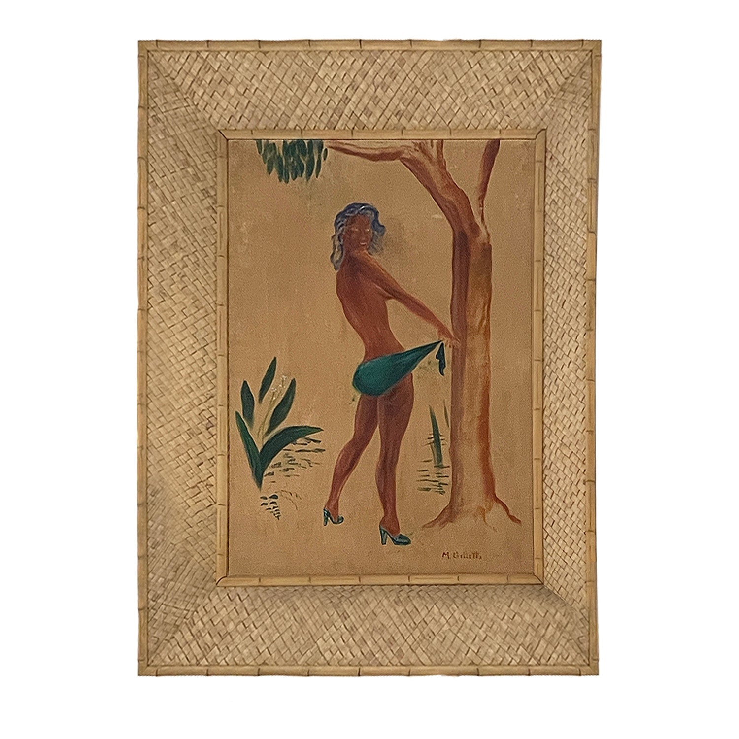 Details: Wicker framed painted artwork of subject facing away from viewer next to a treeDimensions: 36" H X 46" W