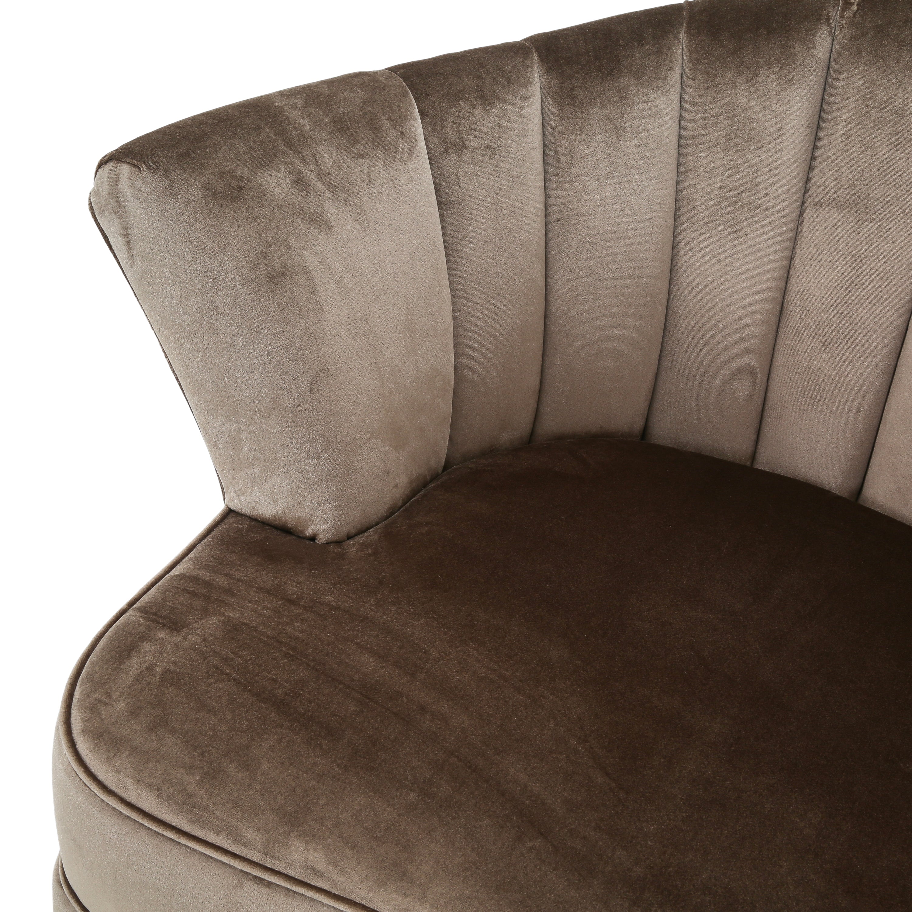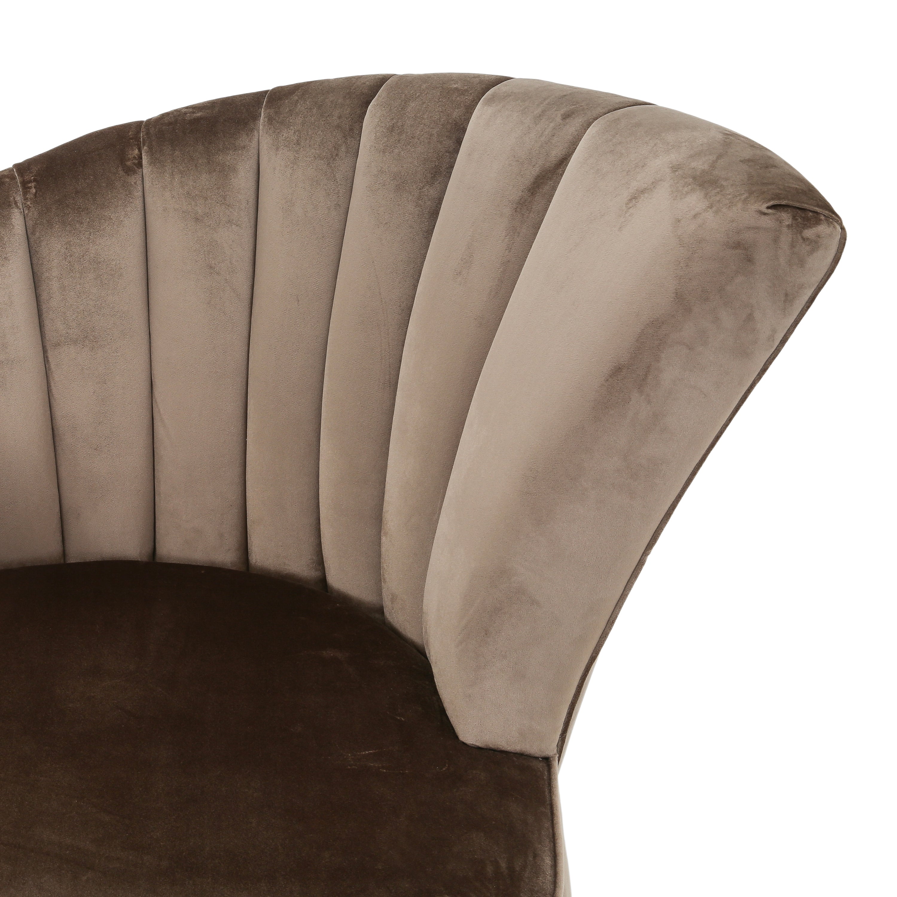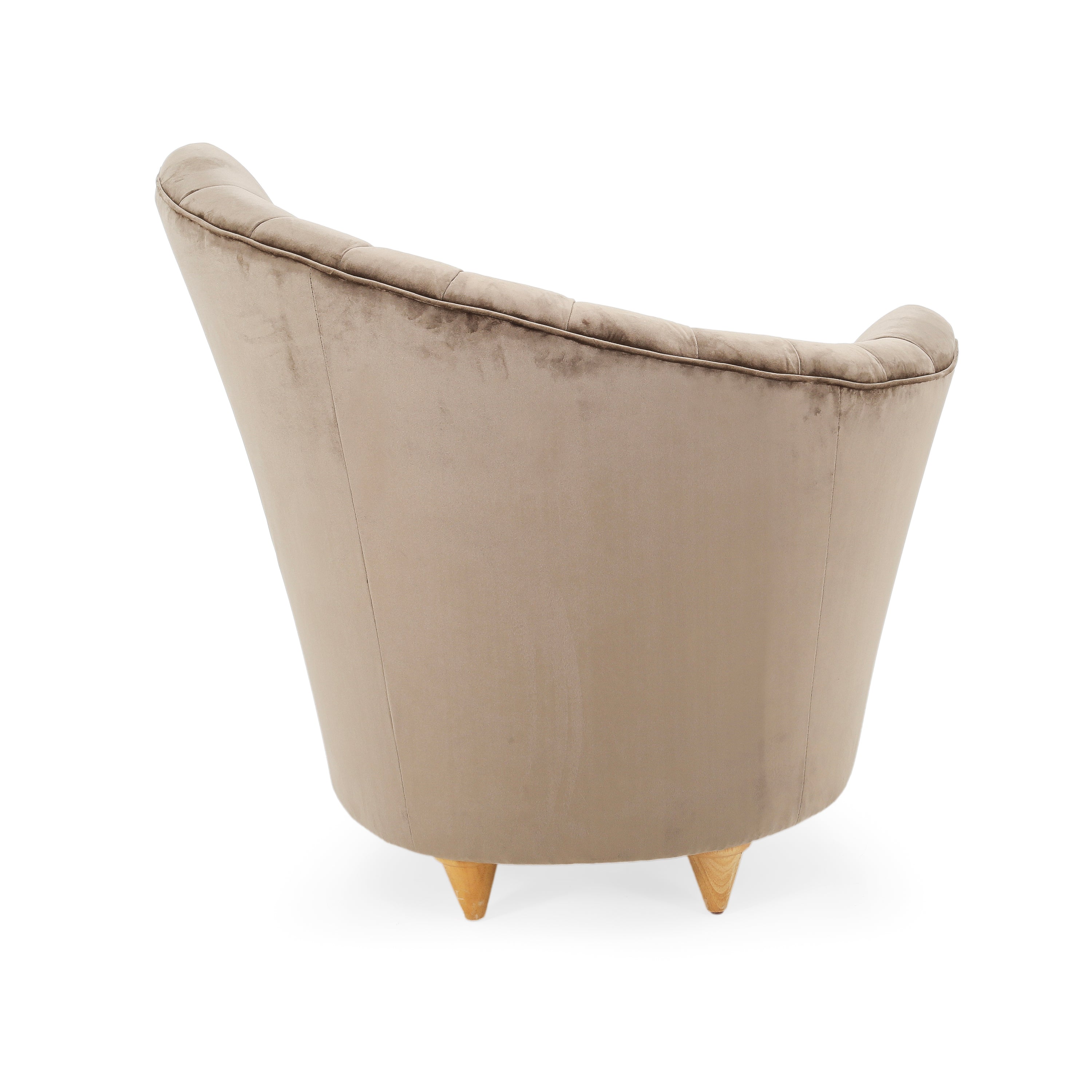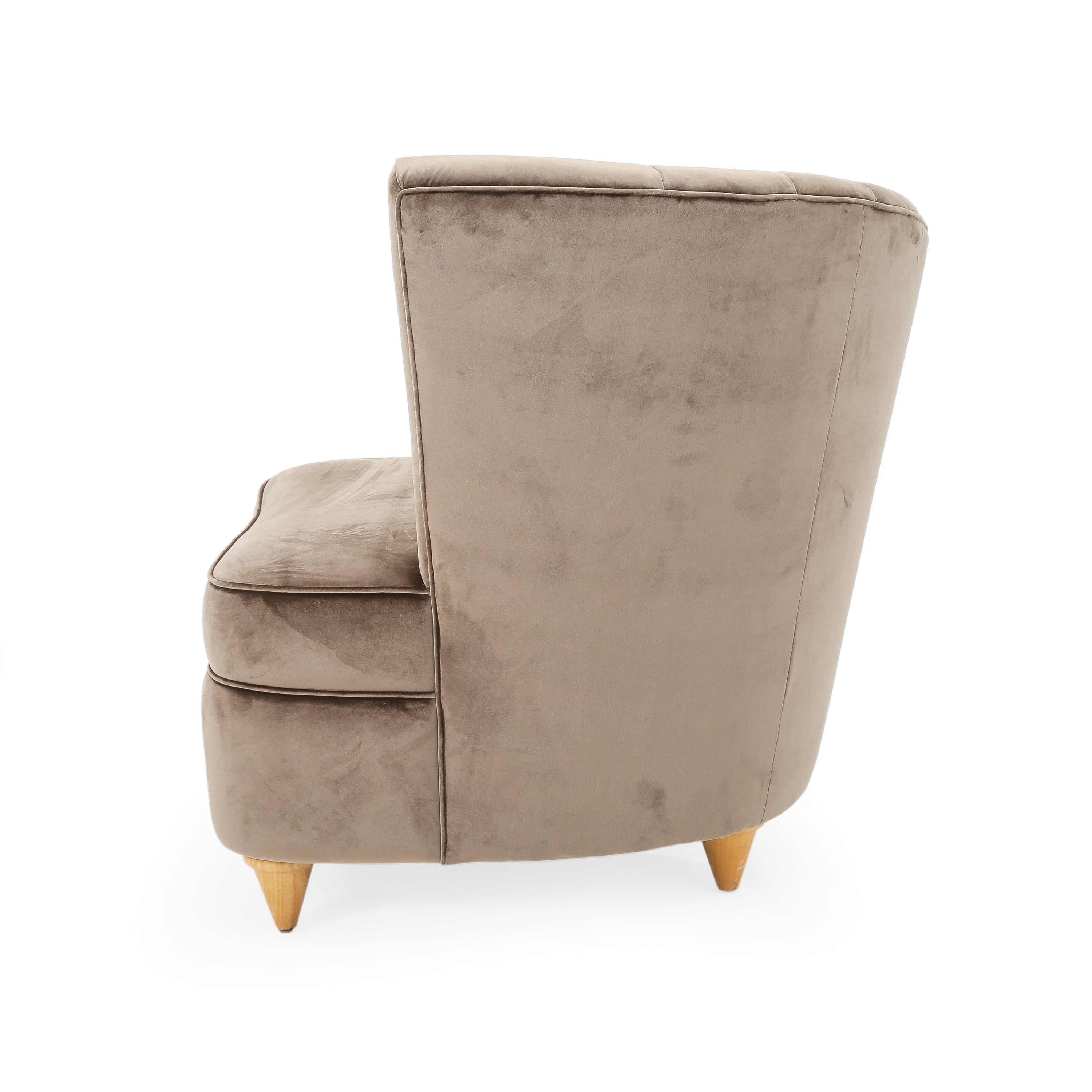 Details: Tan velvet deco lounge chair with lightwood legs. Dimensions: 40" H x 40" W x 30" D Quantity: 1