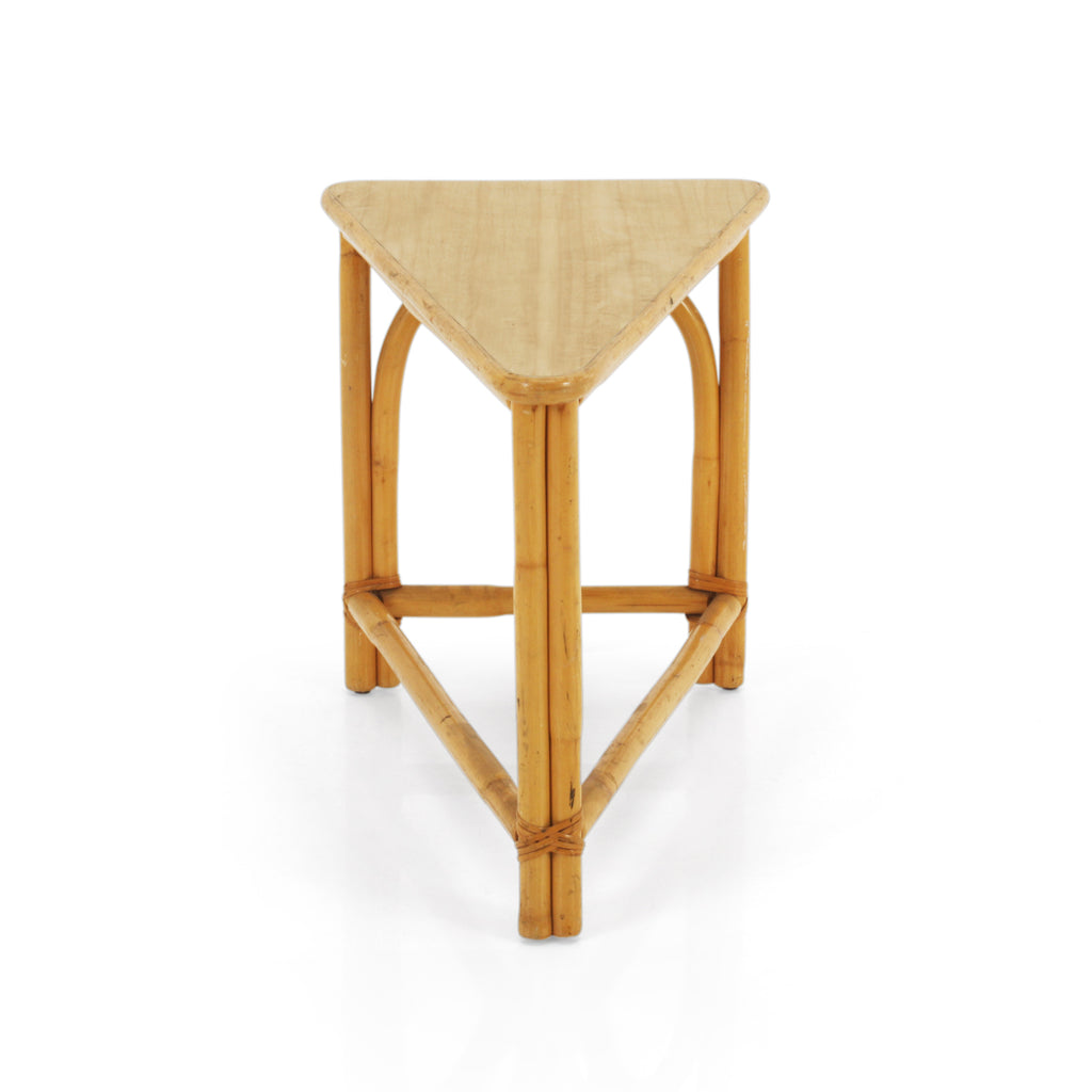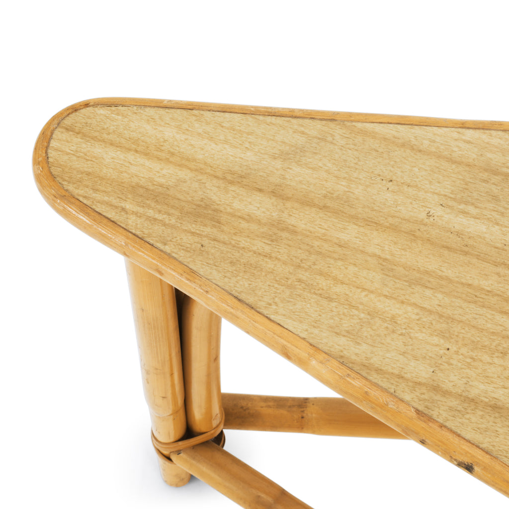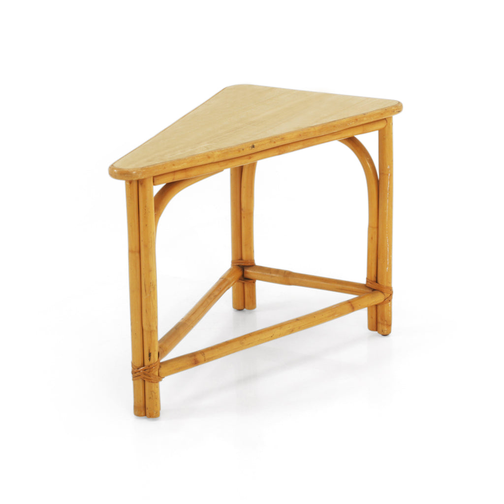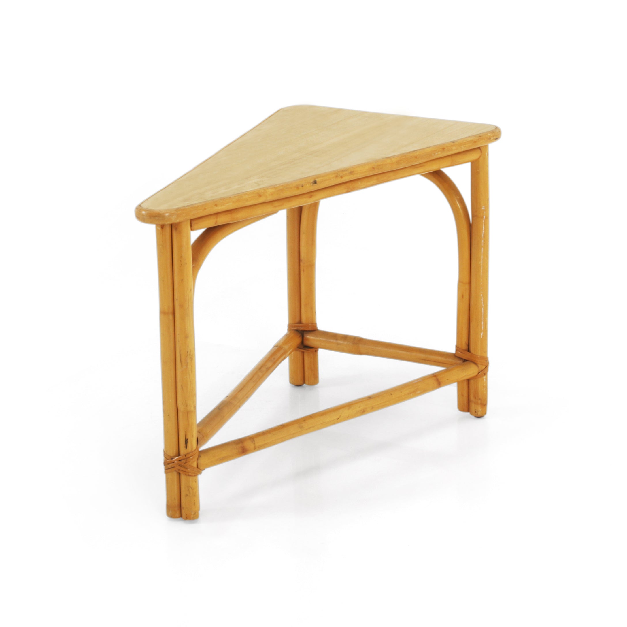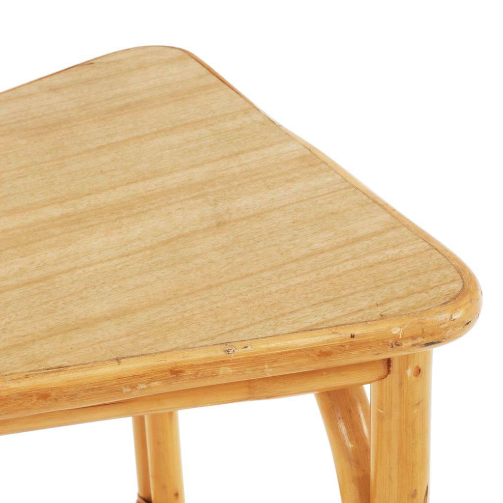 Details: Small bamboo side tables with woodgrain top. Dimensions: 21" H x 17.5" W x 31" D Quantity: 2