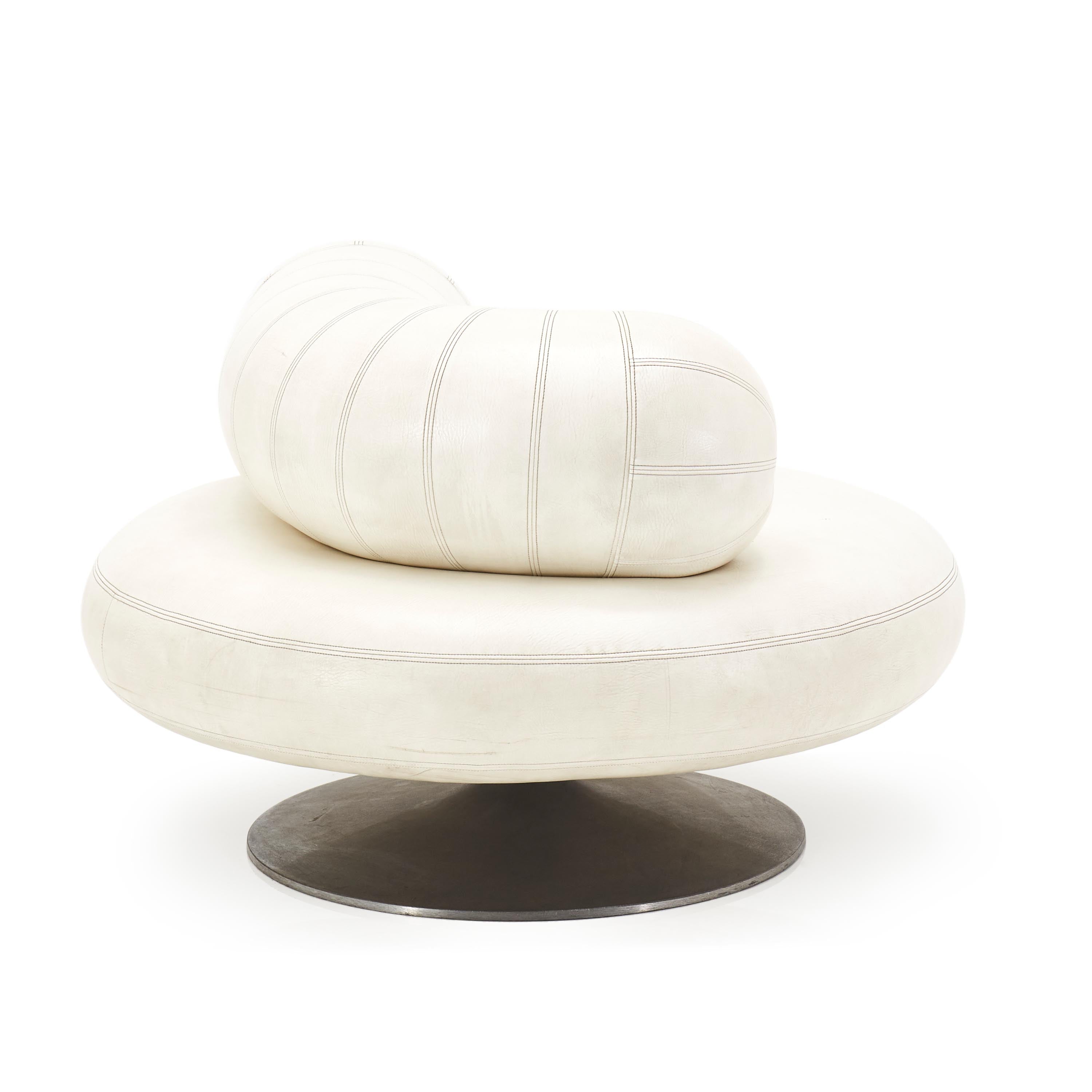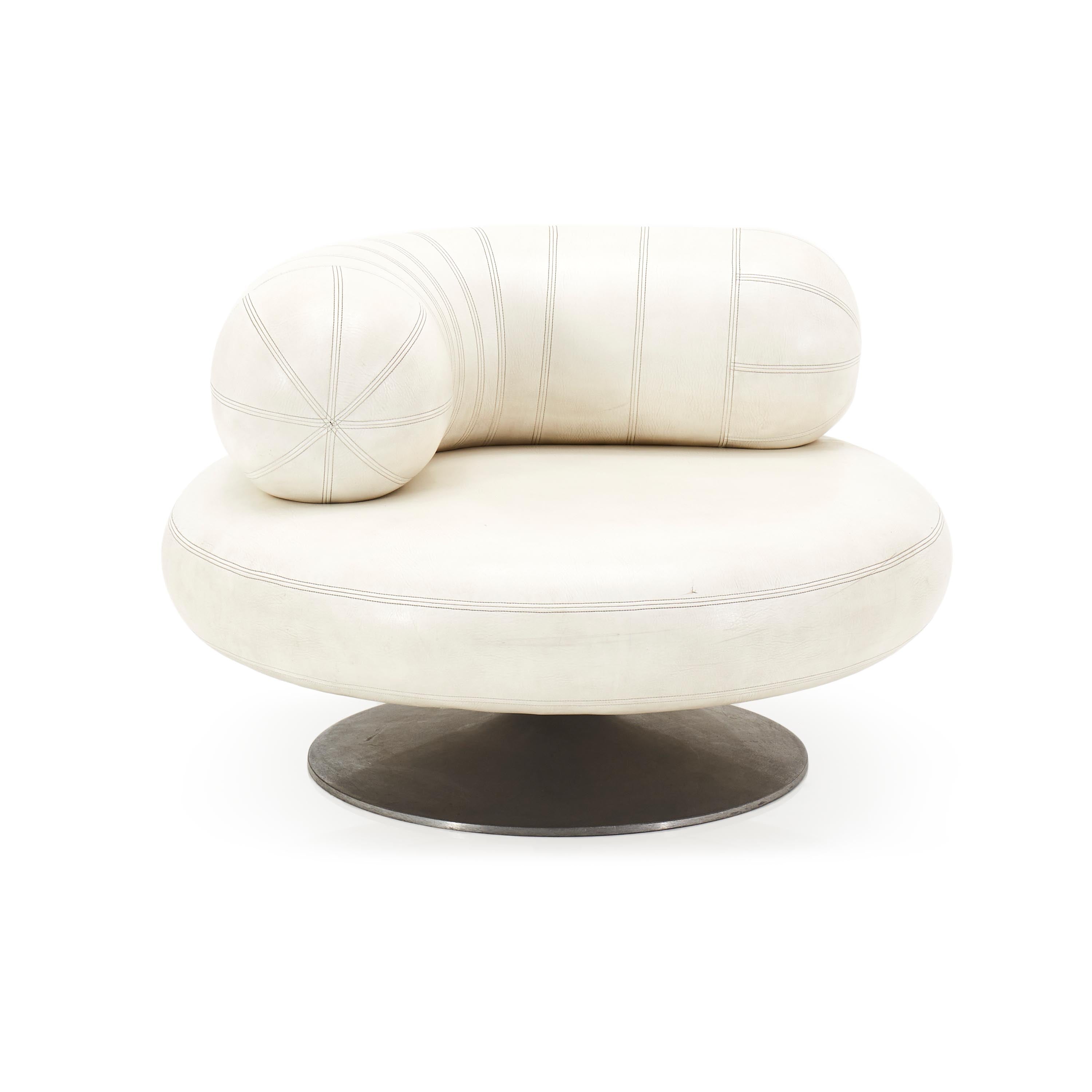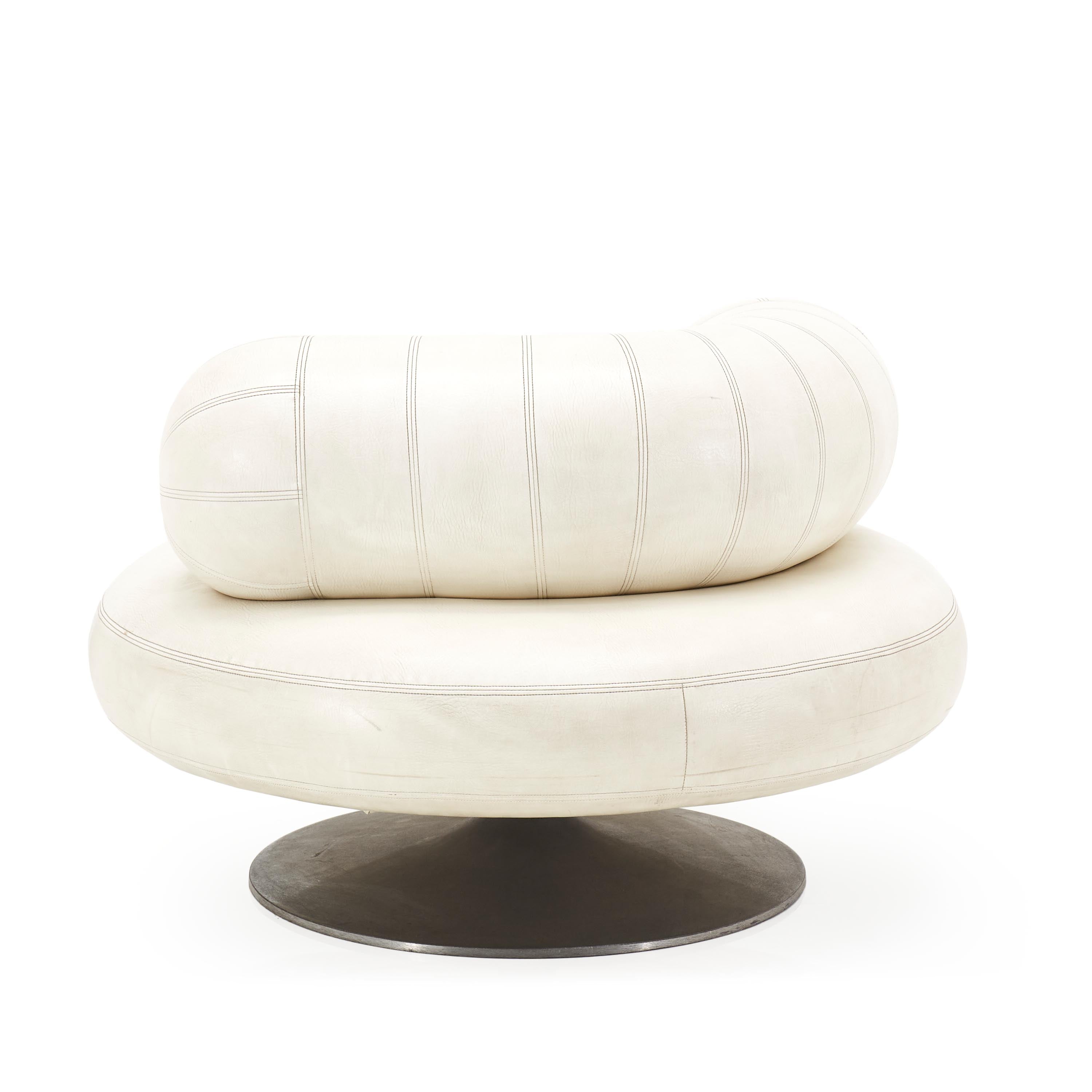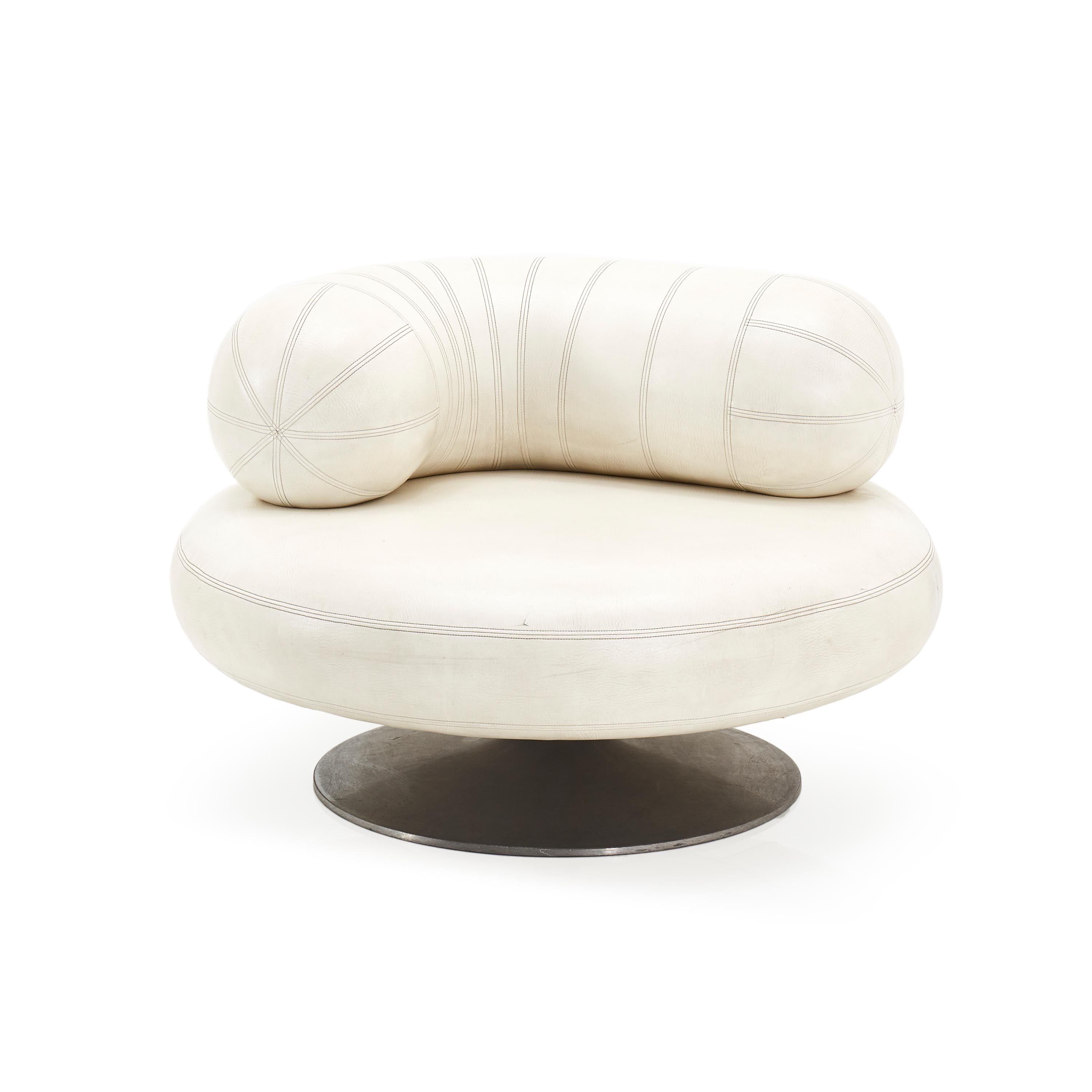 Details: White leather mod pearl chair with tubular back support cushion and round silver base Dimensions: 30" H x 43" W x 43" D