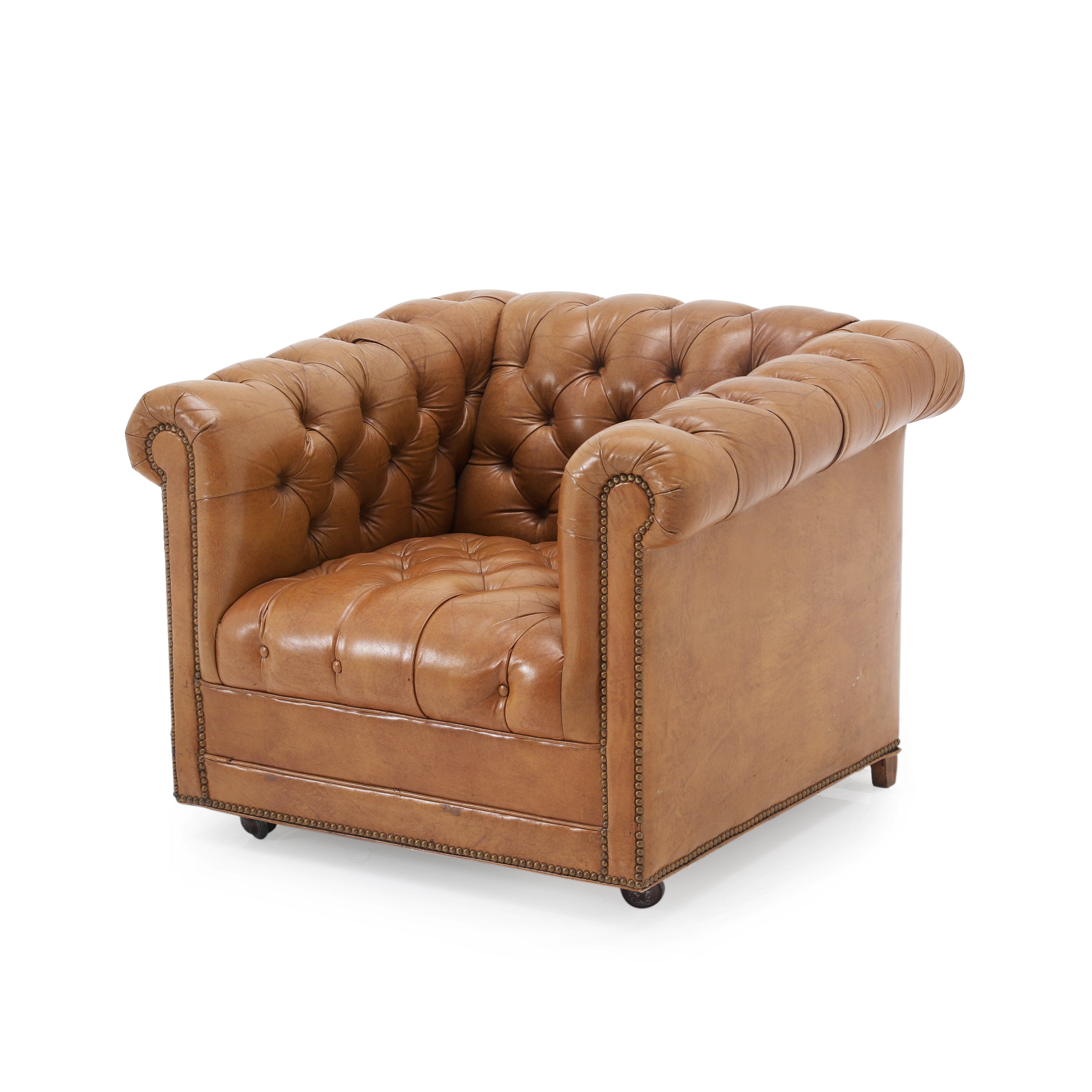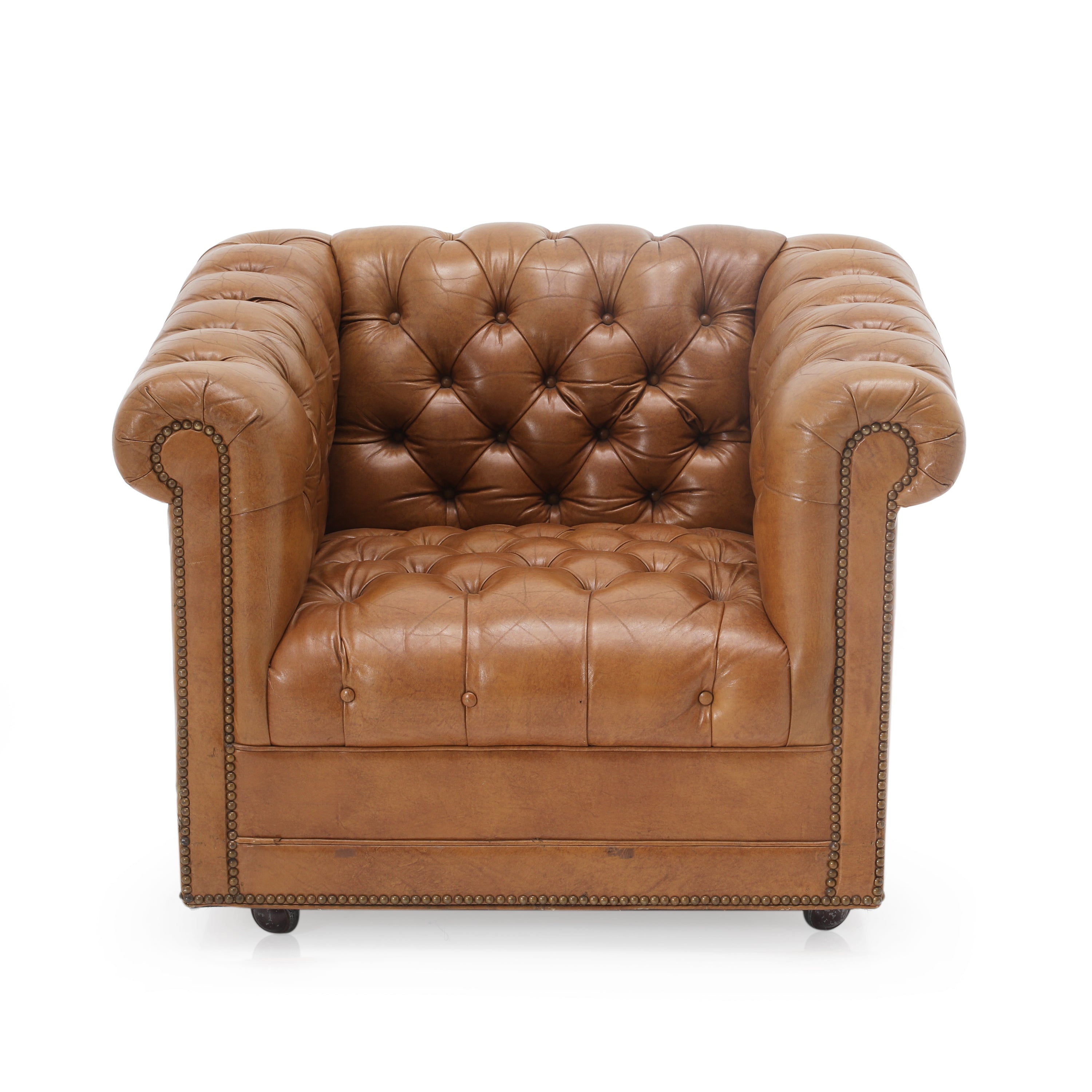 Details: Tan leather chesterfield arm chair with brown rivets. Matching sofa available (rented separately). Dimensions: 30" H x 37" W x 34" D