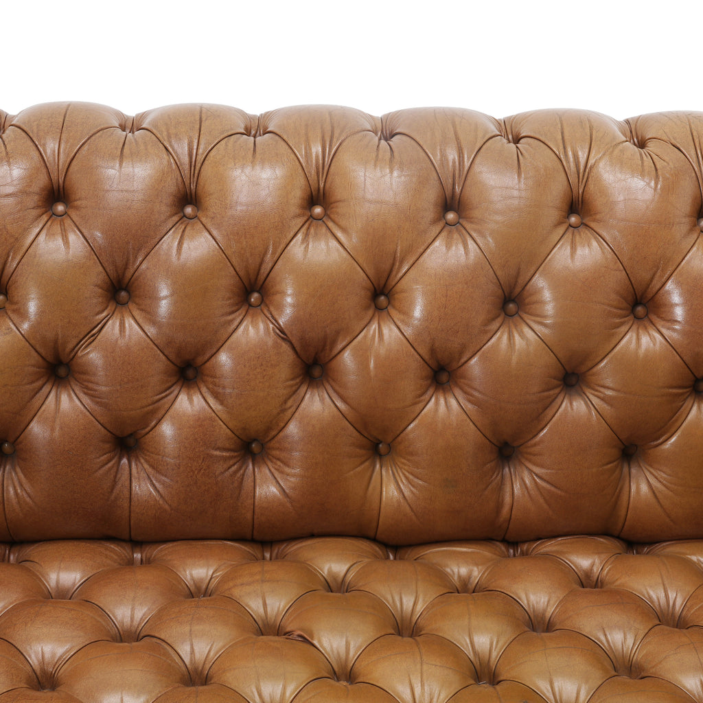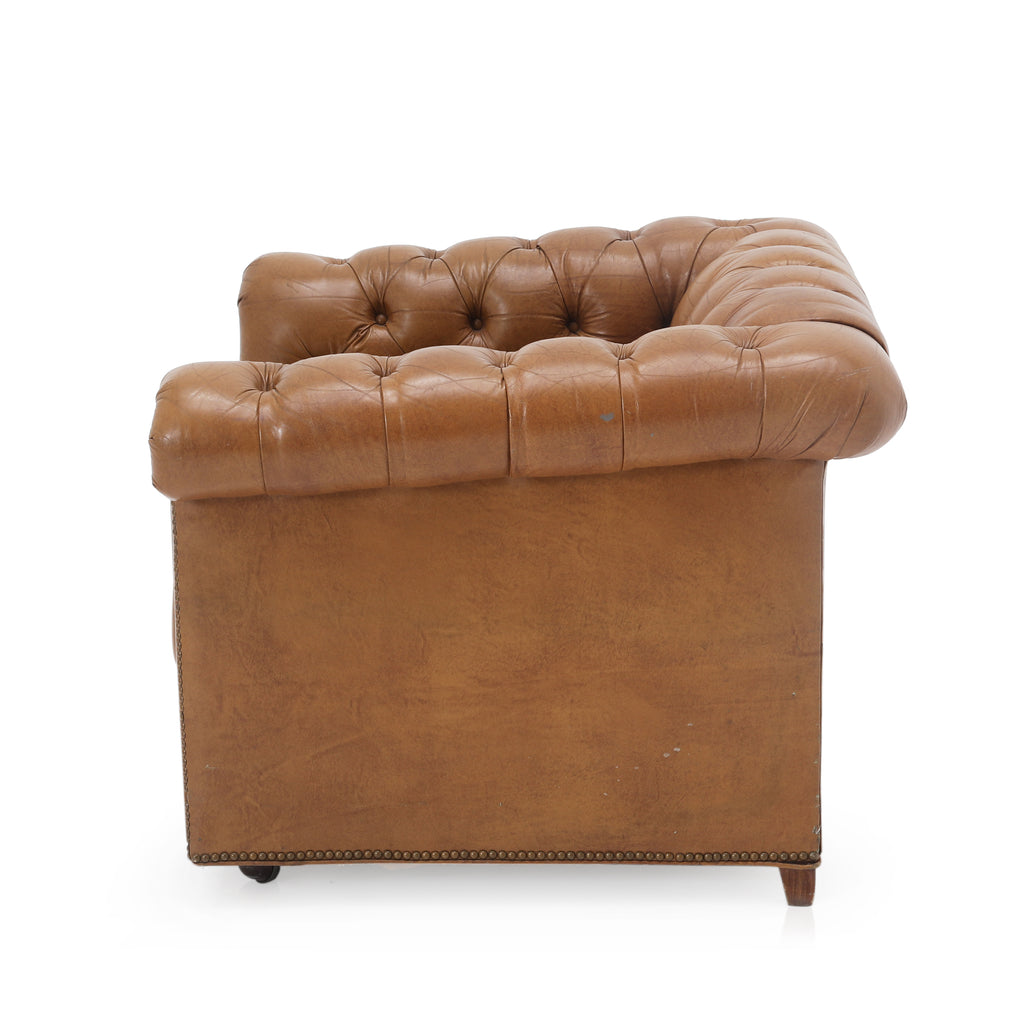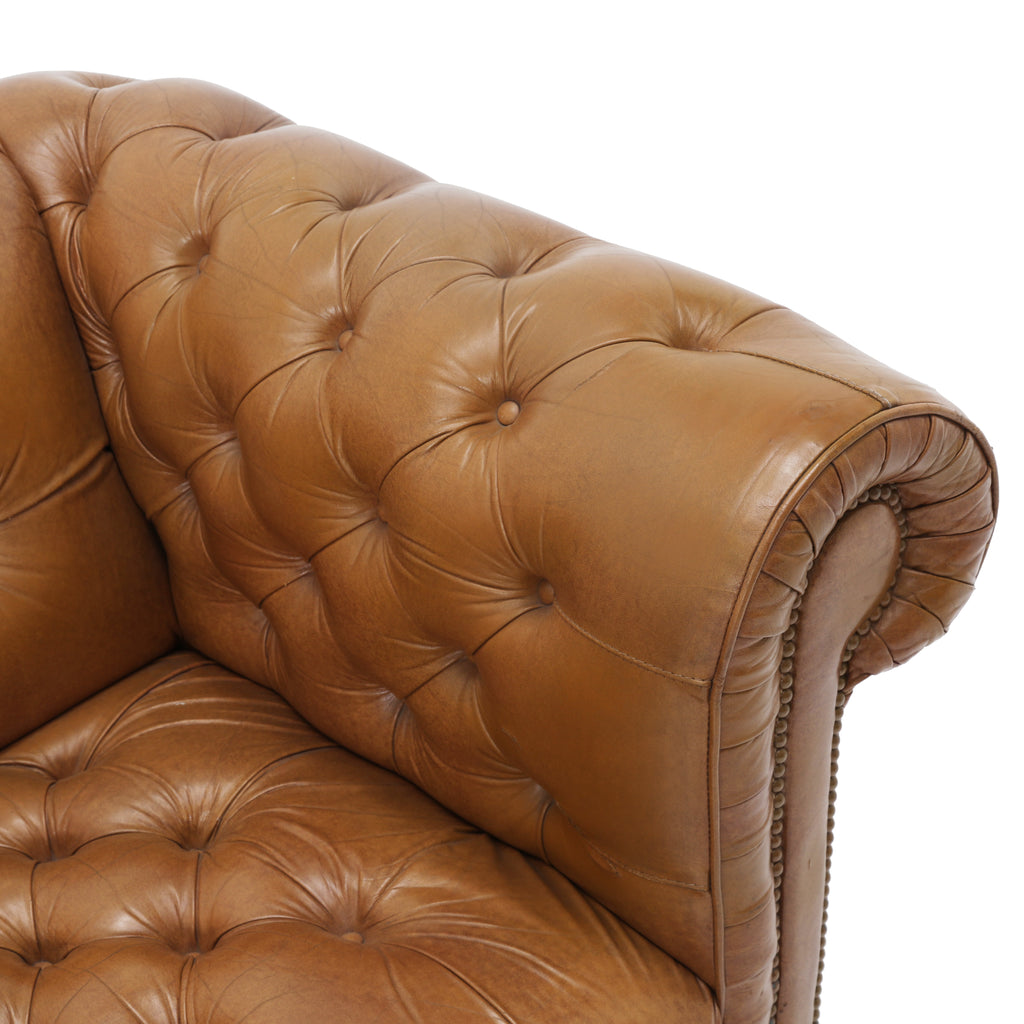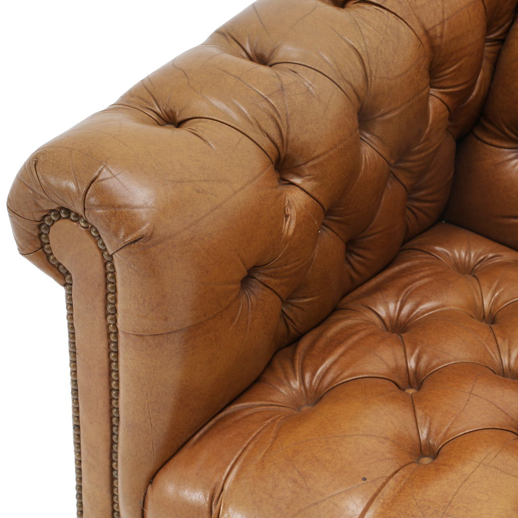 Details: Tan leather chesterfield sofa with brown rivets throughout. Matching chair available (rented separately). Dimensions: 30" H x 92" W x 34" D