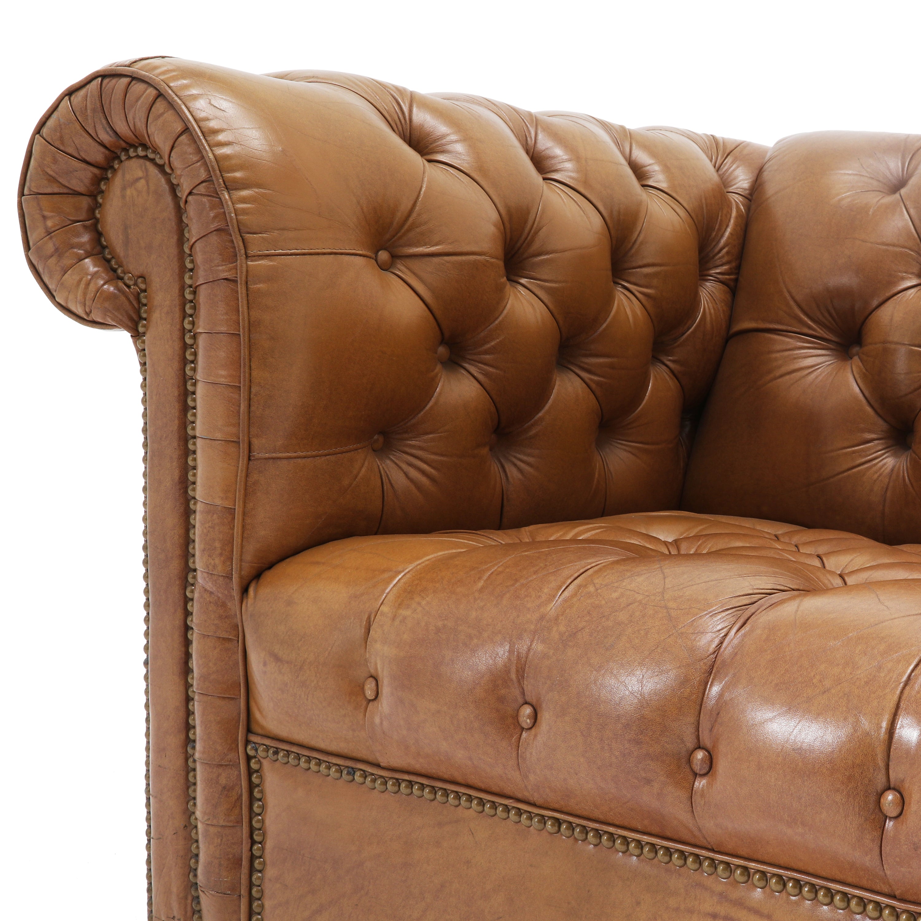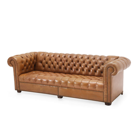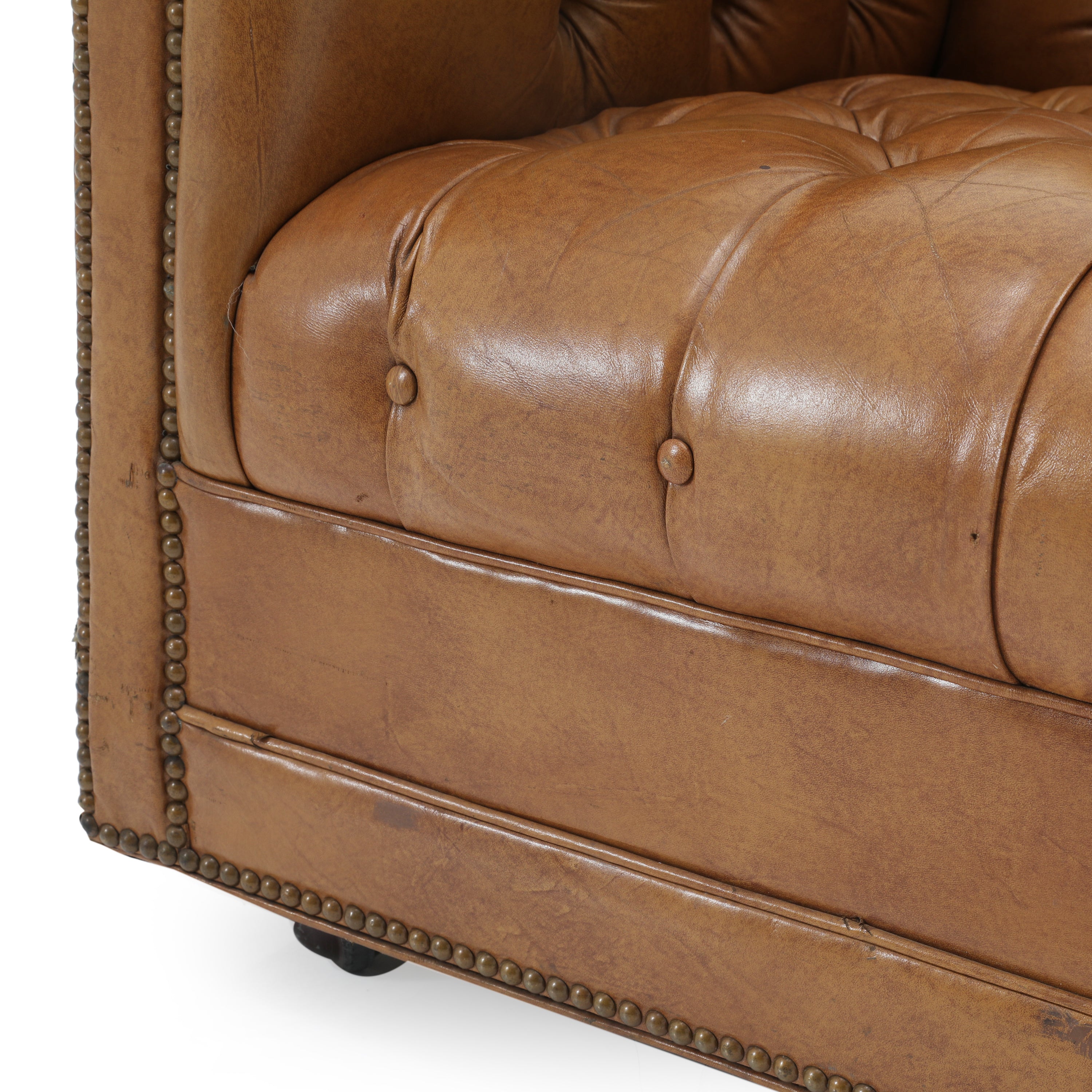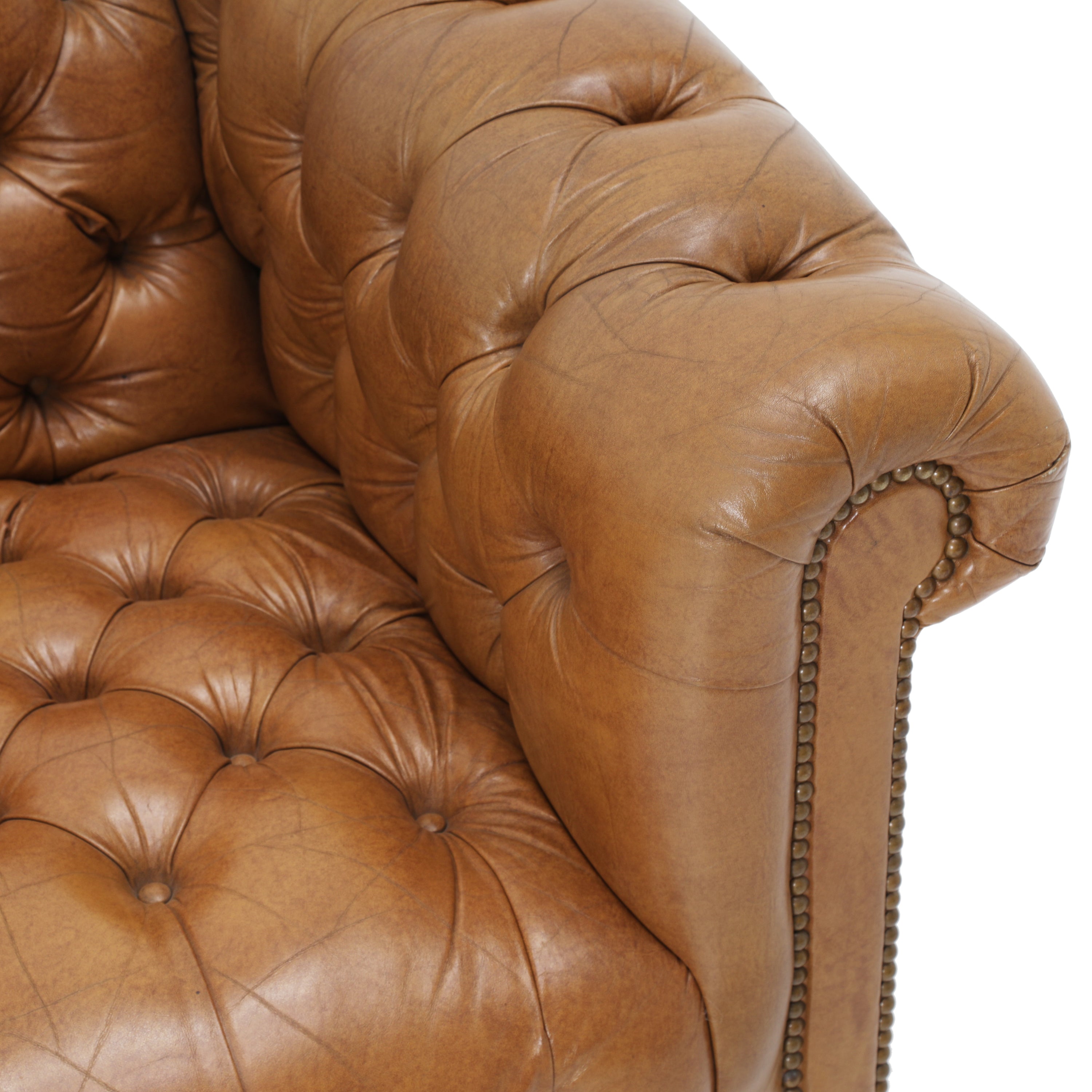 Details: Tan leather chesterfield sofa with brown rivets throughout. Matching chair available (rented separately). Dimensions: 30" H x 92" W x 34" D