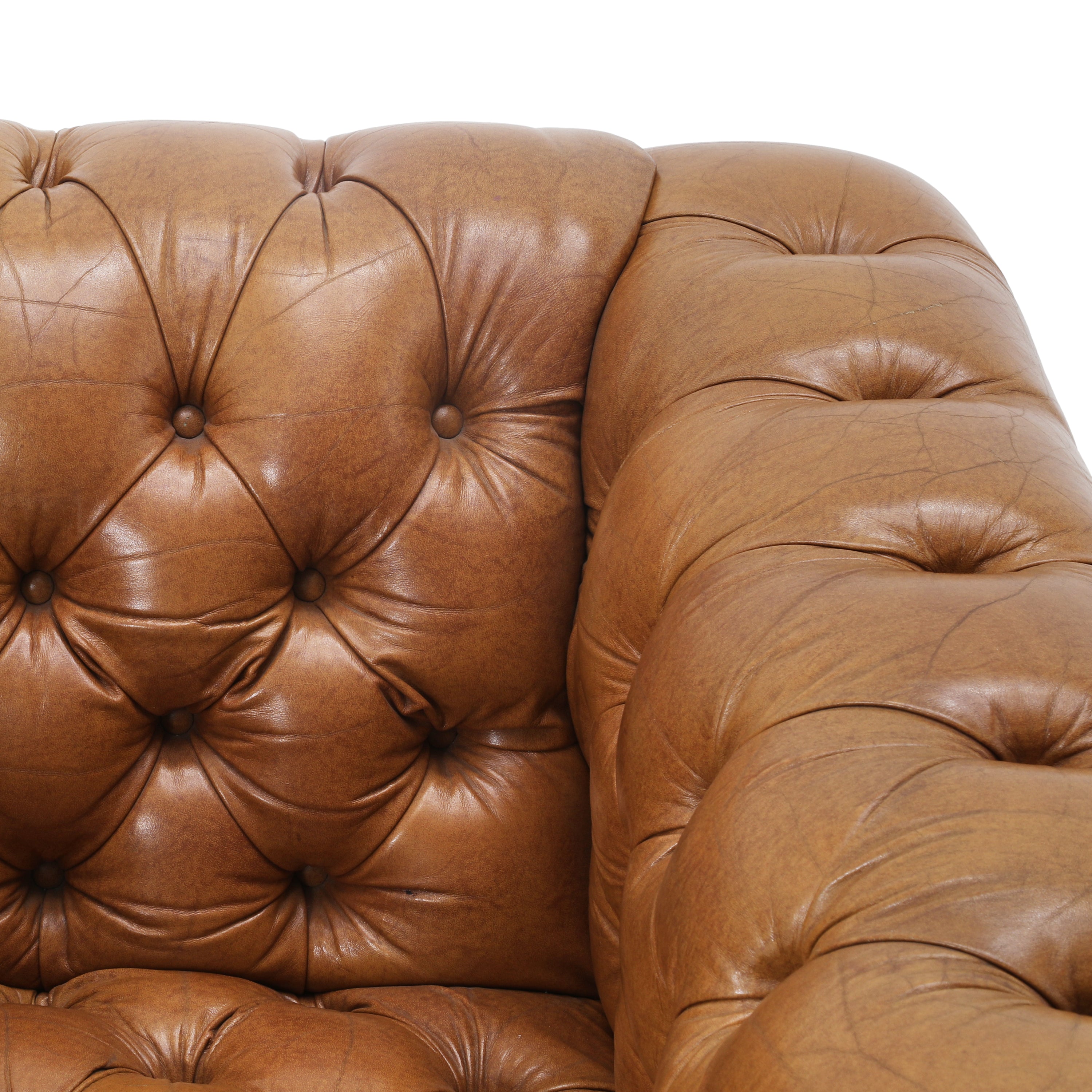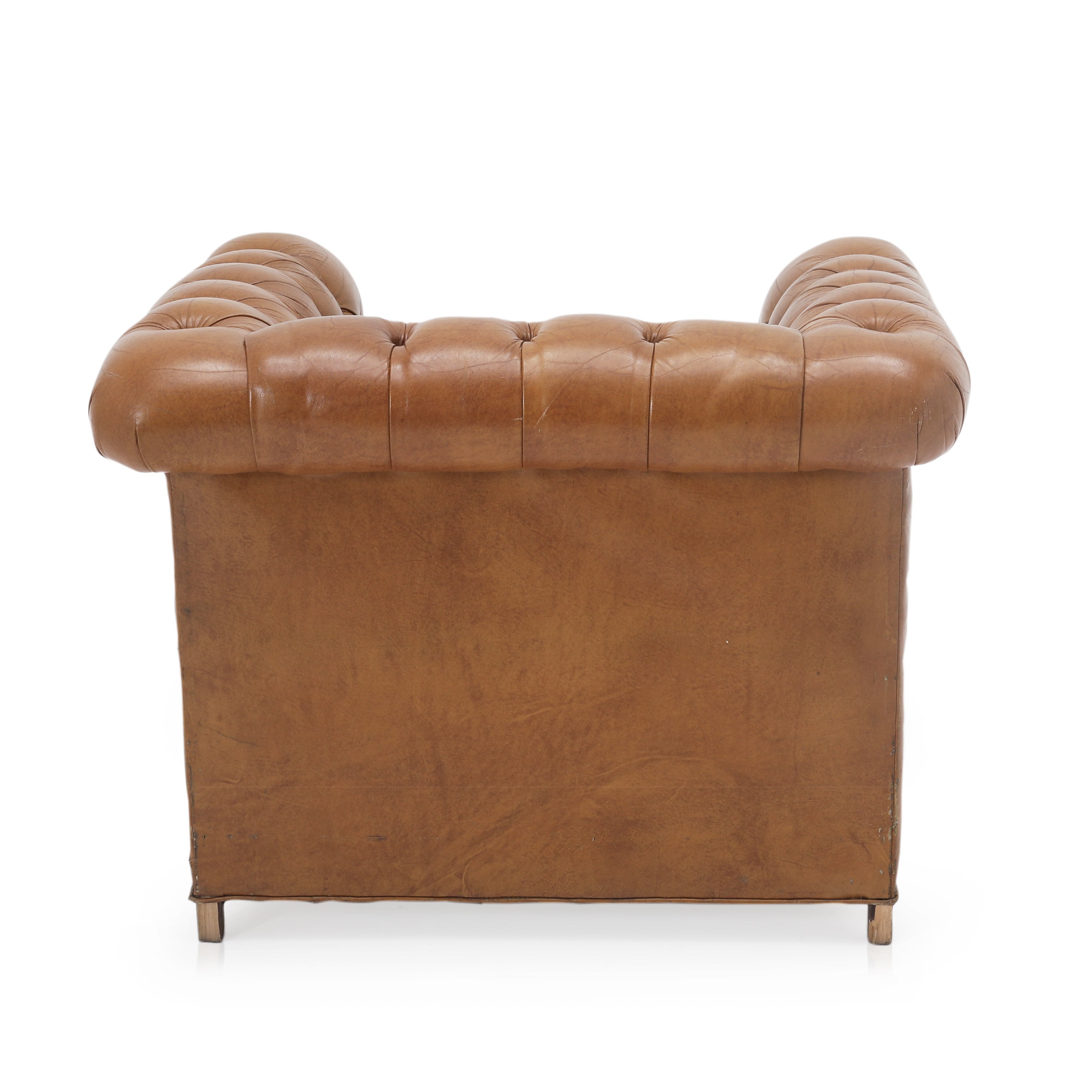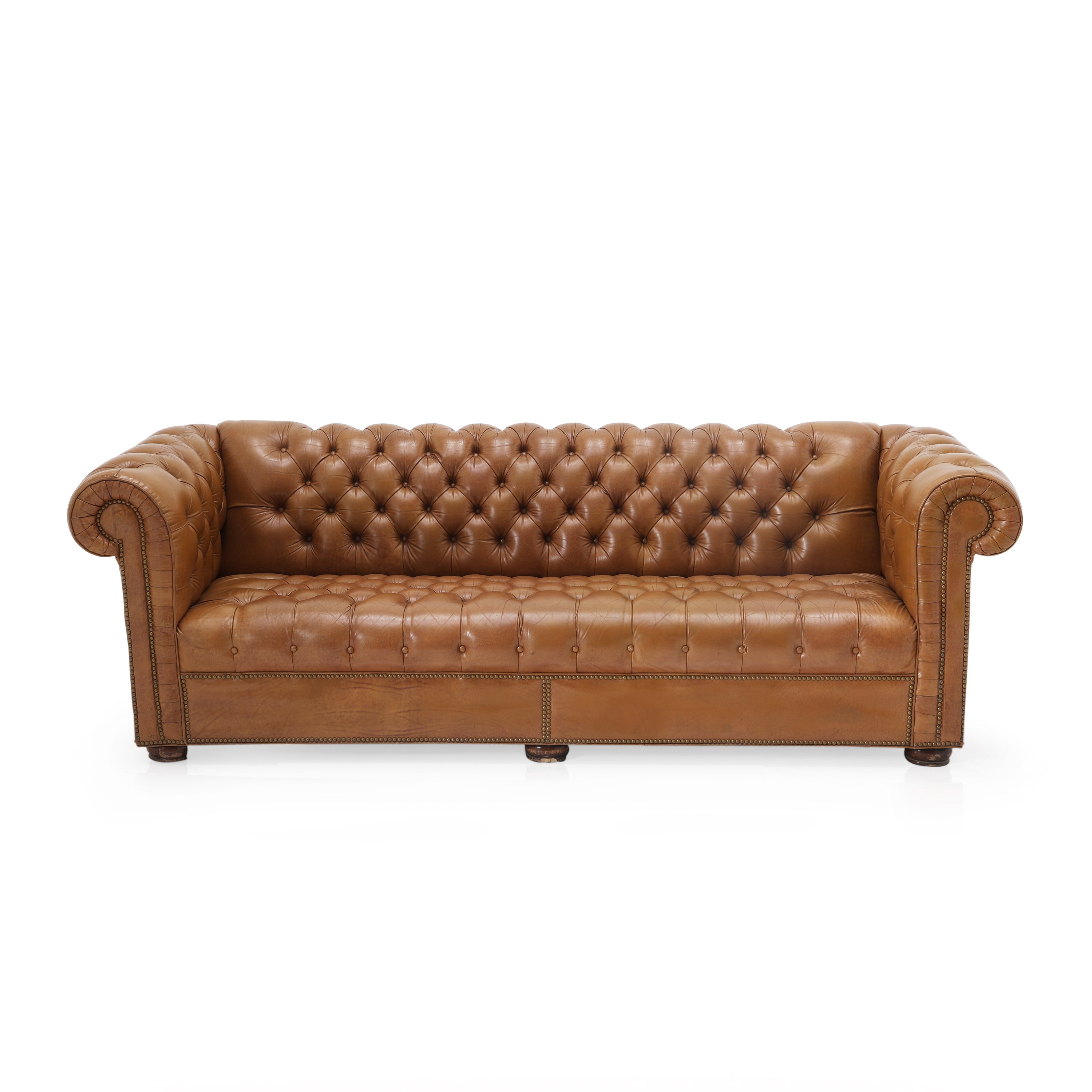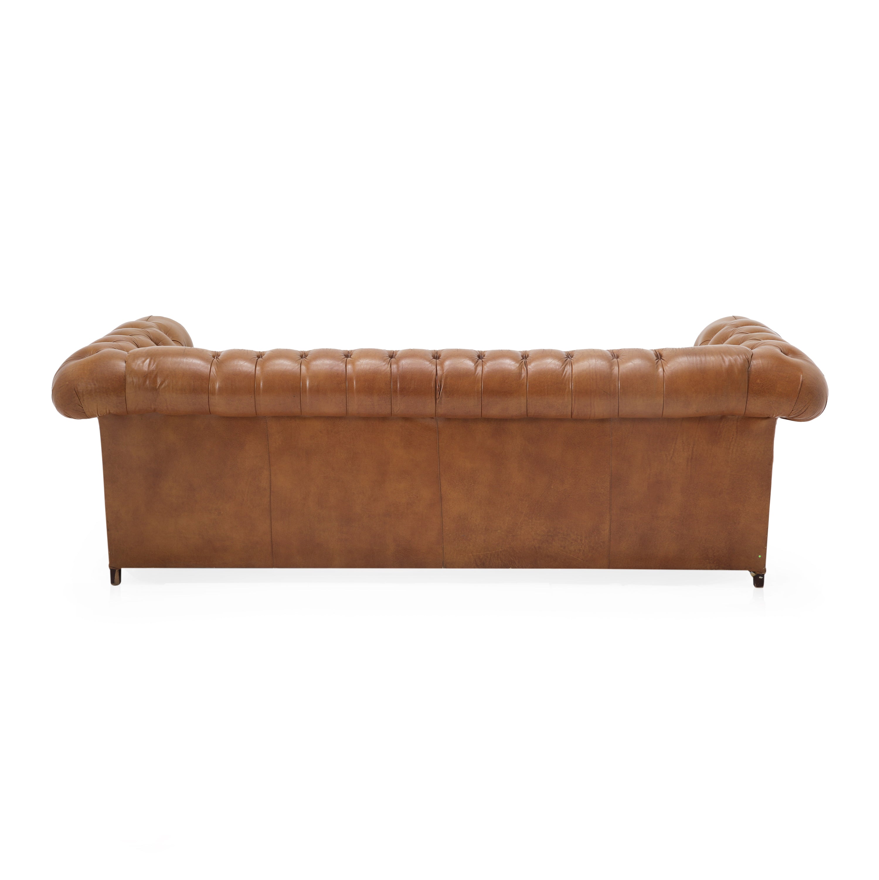Details: Tan leather chesterfield sofa with brown rivets throughout. Matching chair available (rented separately). Dimensions: 30" H x 92" W x 34" D