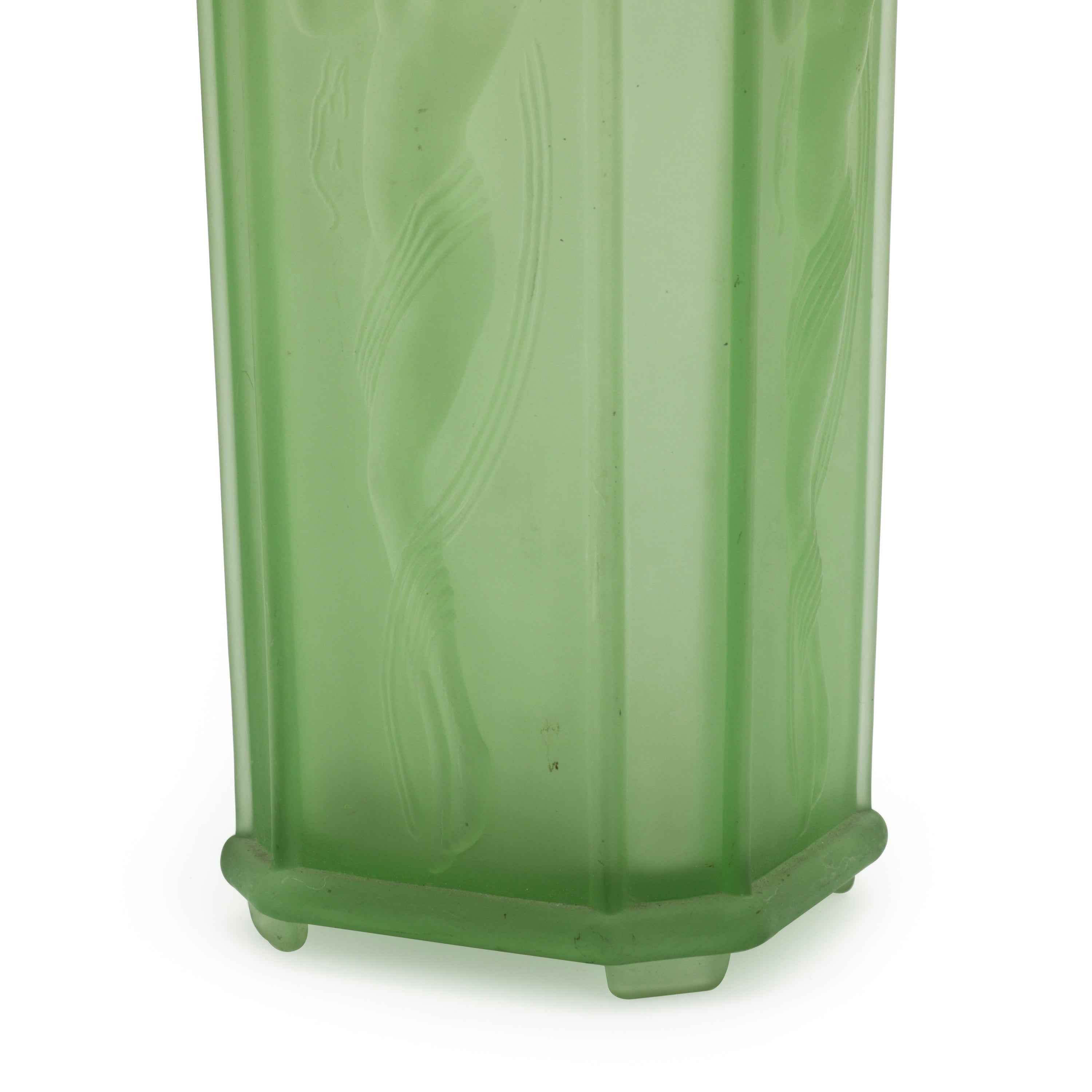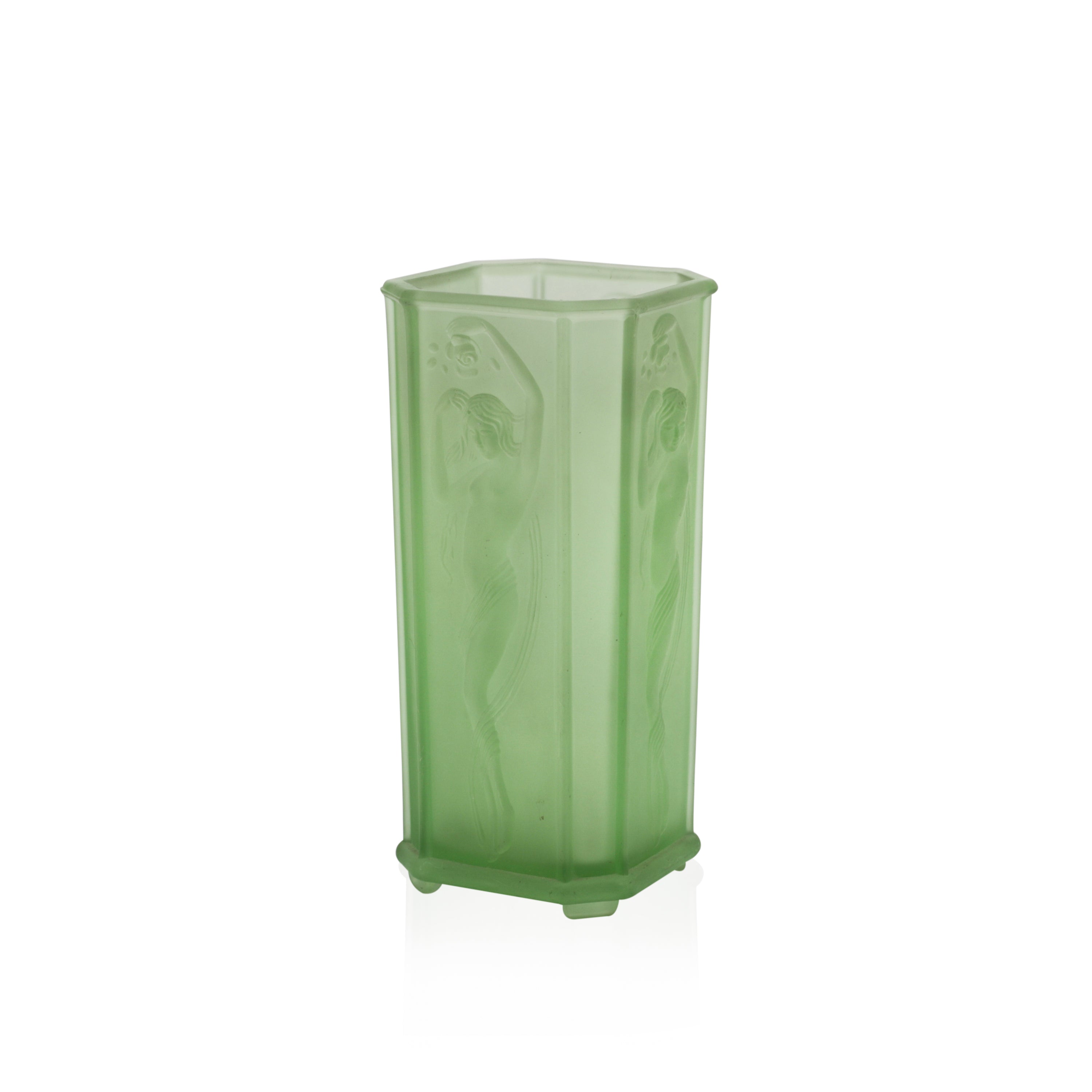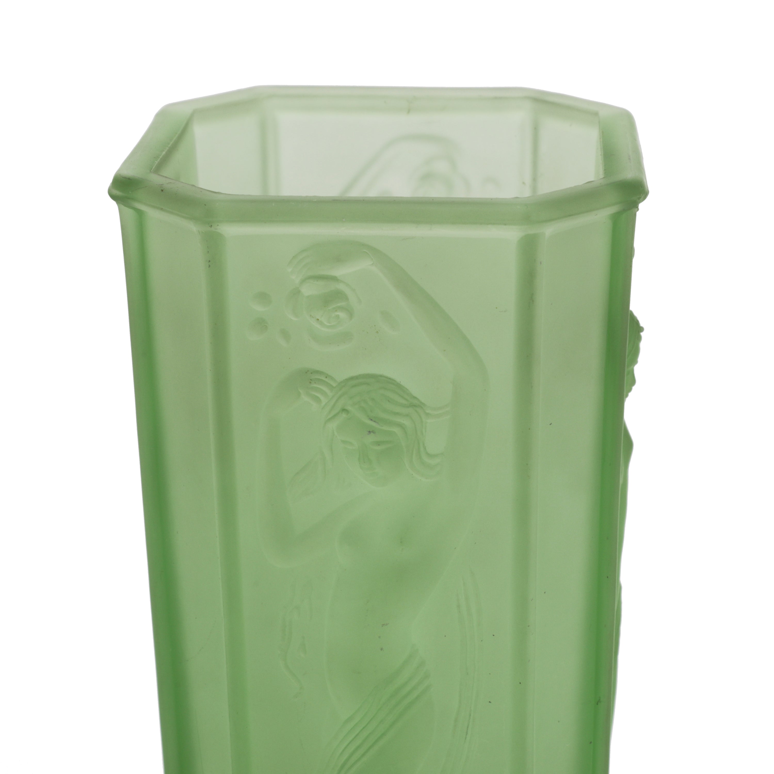 Details Frosted glass vase with embossed female figurine. Dimensions: 9" H x 4" W x 4" D