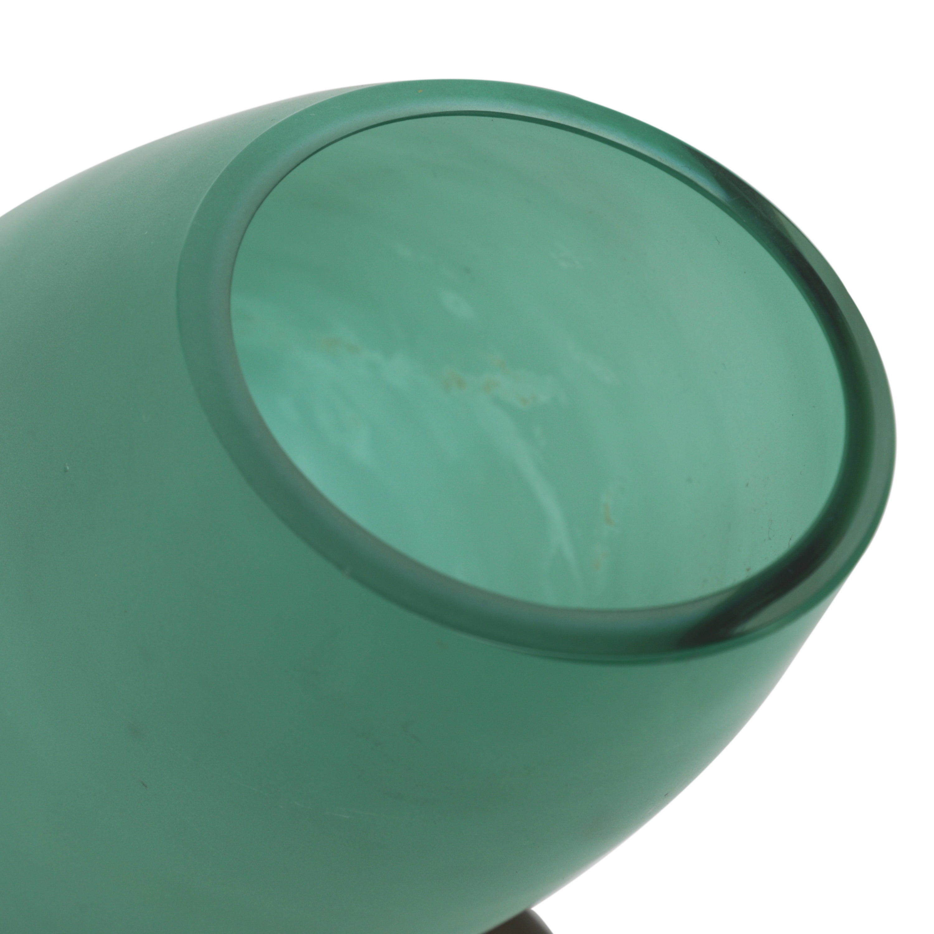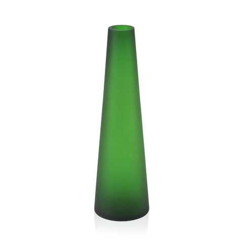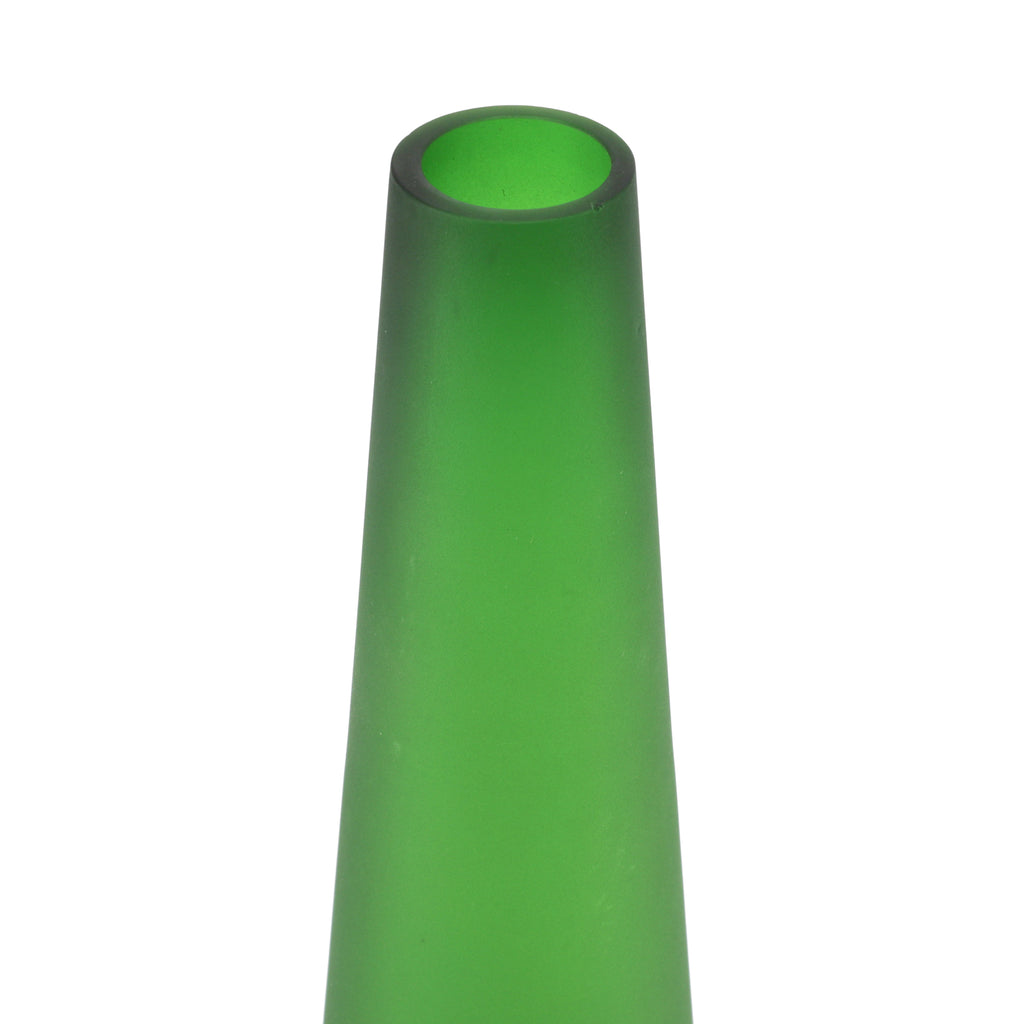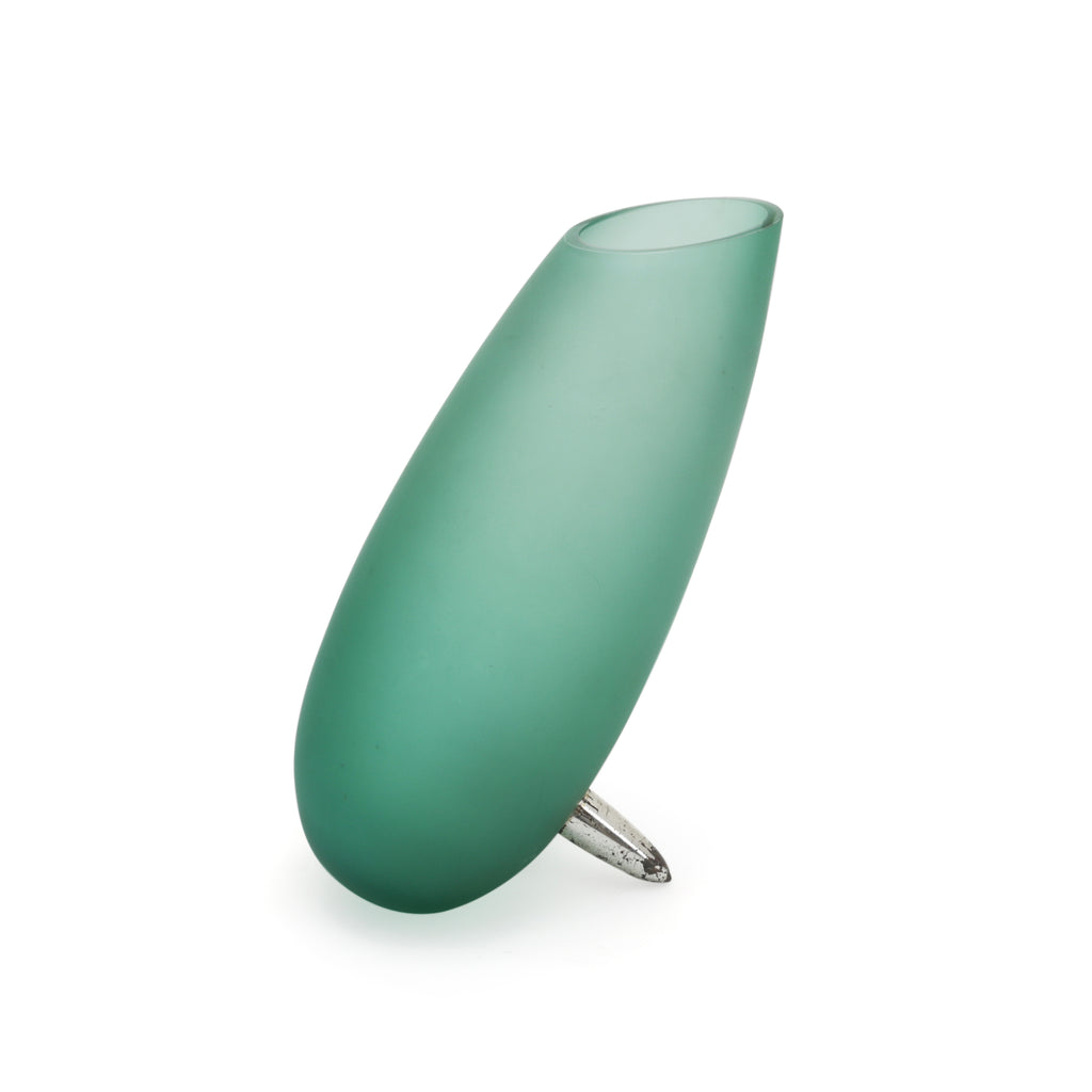 Details: Slanted green vase with frosted exterior and two metal legs. Dimensions: 10" H x 5" W x 8" D
